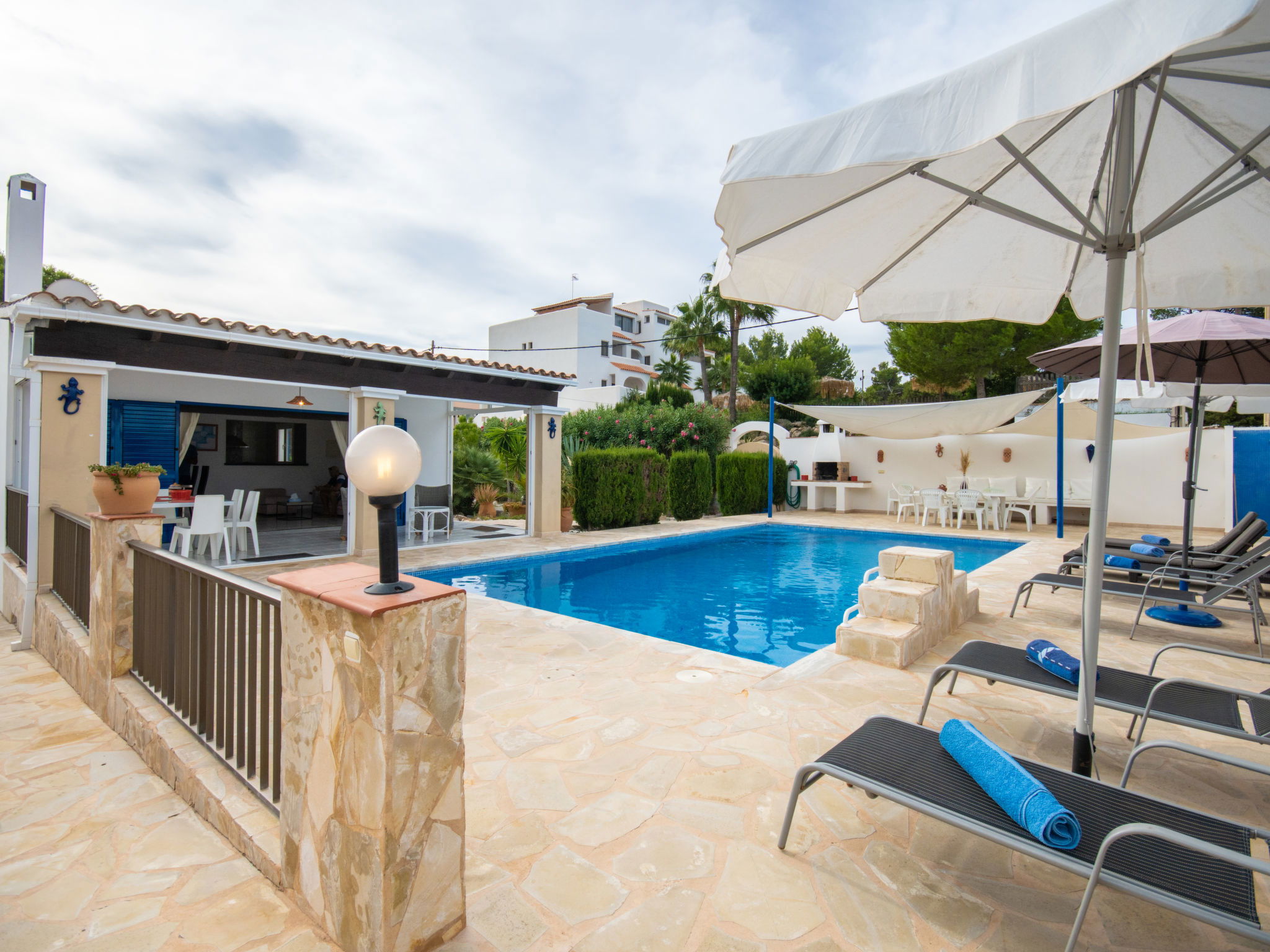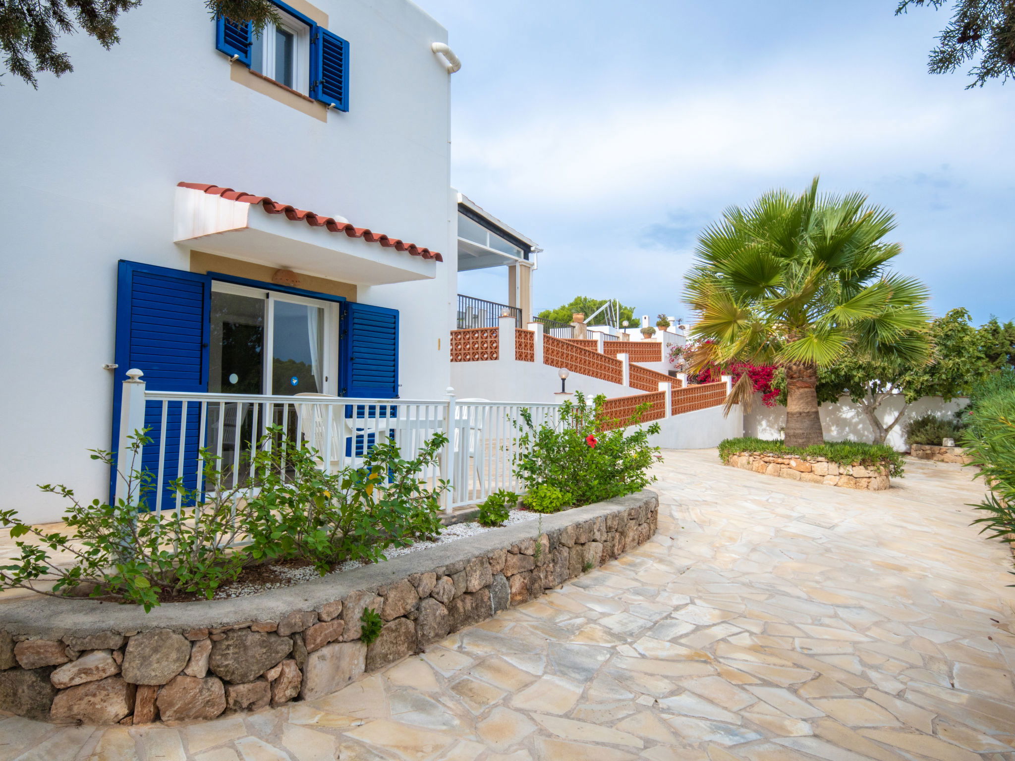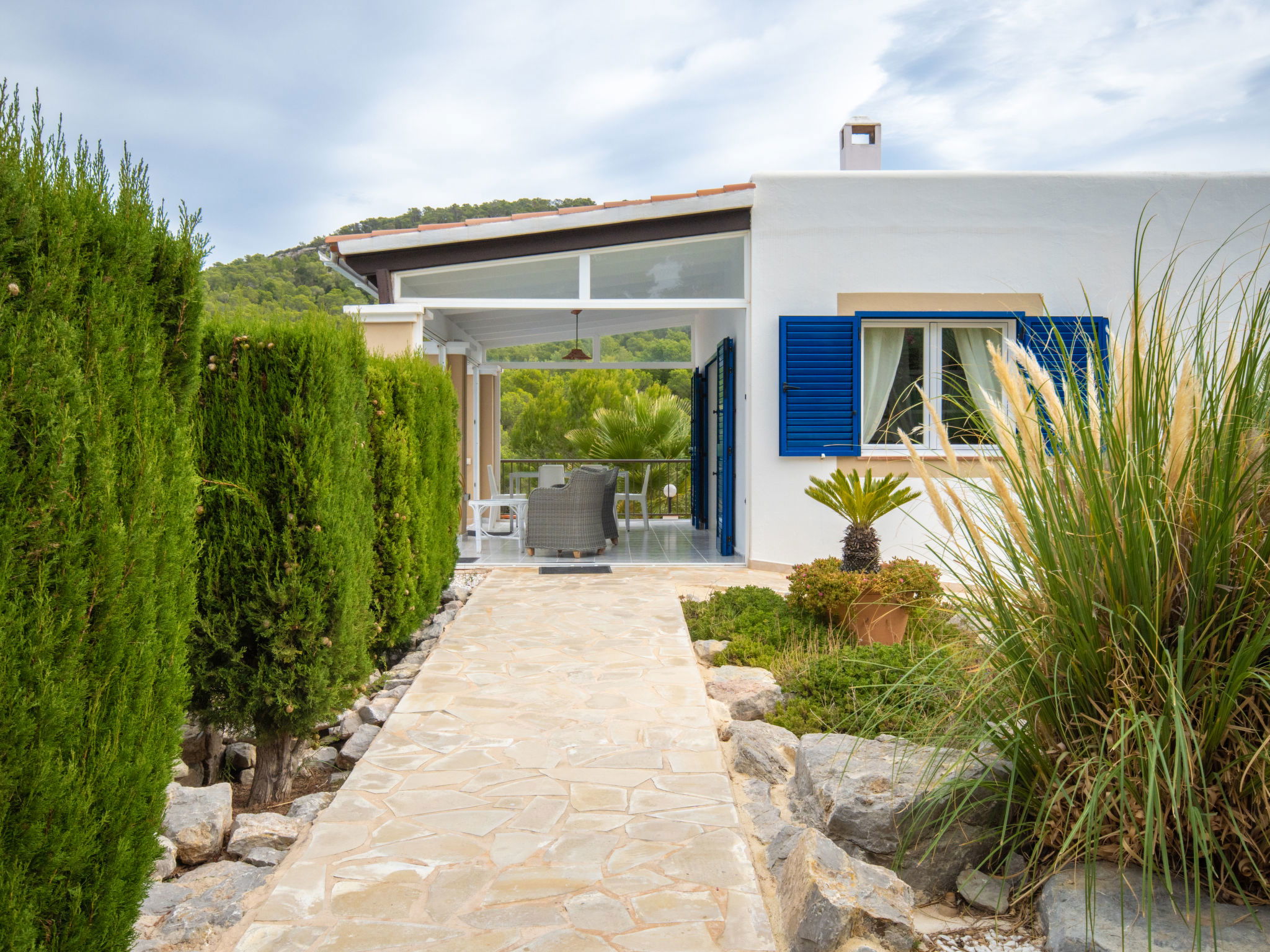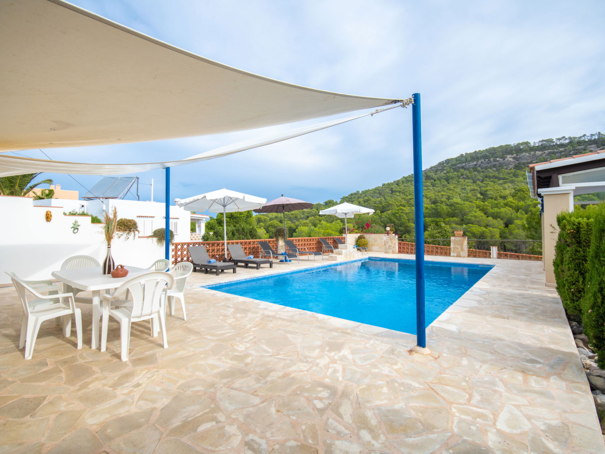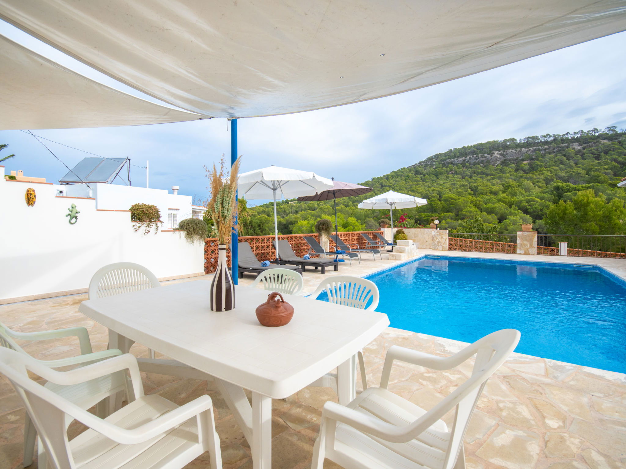 Keep in mind that arrivals after midnight are not possible, arrivals after 22:00 will be charged extra € 30 with a necessary previous notification to the key holder. House "Anromi". Outside the resort, 1.5 km from the centre of Cala Vedella, in an elevated position, 1.5 km from the sea. Private: property 1'500 m2 (fenced), garden 200 m2 with wildlife garden and trees, swimming pool (6 x 9 m, depth 120 - 240 cm, seasonal availability: 01.Apr. - 30.Oct.). Outdoor shower, terrace (140 m2), garden furniture, barbecue. In the house: WiFi, burglar alarm system. Parking (for 3 cars) on the premises. Shop 1.5 km, grocery, restaurant, bar 400 m, bus stop "Cala Vadella" 1.5 km, sandy beach 1.5 km. Tennis 500 m. Groups of teenagers on request only.