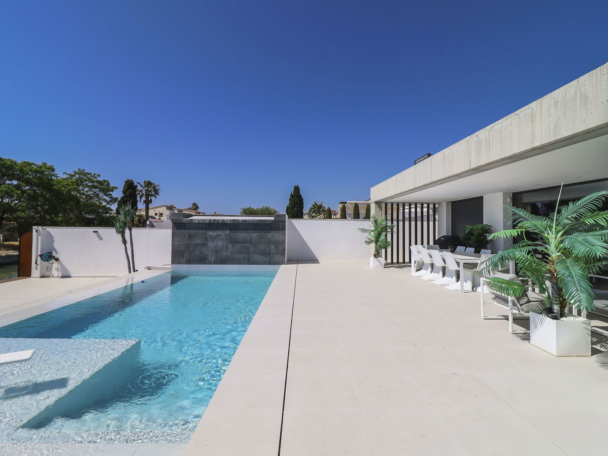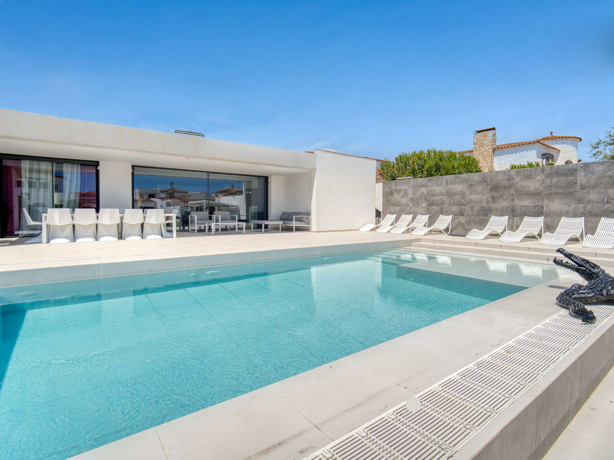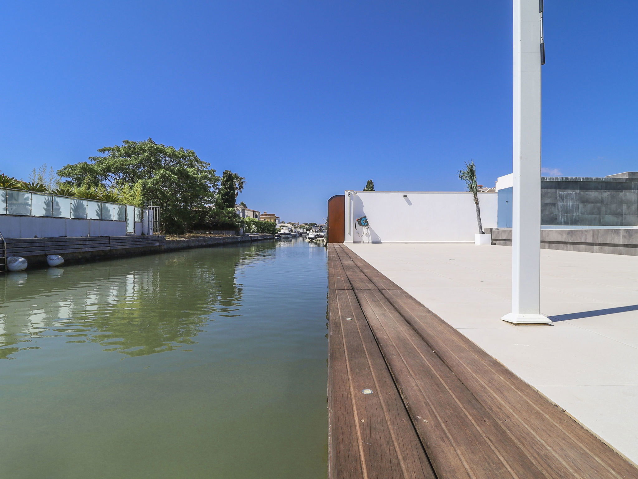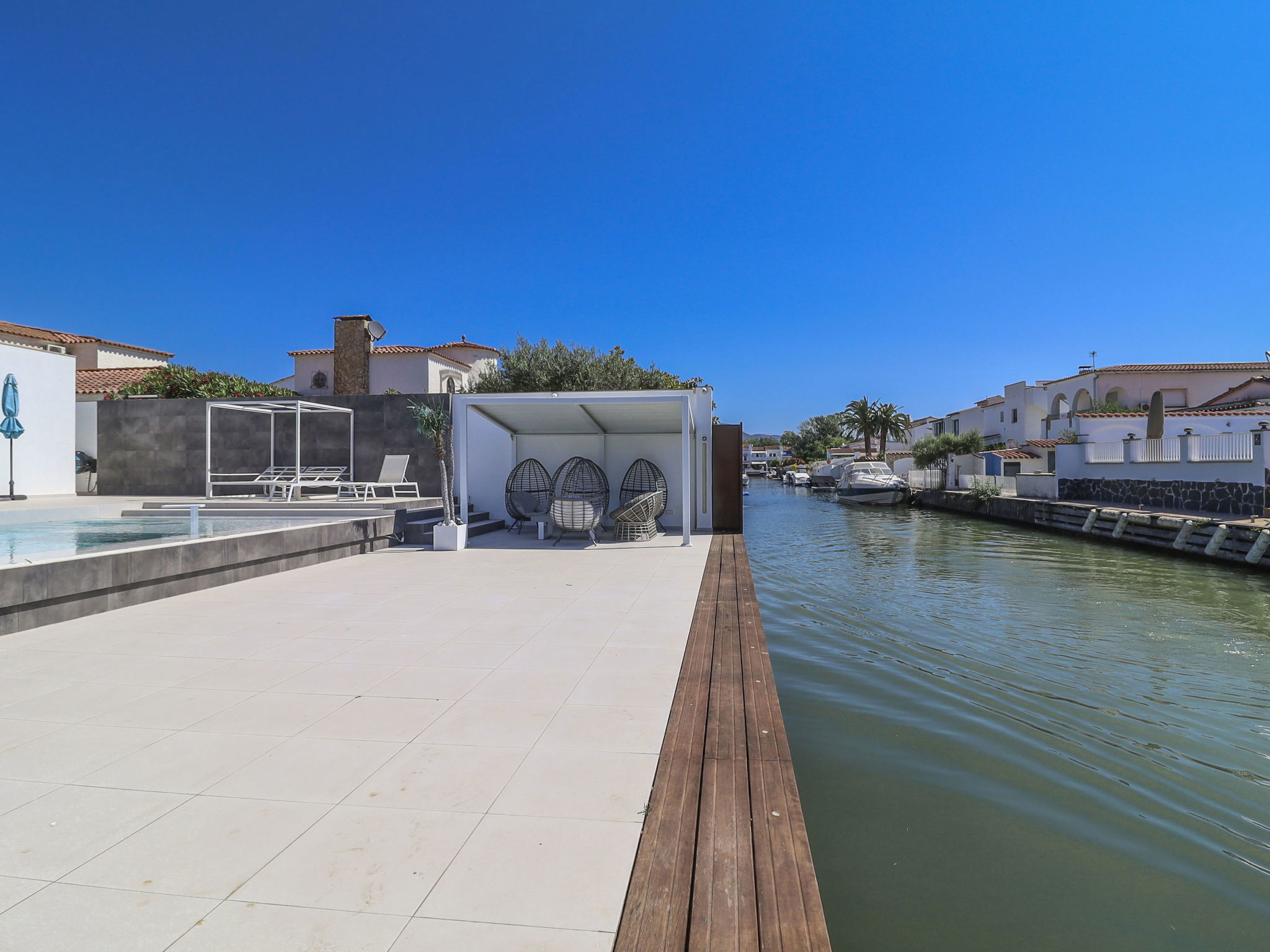 Casa al canal: Modern, comfortable, luxurious single-family house "Lighthouse". In the district of Medes 1 km from the centre of Empuriabrava, in a quiet, sunny position residential area (villas), traffic calmed area, 900 m from the sea, directly by the canal, in a cul-de-sac. Private: property (fenced), swimming pool (8 x 5 m, 40 m2, depth 50 - 160 cm, seasonal availability: 01.Apr. - 30.Oct.) with salt-electrolysis pool-cleaning system. Unconventional pool shape. Terrace, garden furniture. In the house: central heating system, air conditioning. Parking (for 2 cars) on the premises, single garage. Supermarket 1 km, restaurant 600 m, pedestrian zone 500 m, bicycle rental 1.5 km, pub garden 1 km, bus stop "Empuriabrava Cruïlla" 2.8 km, railway station "Figueres Renfe Adif" 15 km, sandy beach "La Rubina / Empuriabrava" 900 m. Sports harbour 2 km, golf course (18 hole) 15 km, surf school 1.5 km, sailing school 1.5 km, tennis 1.5 km, minigolf 900 m, riding stable 800 m, sports centre 1 km, walking paths from the house 300 m, cycle lane 100 m. Nearby attractions: Parque Acuático Roses 5 km, Museo Dalí Figueres 12 km, Ruinas de Empuries 20 km, Castillo y Festival de Perelada 12 km, Centro de Paracaidismo y Túnel de viento 1 km, Cadaqués y Cap de Creus 23 km. Please note: groups of teenagers on request only. Private mooring, on request. The keys‘ handover takes place by the agency in Empuriabrava.