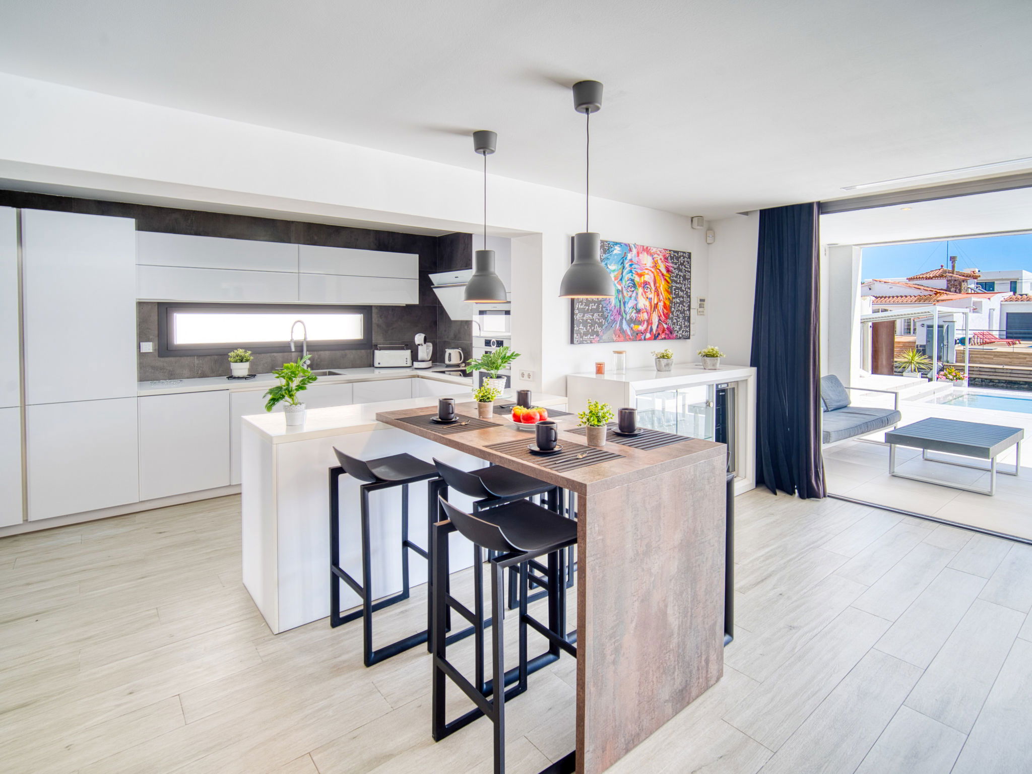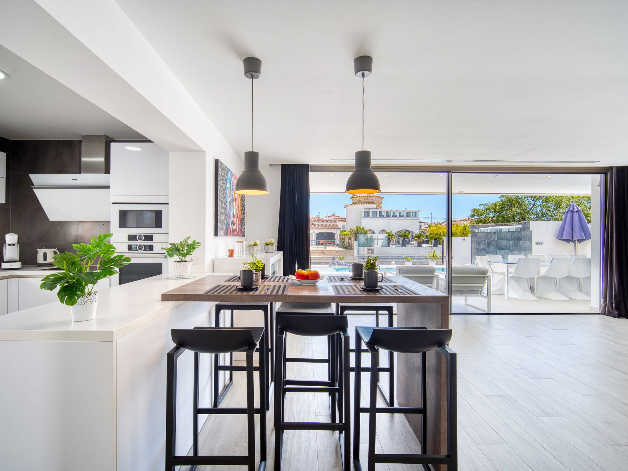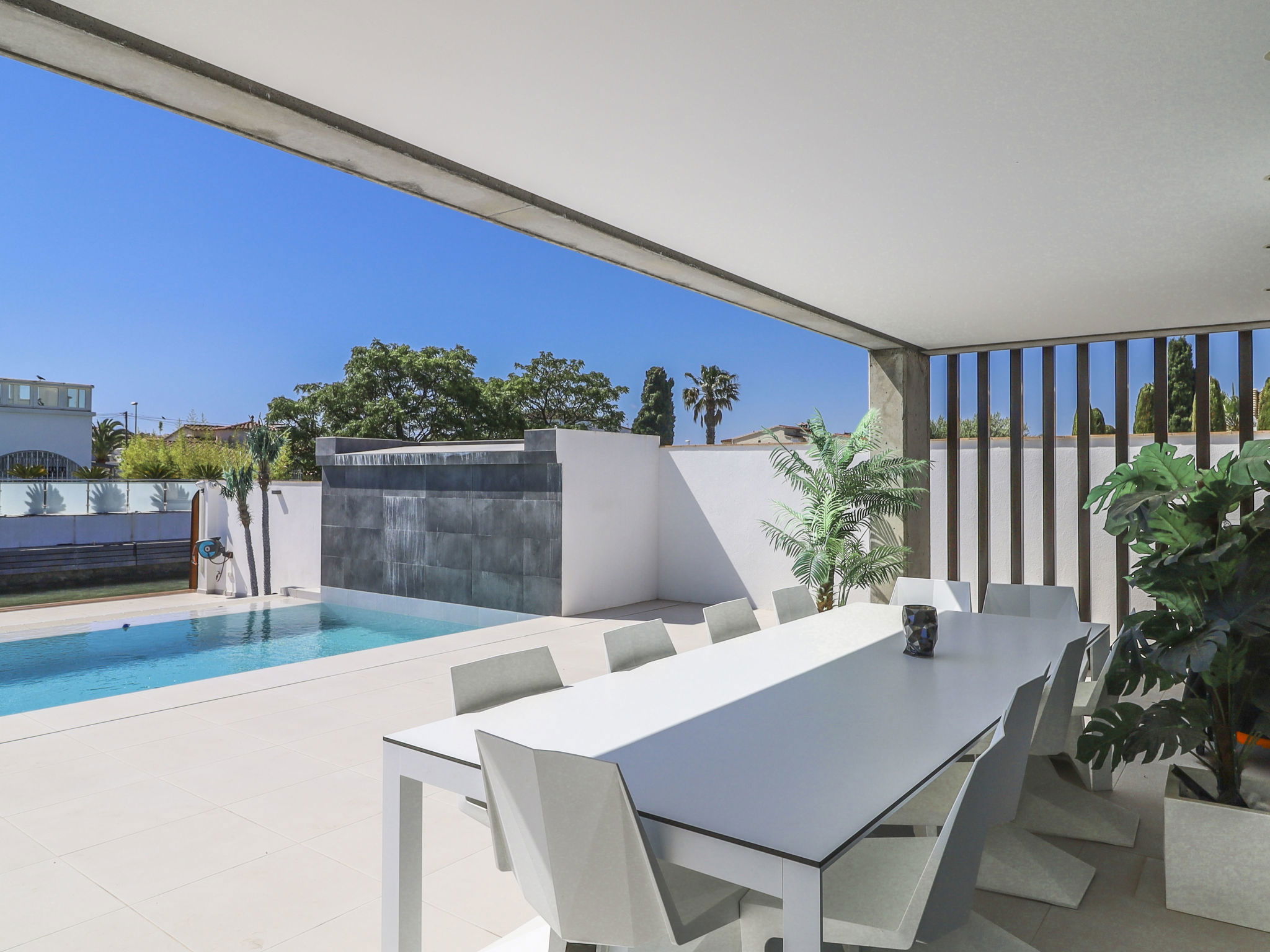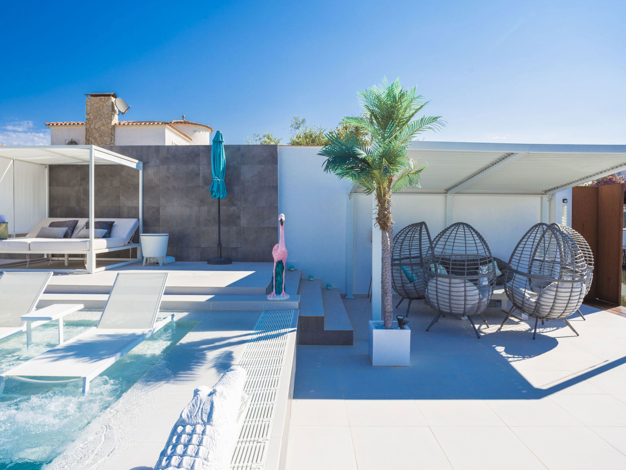 Casa al canal: Modern, comfortable, luxurious single-family house "Lighthouse". In the district of Medes 1 km from the centre of Empuriabrava, in a quiet, sunny position residential area (villas), traffic calmed area, 900 m from the sea, directly by the canal, in a cul-de-sac. Private: property (fenced), swimming pool (8 x 5 m, 40 m2, depth 50 - 160 cm, seasonal availability: 01.Apr. - 30.Oct.) with salt-electrolysis pool-cleaning system. Unconventional pool shape. Terrace, garden furniture. In the house: central heating system, air conditioning. Parking (for 2 cars) on the premises, single garage. Supermarket 1 km, restaurant 600 m, pedestrian zone 500 m, bicycle rental 1.5 km, pub garden 1 km, bus stop "Empuriabrava Cruïlla" 2.8 km, railway station "Figueres Renfe Adif" 15 km, sandy beach "La Rubina / Empuriabrava" 900 m. Sports harbour 2 km, golf course (18 hole) 15 km, surf school 1.5 km, sailing school 1.5 km, tennis 1.5 km, minigolf 900 m, riding stable 800 m, sports centre 1 km, walking paths from the house 300 m, cycle lane 100 m. Nearby attractions: Parque Acuático Roses 5 km, Museo Dalí Figueres 12 km, Ruinas de Empuries 20 km, Castillo y Festival de Perelada 12 km, Centro de Paracaidismo y Túnel de viento 1 km, Cadaqués y Cap de Creus 23 km. Please note: groups of teenagers on request only. Private mooring, on request. The keys‘ handover takes place by the agency in Empuriabrava.