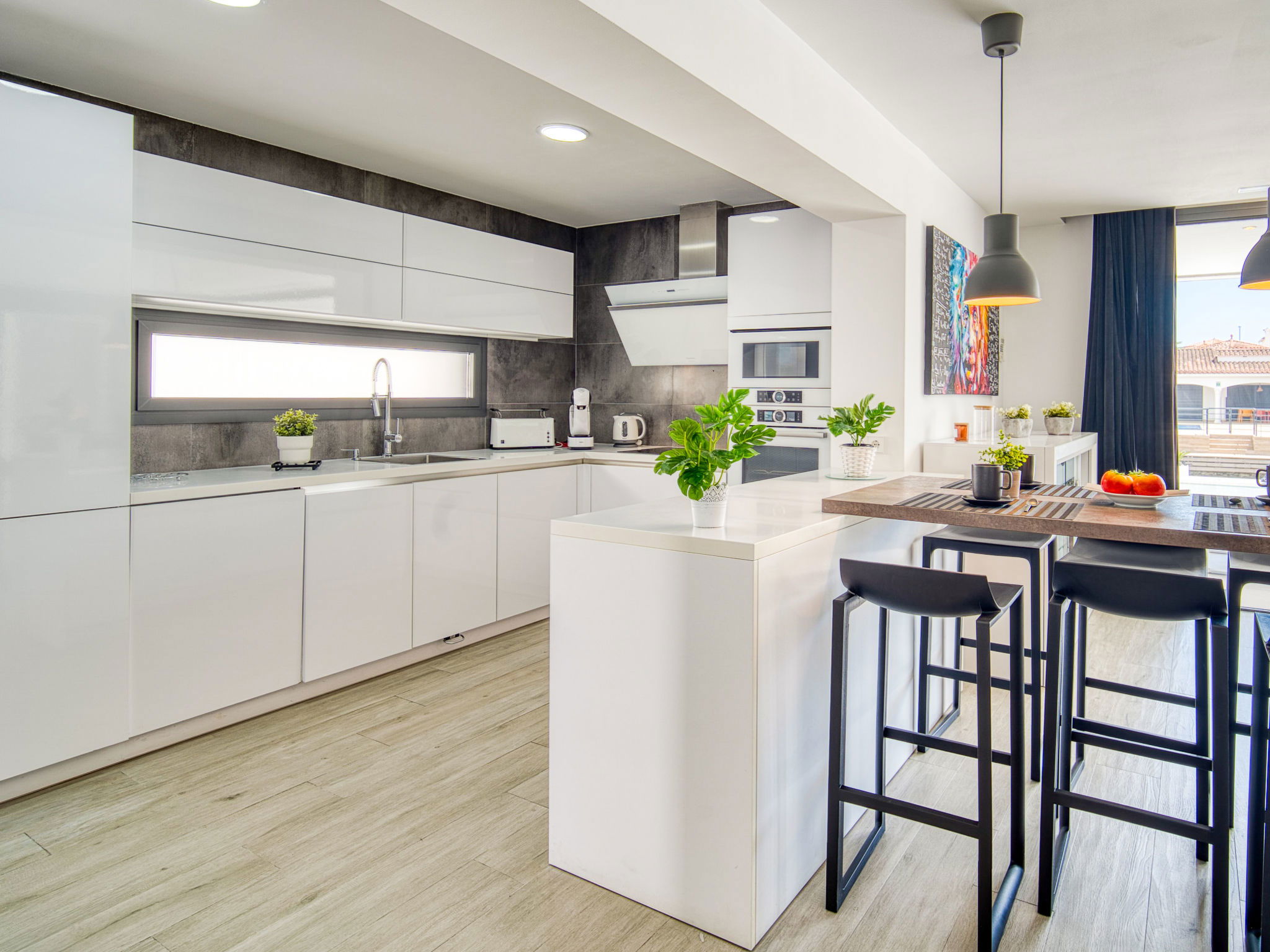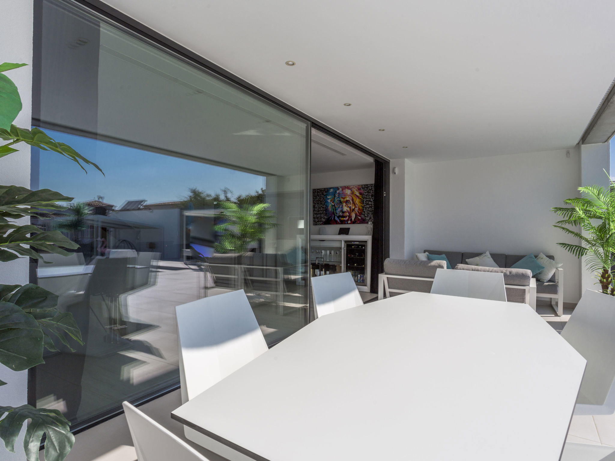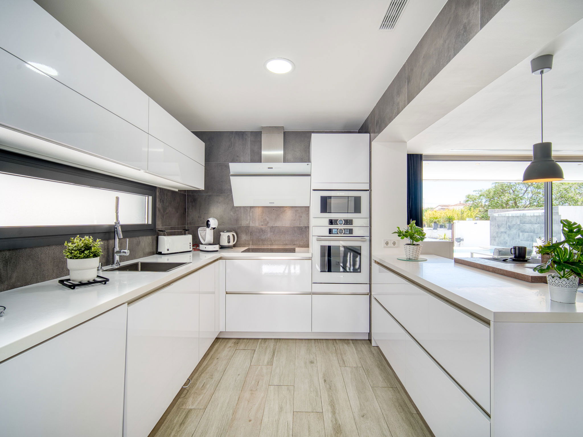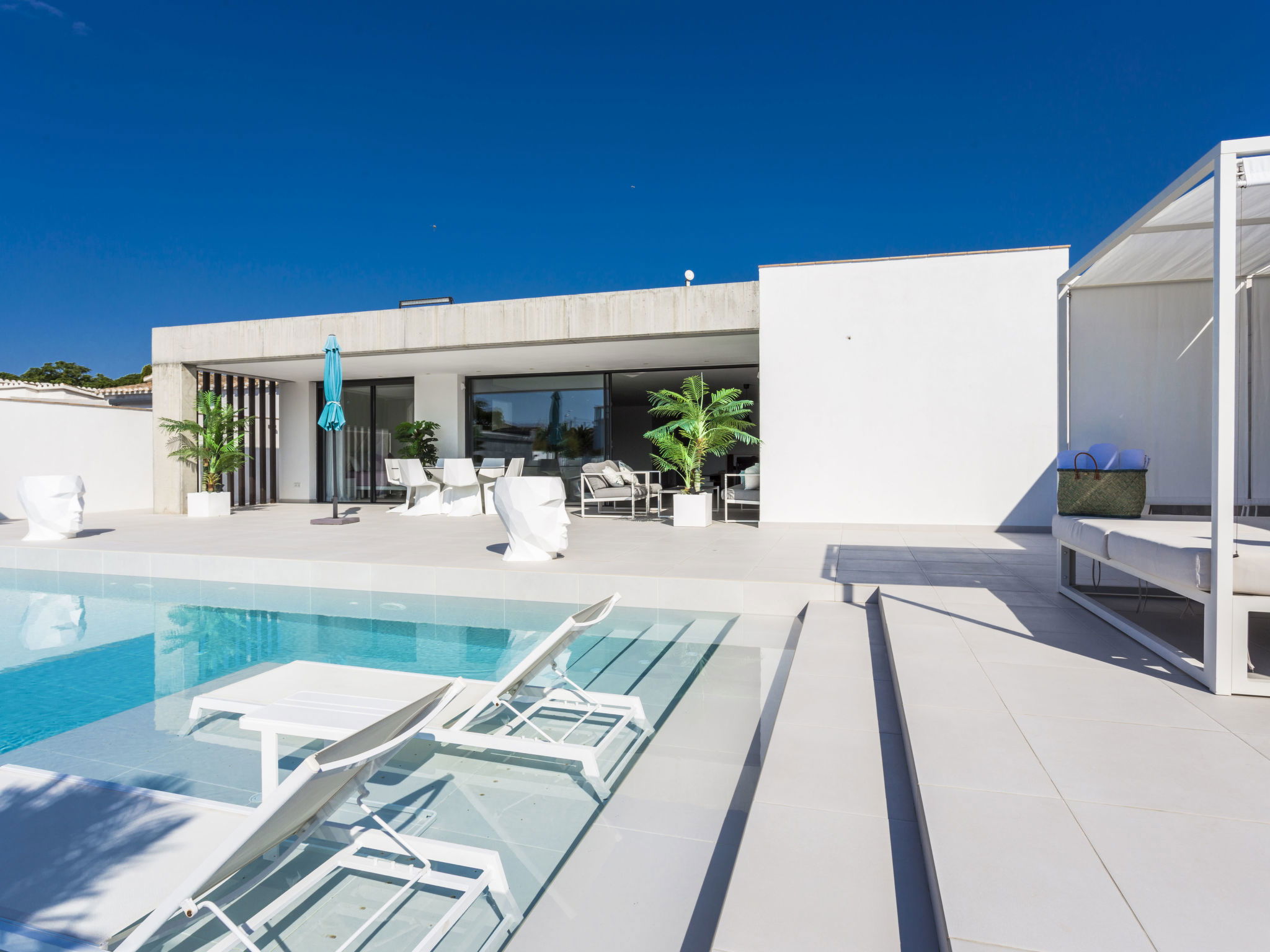 Casa al canal: Modern, comfortable, luxurious single-family house "Lighthouse". In the district of Medes 1 km from the centre of Empuriabrava, in a quiet, sunny position residential area (villas), traffic calmed area, 900 m from the sea, directly by the canal, in a cul-de-sac. Private: property (fenced), swimming pool (8 x 5 m, 40 m2, depth 50 - 160 cm, seasonal availability: 01.Apr. - 30.Oct.) with salt-electrolysis pool-cleaning system. Unconventional pool shape. Terrace, garden furniture. In the house: central heating system, air conditioning. Parking (for 2 cars) on the premises, single garage. Supermarket 1 km, restaurant 600 m, pedestrian zone 500 m, bicycle rental 1.5 km, pub garden 1 km, bus stop "Empuriabrava Cruïlla" 2.8 km, railway station "Figueres Renfe Adif" 15 km, sandy beach "La Rubina / Empuriabrava" 900 m. Sports harbour 2 km, golf course (18 hole) 15 km, surf school 1.5 km, sailing school 1.5 km, tennis 1.5 km, minigolf 900 m, riding stable 800 m, sports centre 1 km, walking paths from the house 300 m, cycle lane 100 m. Nearby attractions: Parque Acuático Roses 5 km, Museo Dalí Figueres 12 km, Ruinas de Empuries 20 km, Castillo y Festival de Perelada 12 km, Centro de Paracaidismo y Túnel de viento 1 km, Cadaqués y Cap de Creus 23 km. Please note: groups of teenagers on request only. Private mooring, on request. The keys‘ handover takes place by the agency in Empuriabrava.