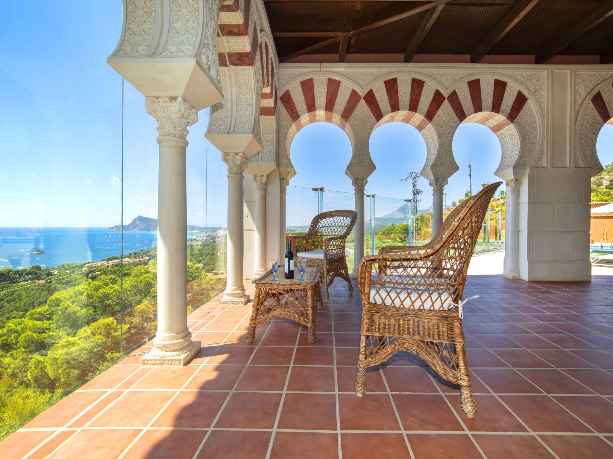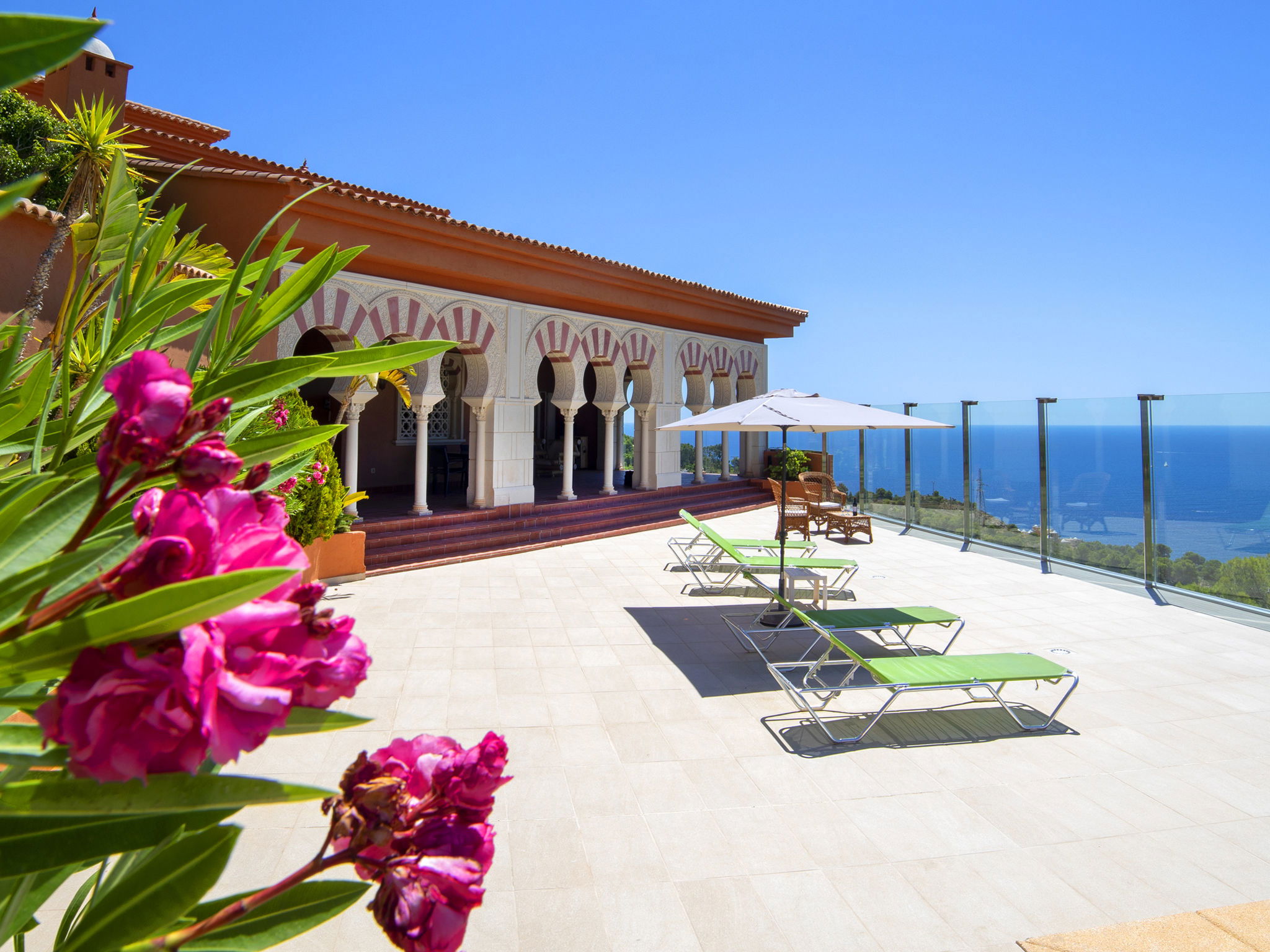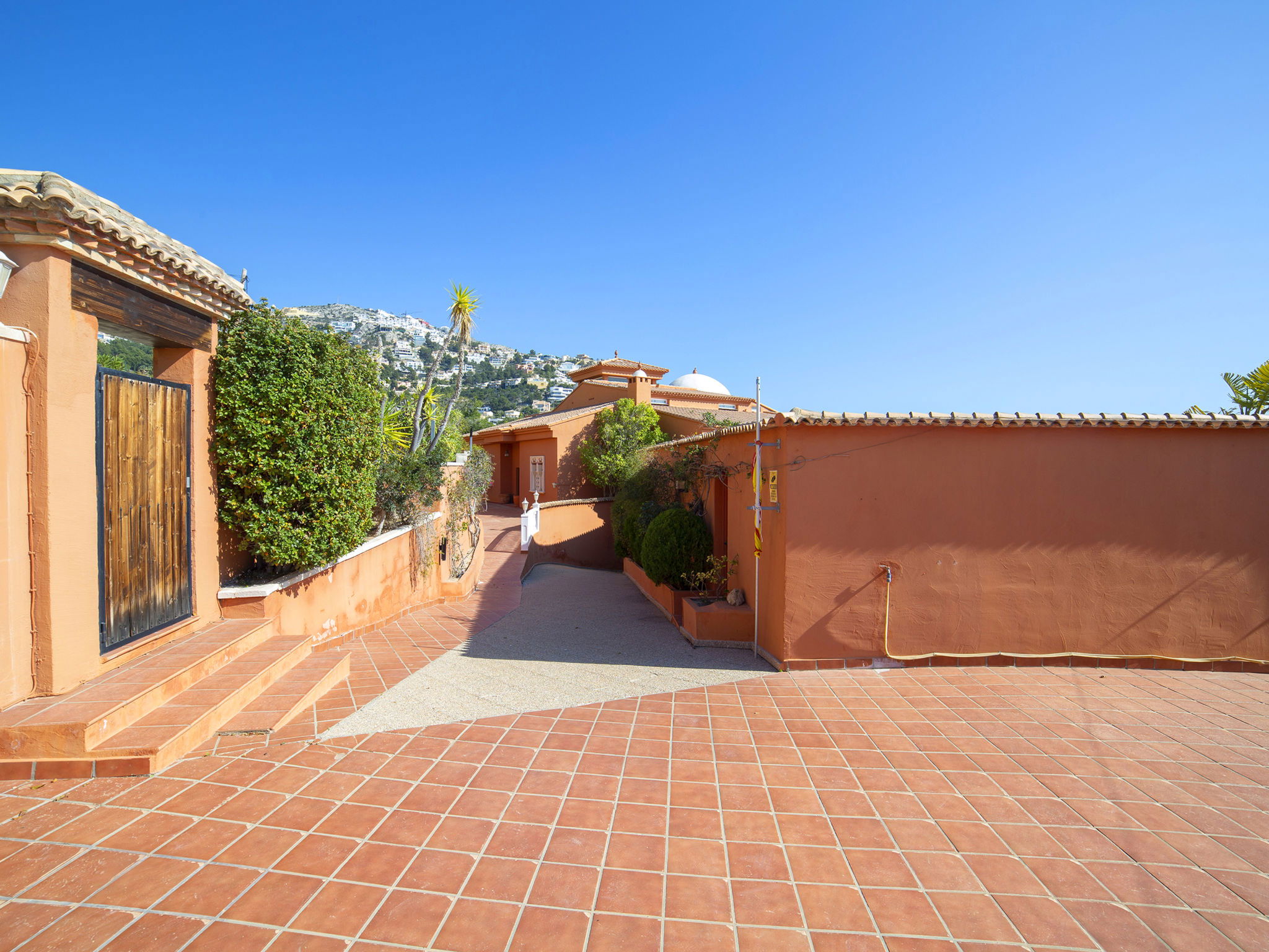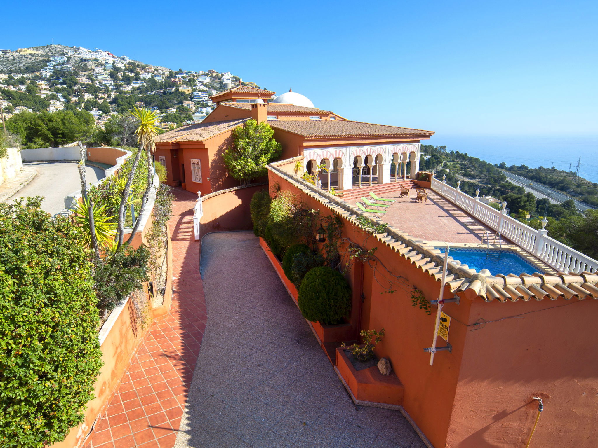 Sierra de Altea: Large, beautiful villa "Azahara". In the resort 5 km from the centre of Altea, 7.6 km from the centre of Calpe, in a sunny, elevated position residential area (villas), 2.3 km from the sea, 2.8 km from the beach. Private: property 1'800 m2 (fenced), swimming pool (8 x 5 m, seasonal availability: 01.Jan. - 31.Dec.). Outdoor shower, terrace, barbecue. Supermarket 1.2 km, restaurant, café 650 m, bus stop 3.7 km, sandy beach "Cap Negret" 3.9 km, shingle beach "Playa el Mascarat" 2.3 km. Sports harbour 2.6 km, marina 2.6 km, golf course (9 hole) 4.2 km. Nearby attractions: Aqualandia, Mundomar, Terra Mítica, Terra Natura, Benidorm Palace (Benidorm), Les Fonts de l'Algar, Castillo de Guadalest. Groups of teenagers on request only. Please note: motorway close by 500 m from the property.