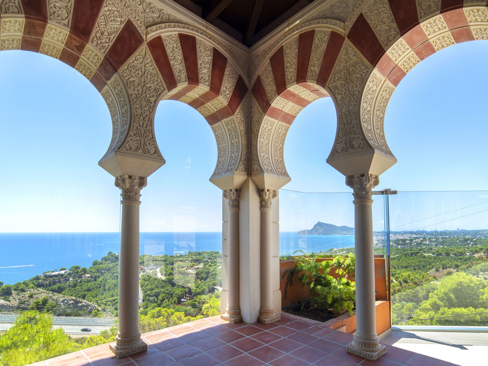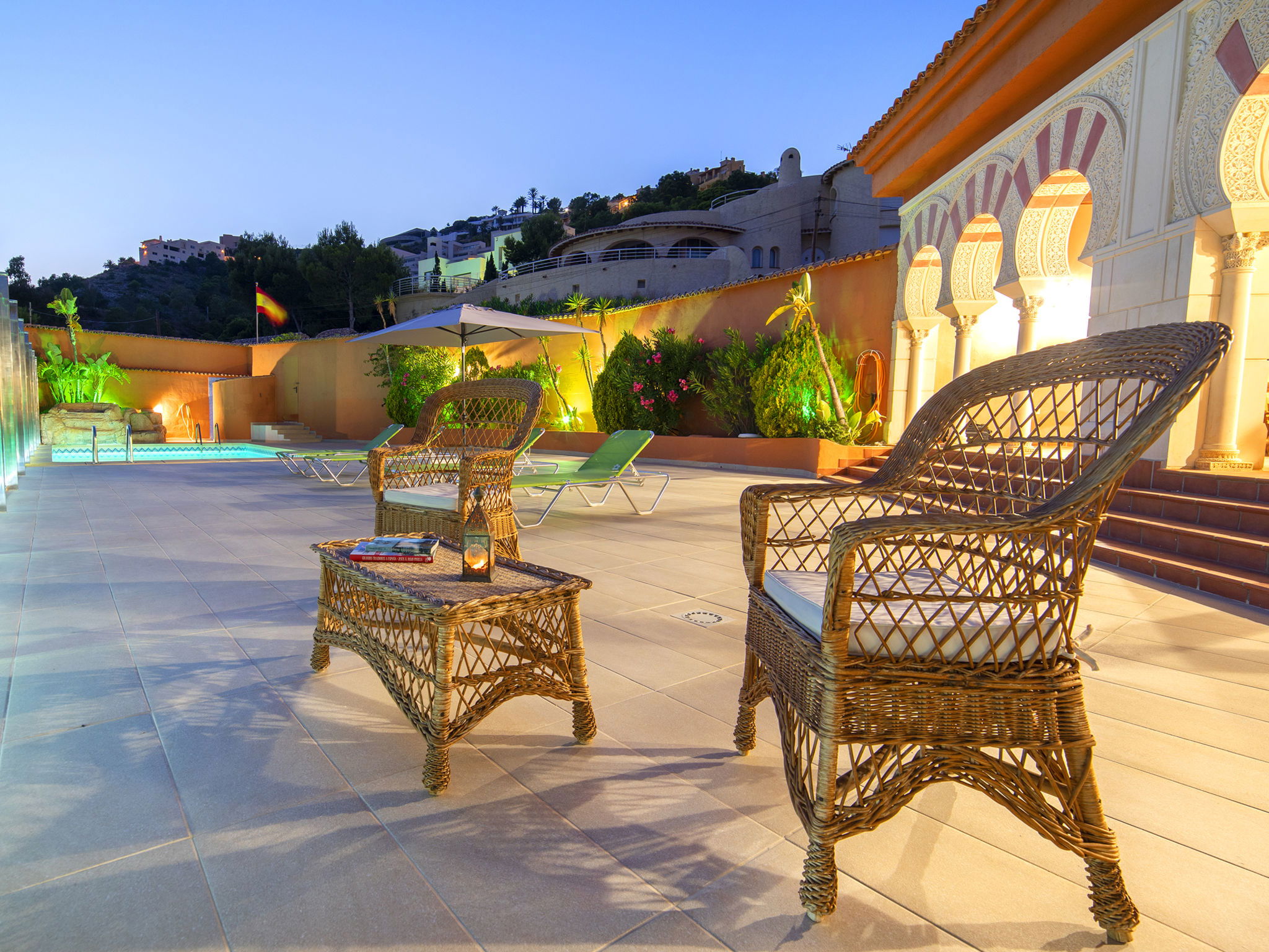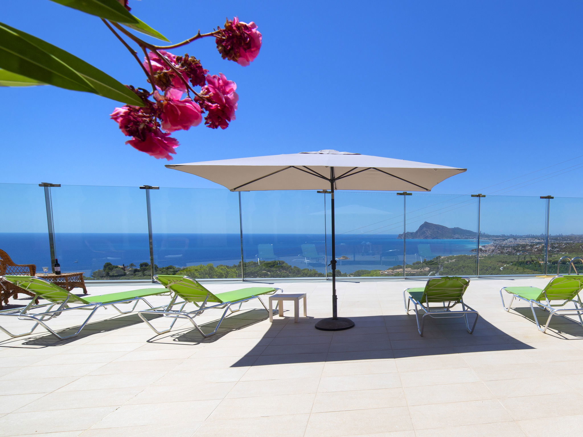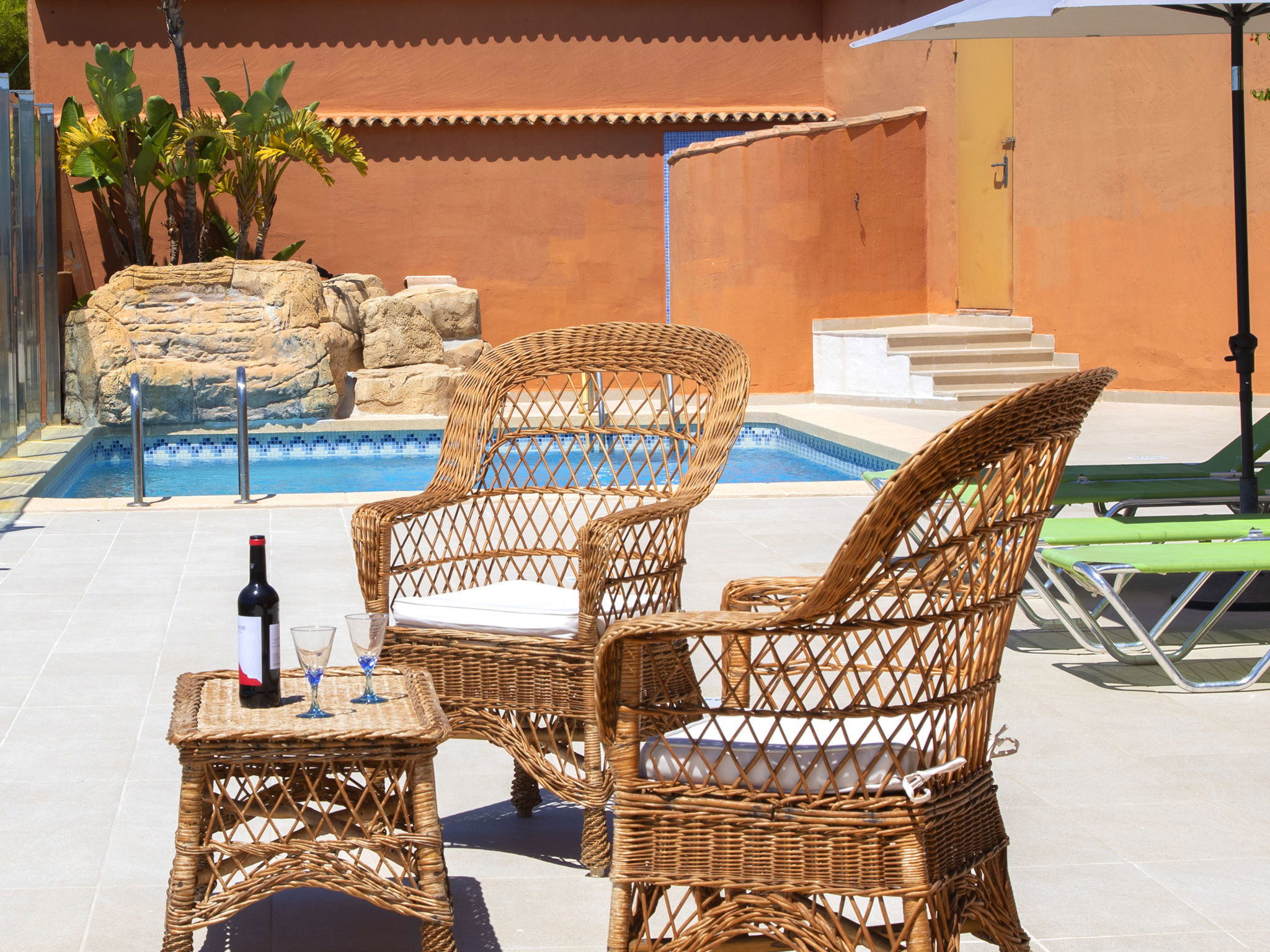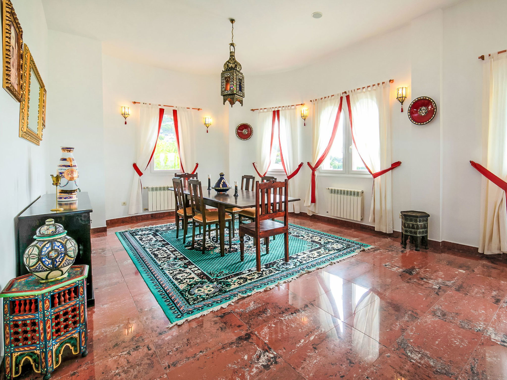 Sierra de Altea: Large, beautiful villa "Azahara". In the resort 5 km from the centre of Altea, 7.6 km from the centre of Calpe, in a sunny, elevated position residential area (villas), 2.3 km from the sea, 2.8 km from the beach. Private: property 1'800 m2 (fenced), swimming pool (8 x 5 m, seasonal availability: 01.Jan. - 31.Dec.). Outdoor shower, terrace, barbecue. Supermarket 1.2 km, restaurant, café 650 m, bus stop 3.7 km, sandy beach "Cap Negret" 3.9 km, shingle beach "Playa el Mascarat" 2.3 km. Sports harbour 2.6 km, marina 2.6 km, golf course (9 hole) 4.2 km. Nearby attractions: Aqualandia, Mundomar, Terra Mítica, Terra Natura, Benidorm Palace (Benidorm), Les Fonts de l'Algar, Castillo de Guadalest. Groups of teenagers on request only. Please note: motorway close by 500 m from the property.