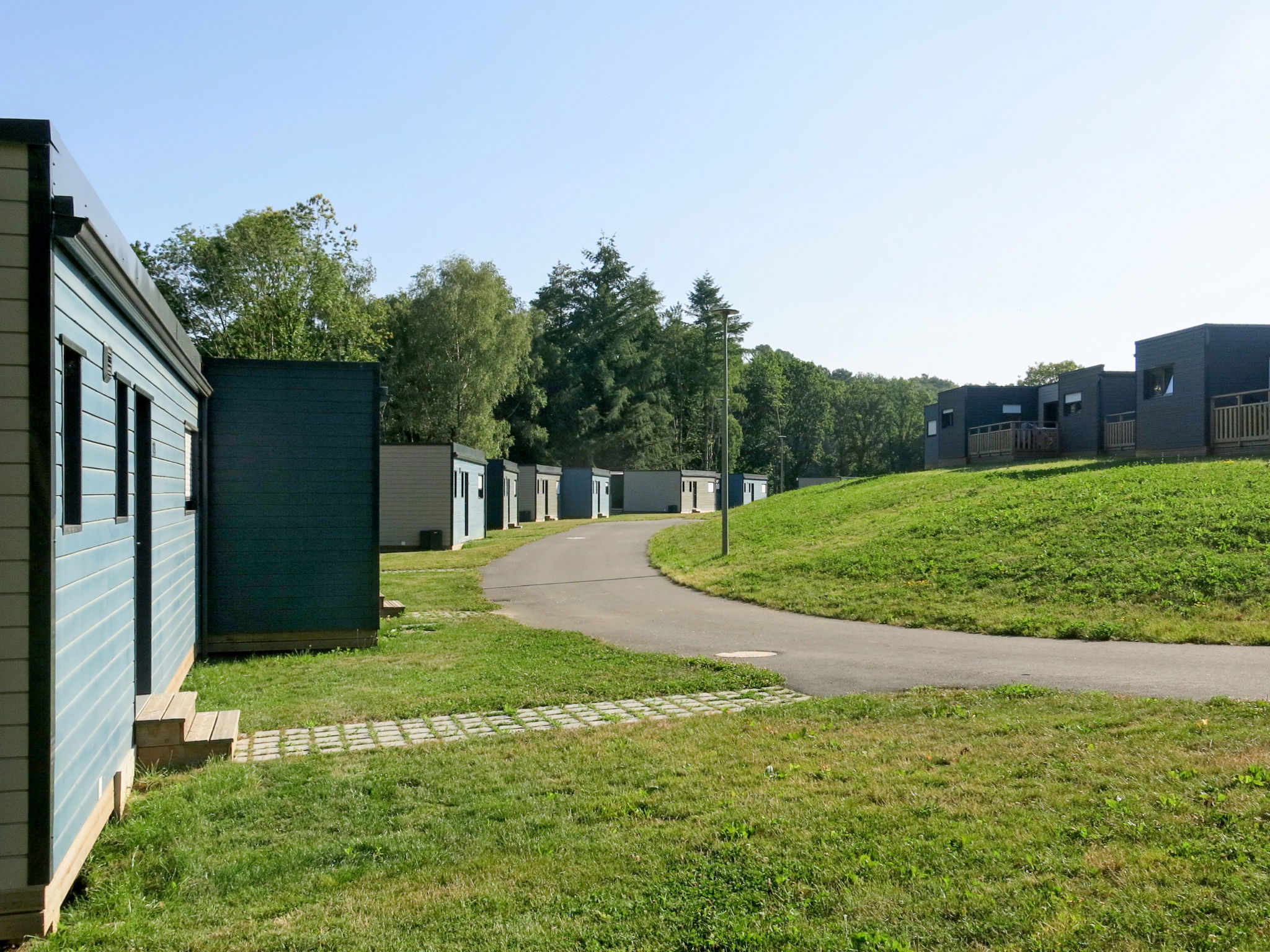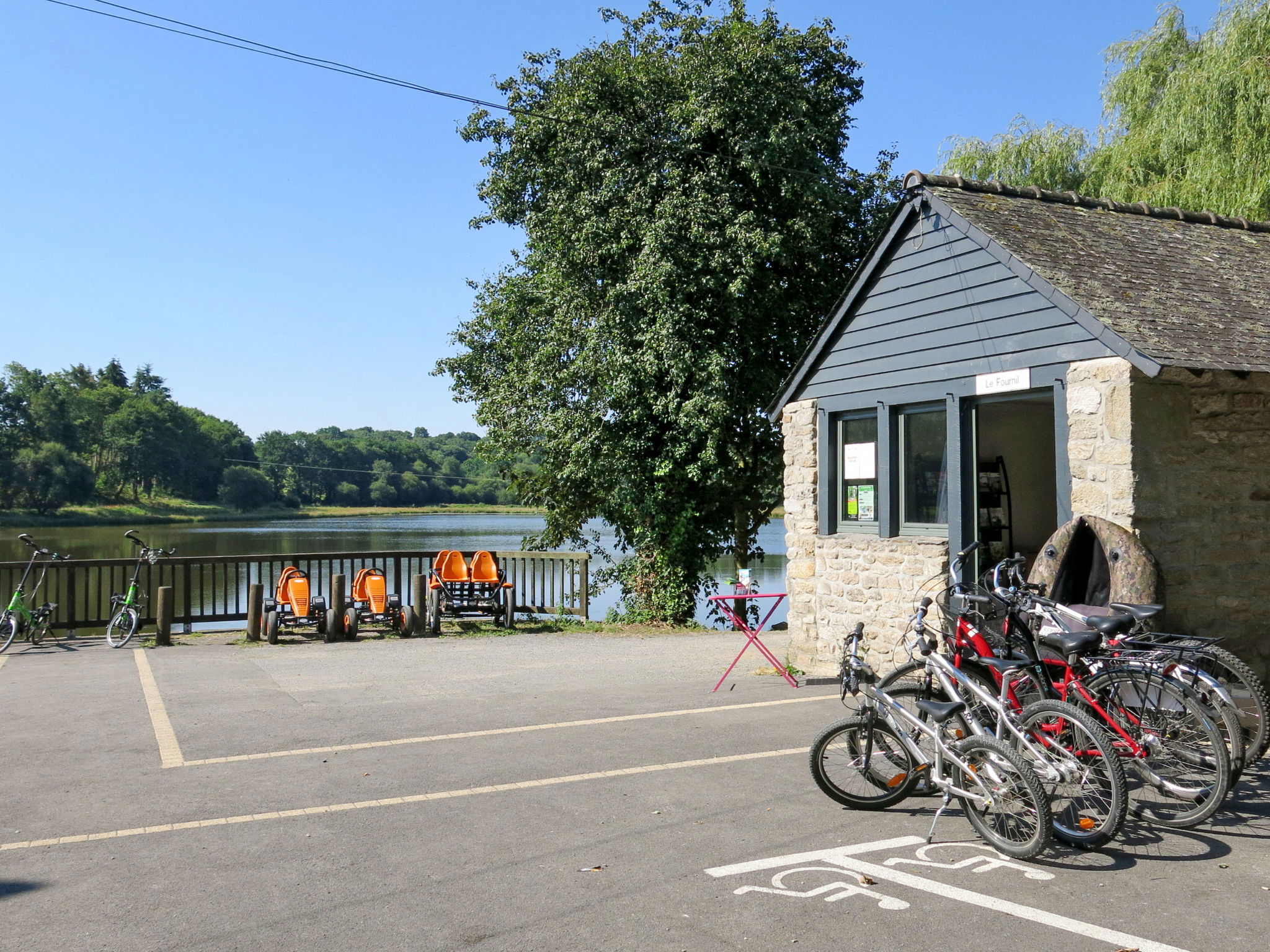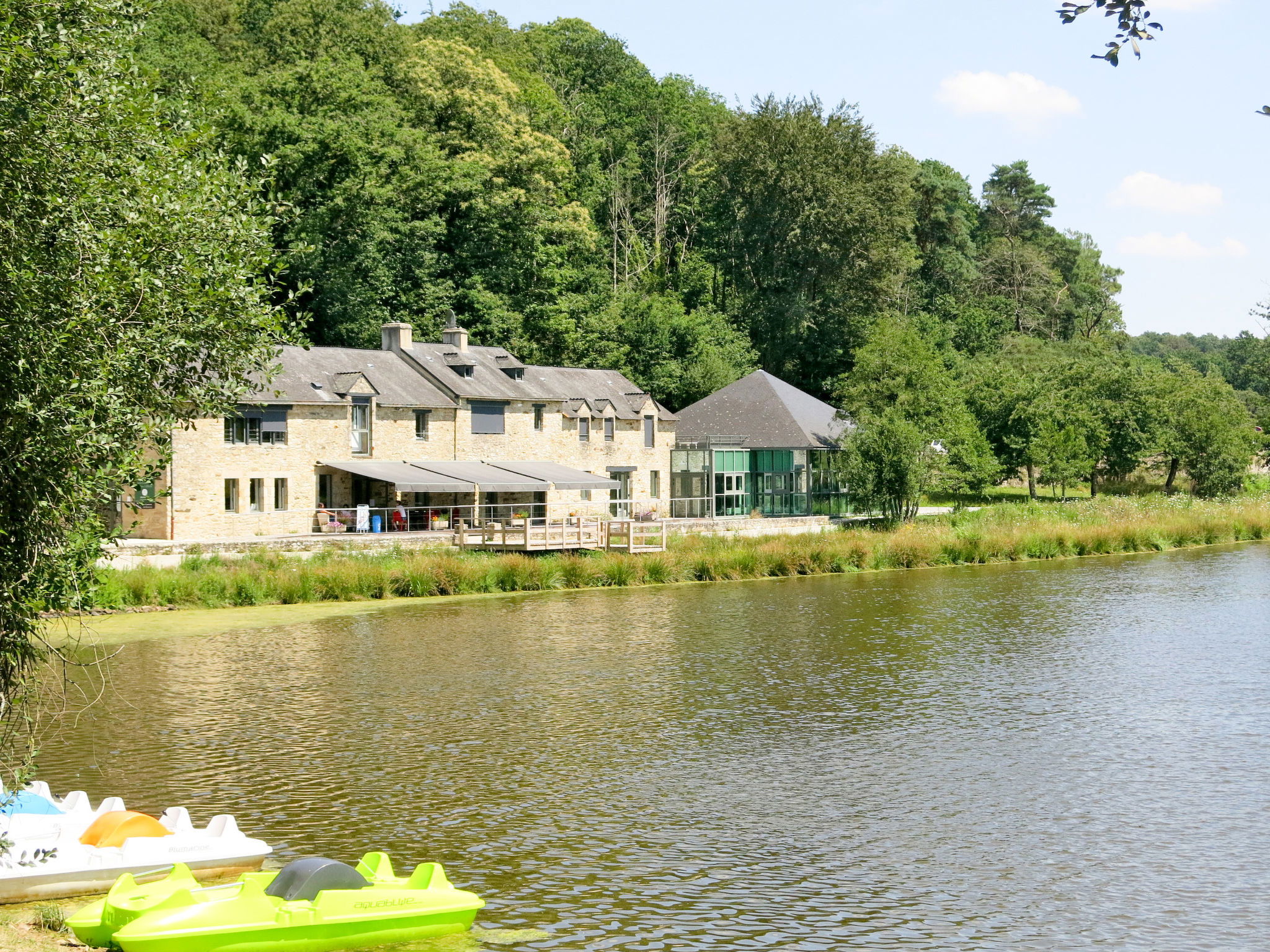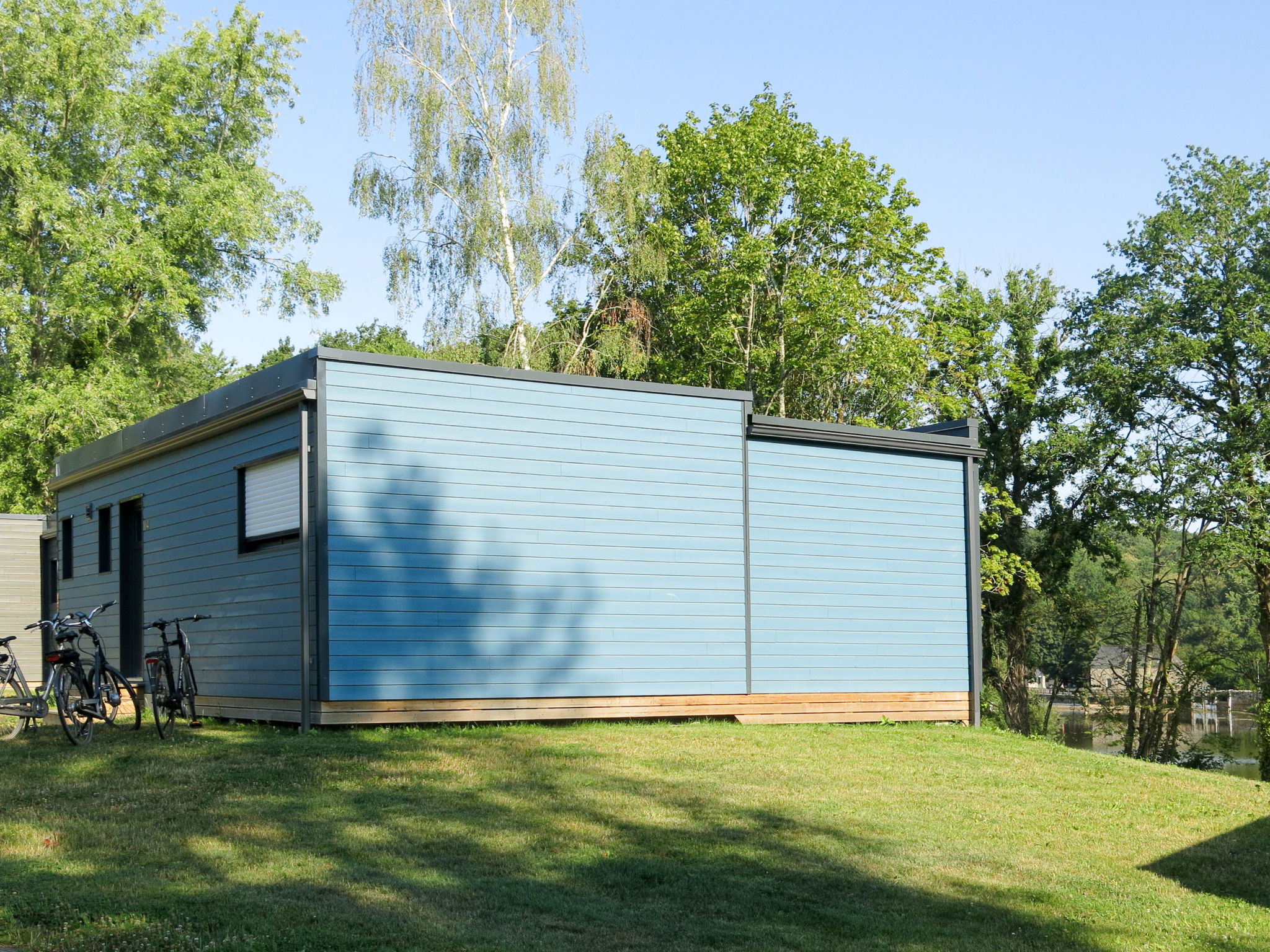 Child friendly resort "Le Moulin Neuf", built in 2017. 50 houses in the resort. 1.5 km from the centre of Rochefort-en-Terre, on the outskirts, 10 m from the lake. For shared use: property, park with lawn and trees, swimming pool heated, fenced (15 x 8 m, seasonal availability: 15.May. - 15.Sep.). Children's pool, tennis (extra), boccia, barbecue house, children's playground. In the complex: reception, washing machine, tumble dryer (for shared use, extra), bicycle rental. Parking. E-charging station. Supermarket 2 km, bus stop 1.5 km, sandy beach "Plage de l'Étang du Moulin Neuf" 500 m, park "de loisirs du Moulin neuf" 500 m. Sports centre 500 m. Nearby attractions: Tyrolienne, mur d’escalade. 500 m, Activités nautiques (paddle, canoé.) 500 m, Malansac (Parc de la Préhistoire) 5 km, La Gacilly 21 km, Damgan (plage Océan) 32 km, Vannes et Golfe du Morbihan 35 km. Hiking paths: GR34. Please note: car-free holiday complex. The photograph shows a typical example.