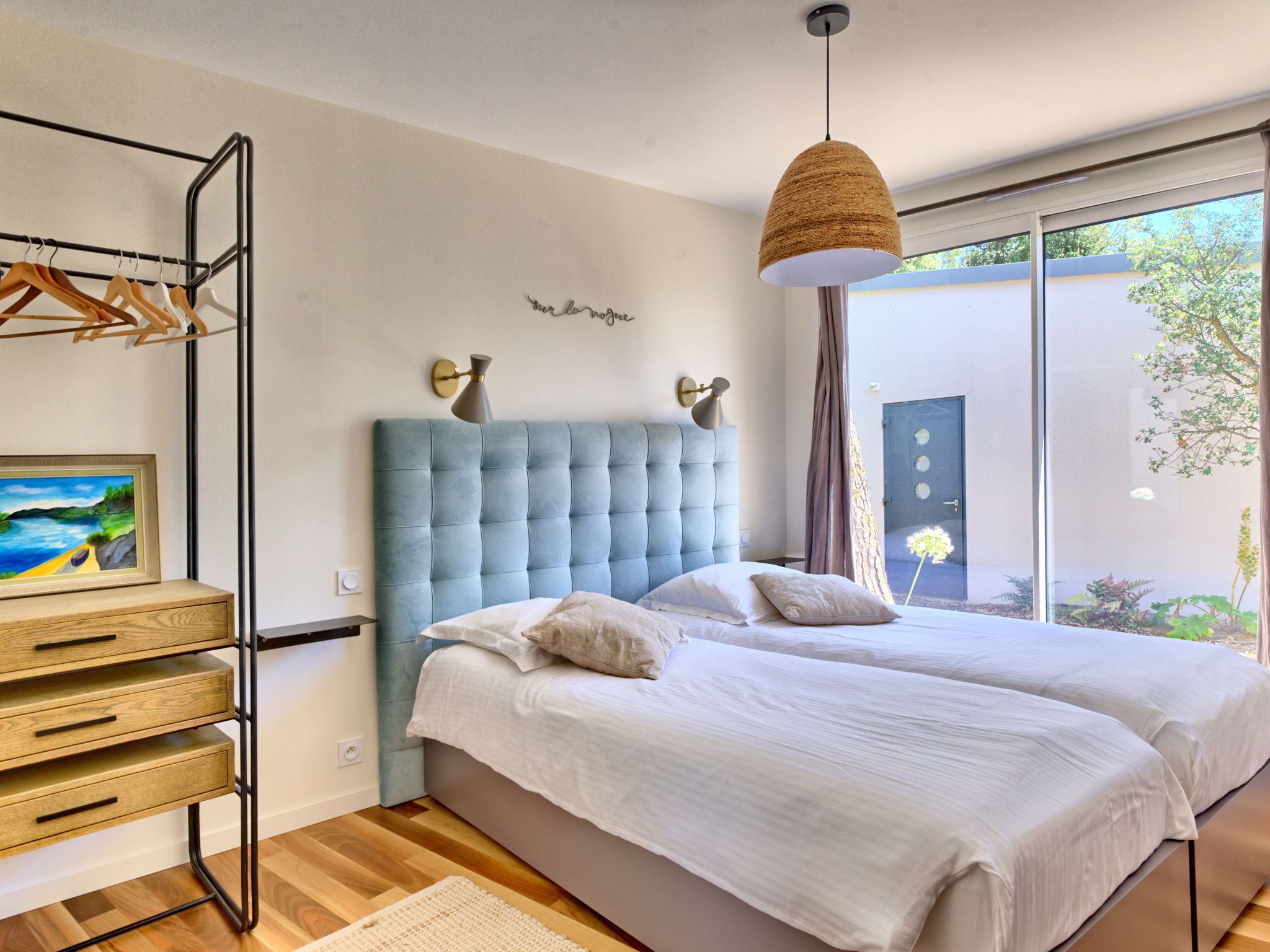 Beautiful house "Indigo-Vue Mer et Piscine chauffée", built in 2018. 1.6 km from the centre of Saint-Brévin-les-Pins, 800 m from the centre of Saint-Brevin-l'Océan, 14 km from the centre of Saint-Nazaire, in the residential district, excellent location: right in the centre but still quiet, 100 m from the sea, 100 m from the beach, in a cul-de-sac. Private: property 790 m2 (fenced) with wildlife garden, swimming pool heated (8 x 3 m, depth 150 cm, seasonal availability: 10.May. - 04.Oct.) with shutter cover. Storeroom available. Parking (for 2 cars) on the premises, single garage. Supermarket 800 m, bus stop 1.6 km, sandy beach "Plage de l'Océan" 400 m. Nearby attractions: Pornic 17 km, Pornichet-La Baule 24 km, Parc régional naturel de Brière 25 km. The owner does not accept any groups.
