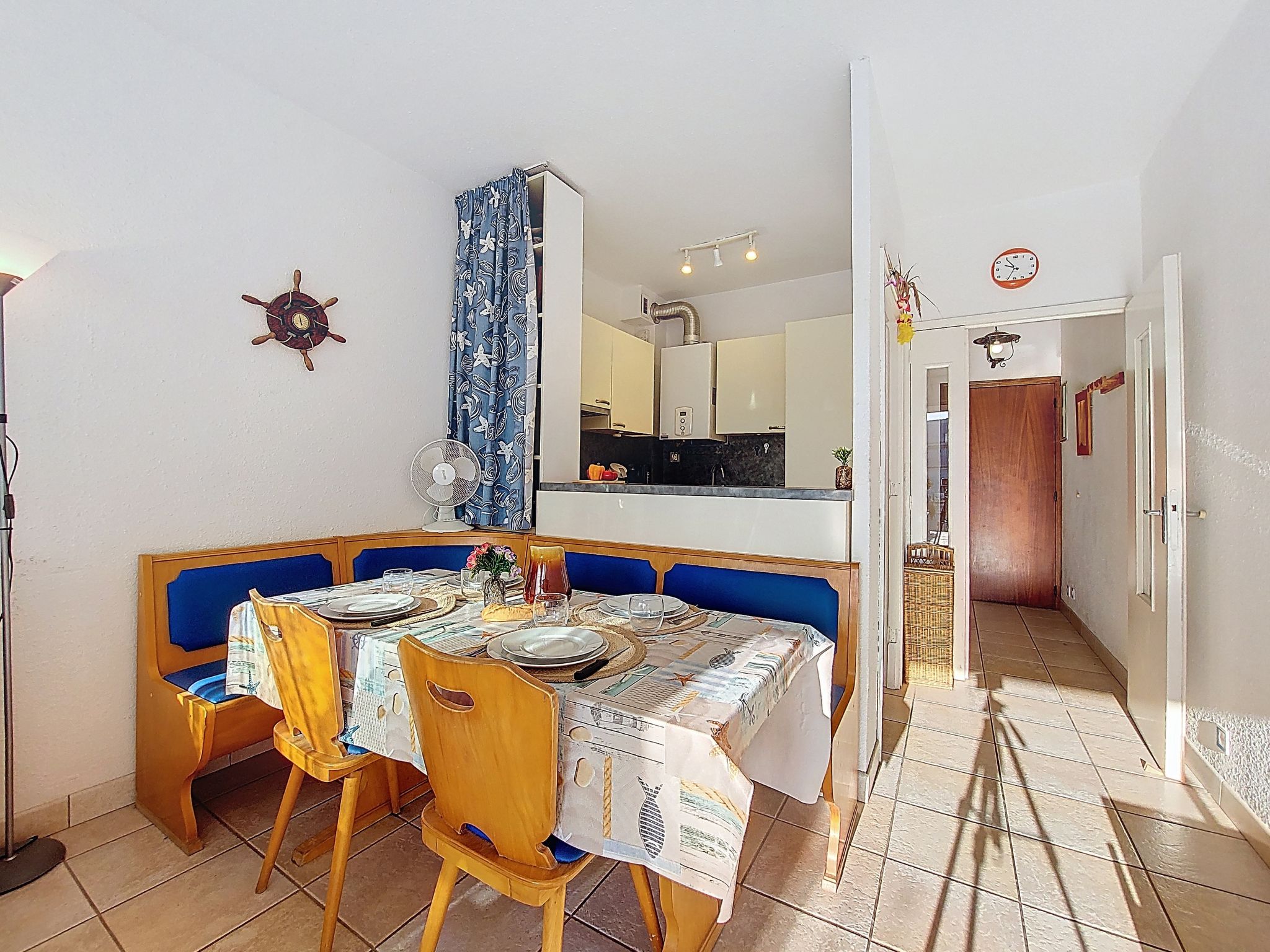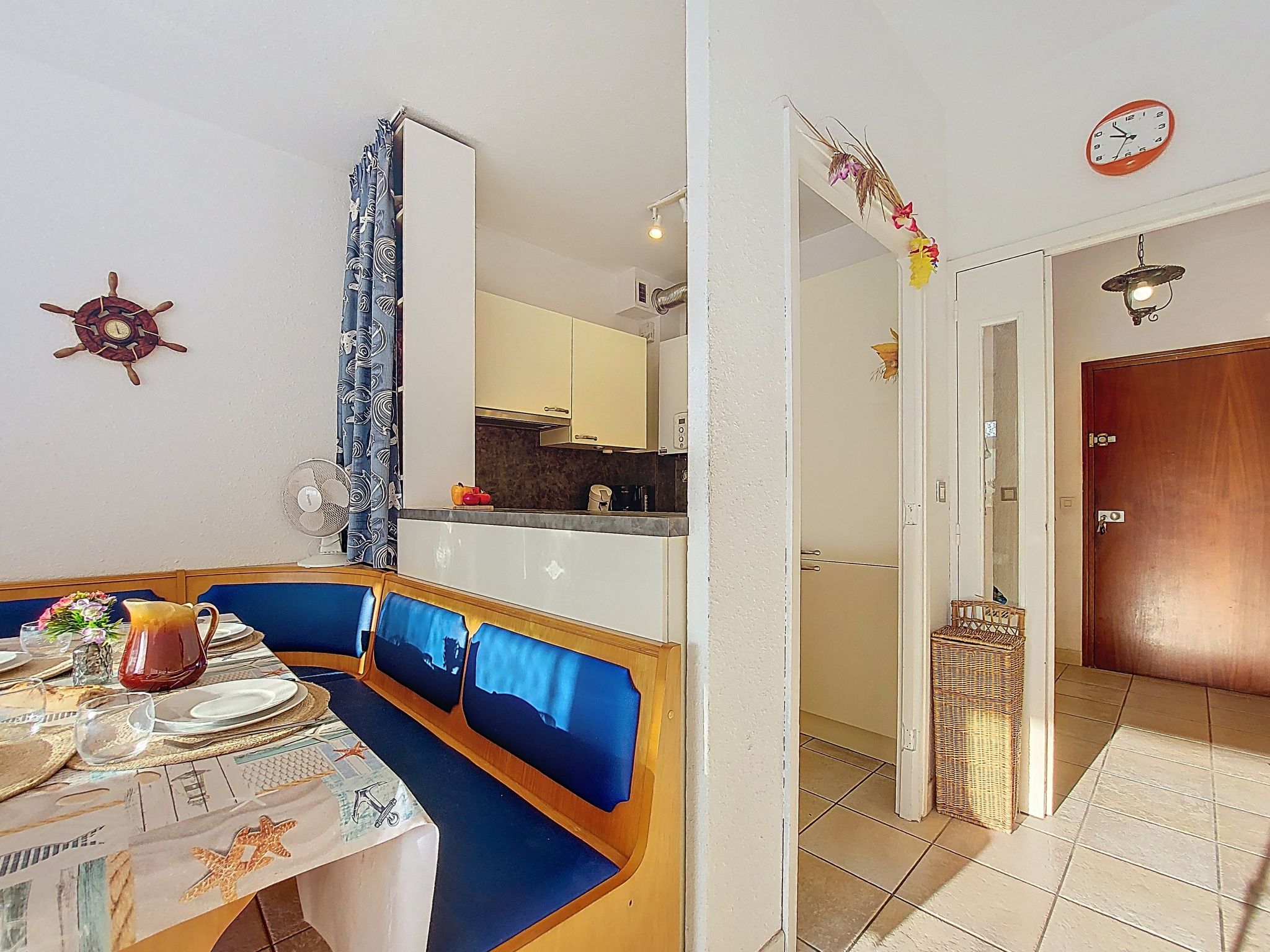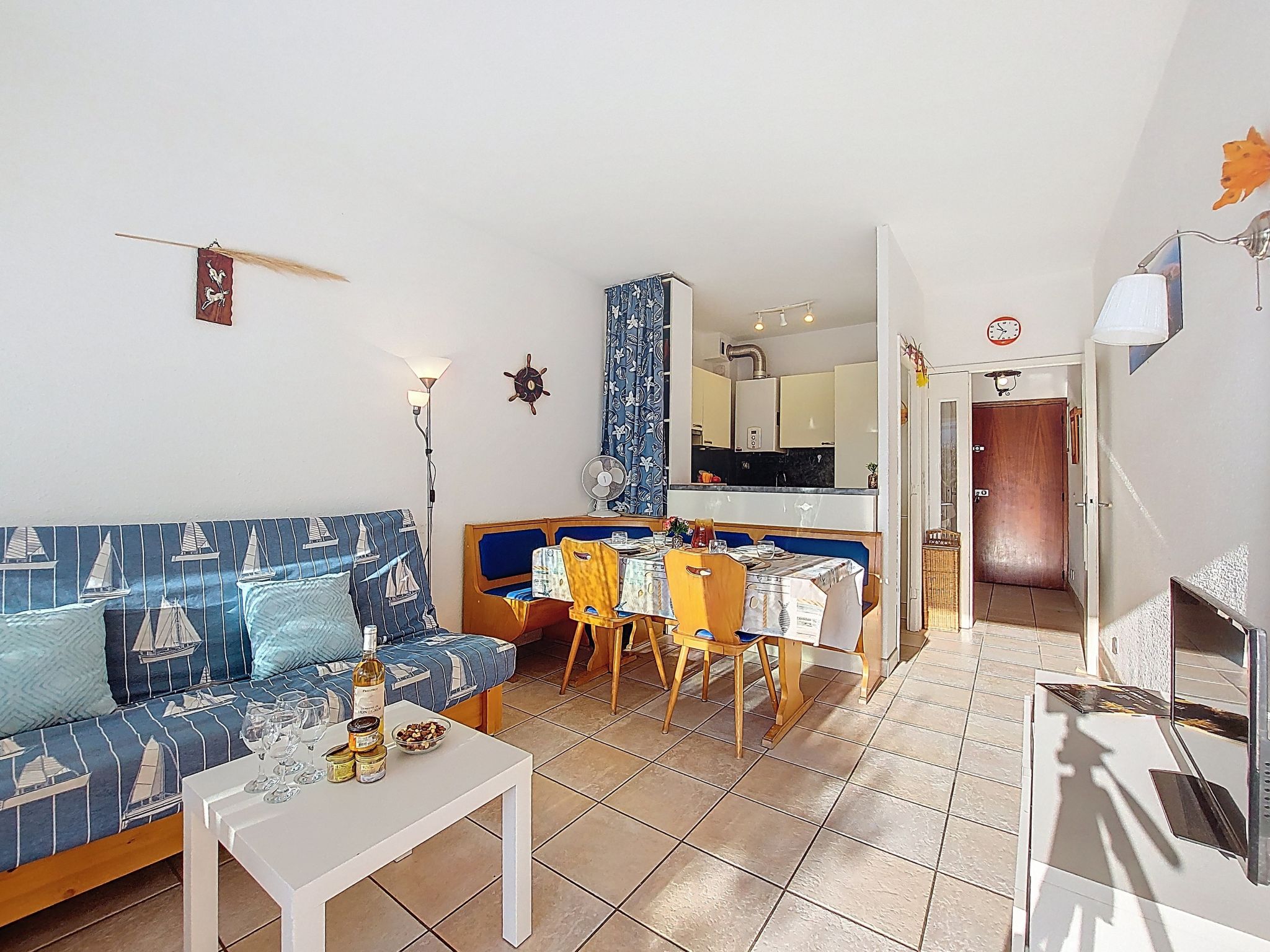 2-room apartment 42 m2 on 2 levels, on the ground floor. Living/dining room with 1 double sofabed (140 cm, length 185 cm), TV. Kitchenette (dishwasher, 3 ceramic glass hob hotplates, freezer, electric coffee machine, Capsules for coffee machine (Senseo) extra). Sep. WC. Upper floor: 1 room with 1 french bed (140 cm, length 190 cm). Bathroom. Heating. Terrace 10 m2, south-west facing position. Terrace furniture. View of the port. Facilities: washing machine. Internet (WiFi, extra). Parking. Please note: private mooring. Maximum 1 pet/ dog allowed. Smoke alarm. 30133001376V6
