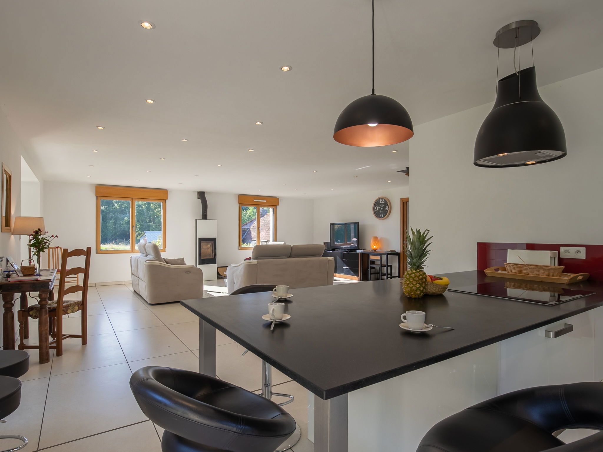 "Les Menhirs", 7-room house 170 m2 on 2 levels. Very comfortable and modern furnishings: living/dining room with veranda with dining table, satellite TV and radio. Exit to the terrace. 1 room with 1 french bed (160 cm, length 200 cm), shower. Kitchen-/living room (oven, dishwasher, 3 induction hot plates, toaster, kettle, microwave, freezer, electric coffee machine, Capsules for coffee machine (Cafetière à dosettes) extra, cooking island) with bar, open-hearth fireplace (only for decoration). Sep. WC. Upper floor: gallery with sloping ceilings with satellite TV. 1 room with 1 french bed (160 cm, length 200 cm). 2 rooms, each room with 2 beds (90 cm, length 200 cm). 1 room with 1 x 2 bunk beds (90 cm, length 190 cm). Shower, sep. WC. Heating. Large terrace 40 m2. Barbecue, deck chairs (10). Facilities: washing machine, dryer, children's high chair, baby cot. Internet (WiFi, free). Please note: non-smoking house. Maximum 2 pets/ dogs allowed. Smoke alarm. 6292 TREMAN
