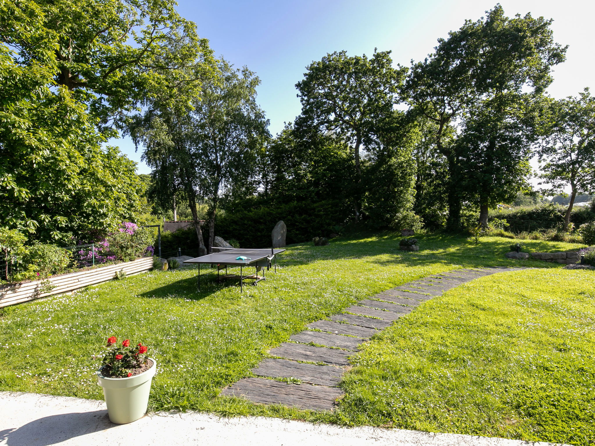 Very beautiful, comfortable single-family house "Les Menhirs", renovated in 2019, surrounded by trees and meadows. In the hamlet Lann Tréman 2.6 km from the centre of Ploumilliau, 5.8 km from the centre of Saint Michel-en-Grève, 7.7 km from the centre of Lannion, 6.2 km from the sea, in the countryside. For shared use: property 2'500 m2 (fenced). Private: beautiful, well-kept garden 400 m2 with lawn and wildlife garden, lawn for sunbathing, swimming pool secured (10 x 5 m, depth 140 cm, seasonal availability: 03.Apr. - 27.Nov.). Table tennis, garden furniture, barbecue, parking (for 5 cars) on the premises. Carport. Shop 2.6 km, bus stop 3 km, sandy beach 6.2 km. Owner lives in separate semi-detached house.