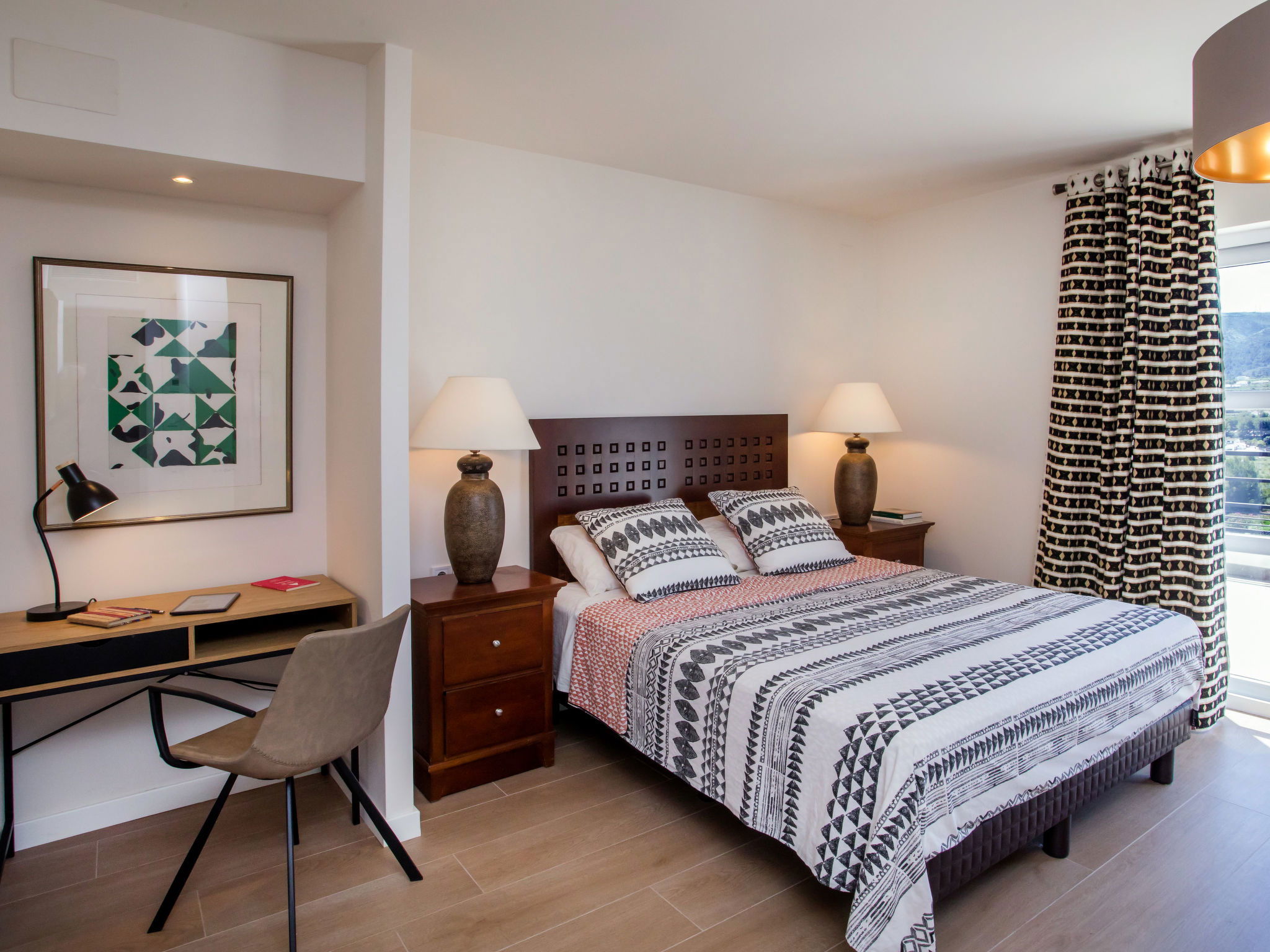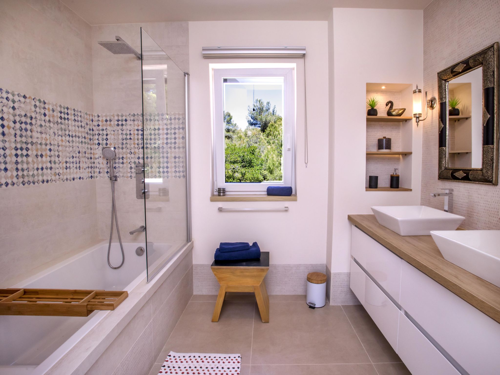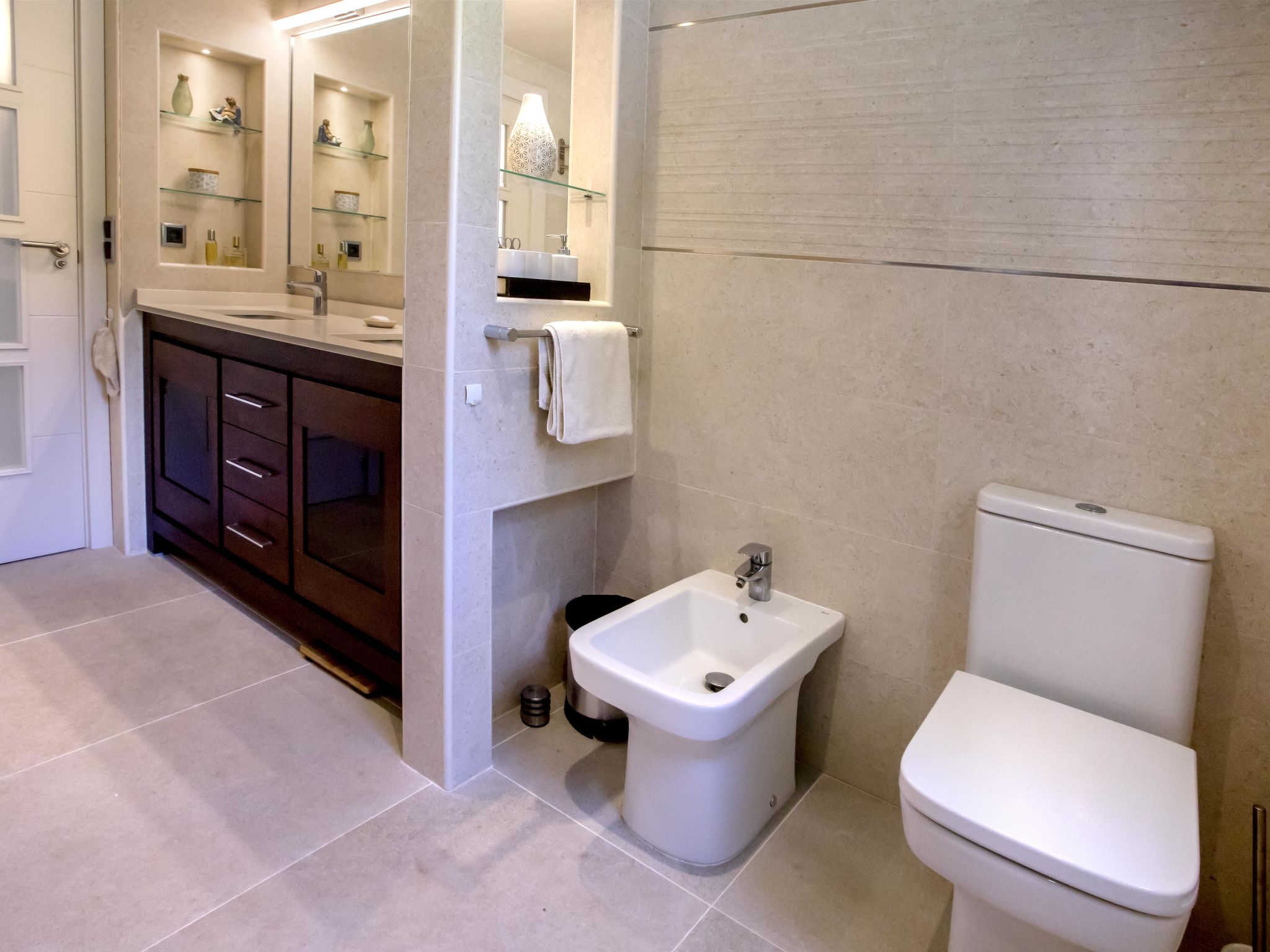 "Villa Almandrina", 6-room villa 270 m2 on 2 levels. Spacious and bright, very beautiful and stylish furnishings: living/dining room 50 m2 with digital TV, air conditioning and forced-air heating. Exit to the patio, to the swimming pool. Office with air conditioning and forced-air heating. Exit to the patio, to the swimming pool. 1 large room 38 m2 with 1 french bed (160 cm, length 200 cm), bath/shower/bidet/WC, double hand-basin, air conditioning and forced-air heating. Large, open kitchen (oven, dishwasher, 5 ceramic glass hob hotplates, toaster, kettle, microwave, freezer, electric coffee machine). Exit to the terrace. Sep. WC. Floor heating. Upper floor: 1 room 38 m2 with 1 french bed (2 x 100 cm, length 200 cm), shower/bidet/WC, air conditioning and forced-air heating. Exit to the terrace. 1 room 35 m2 with 1 french bed (160 cm, length 200 cm), shower/bidet/WC, double hand-basin, air conditioning and forced-air heating. Exit to the terrace. 1 room 32 m2 with 1 french bed (160 cm, length 200 cm), bath/bidet/WC, double hand-basin, air conditioning and forced-air heating. Exit to the terrace. 3 large terraces, large patio, south facing position, large garden. Terrace furniture, barbecue, deck chairs, covered balcony, sitting area. Marvellous panoramic view of the mountains and the valley. Facilities: washing machine, iron, children's high chair, baby cot for up to 2 year olds, hair dryer. Internet (WiFi, free). Parking (3 cars), garage. Please note: TV only ES. AT-502429-A