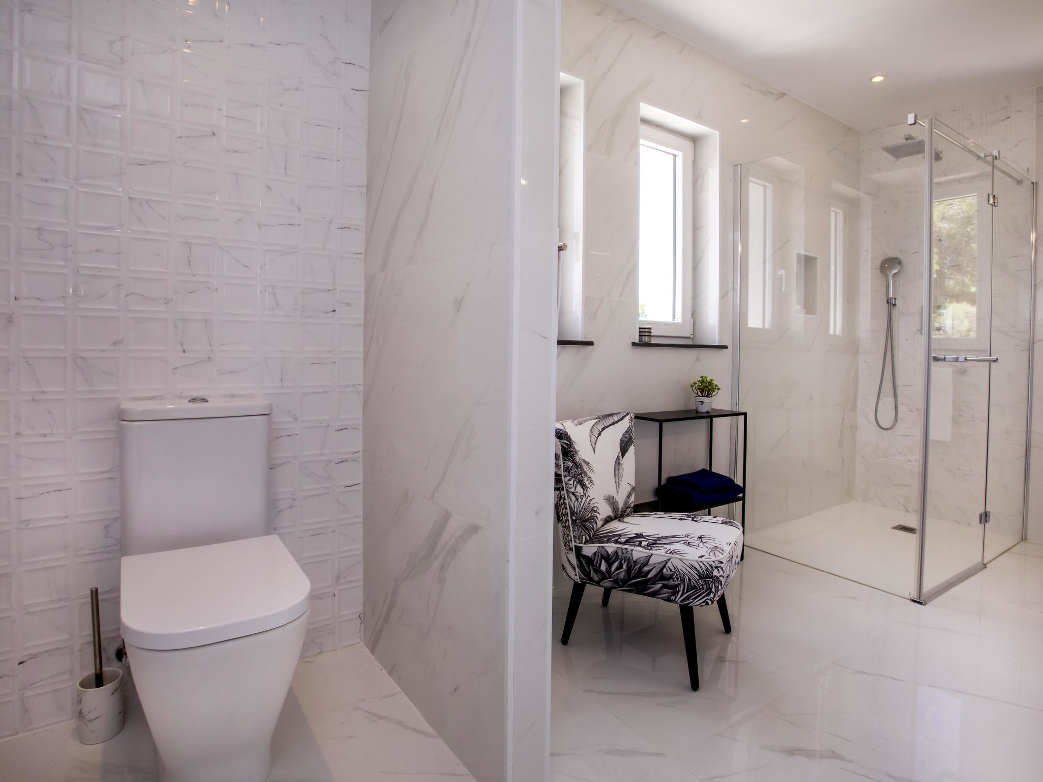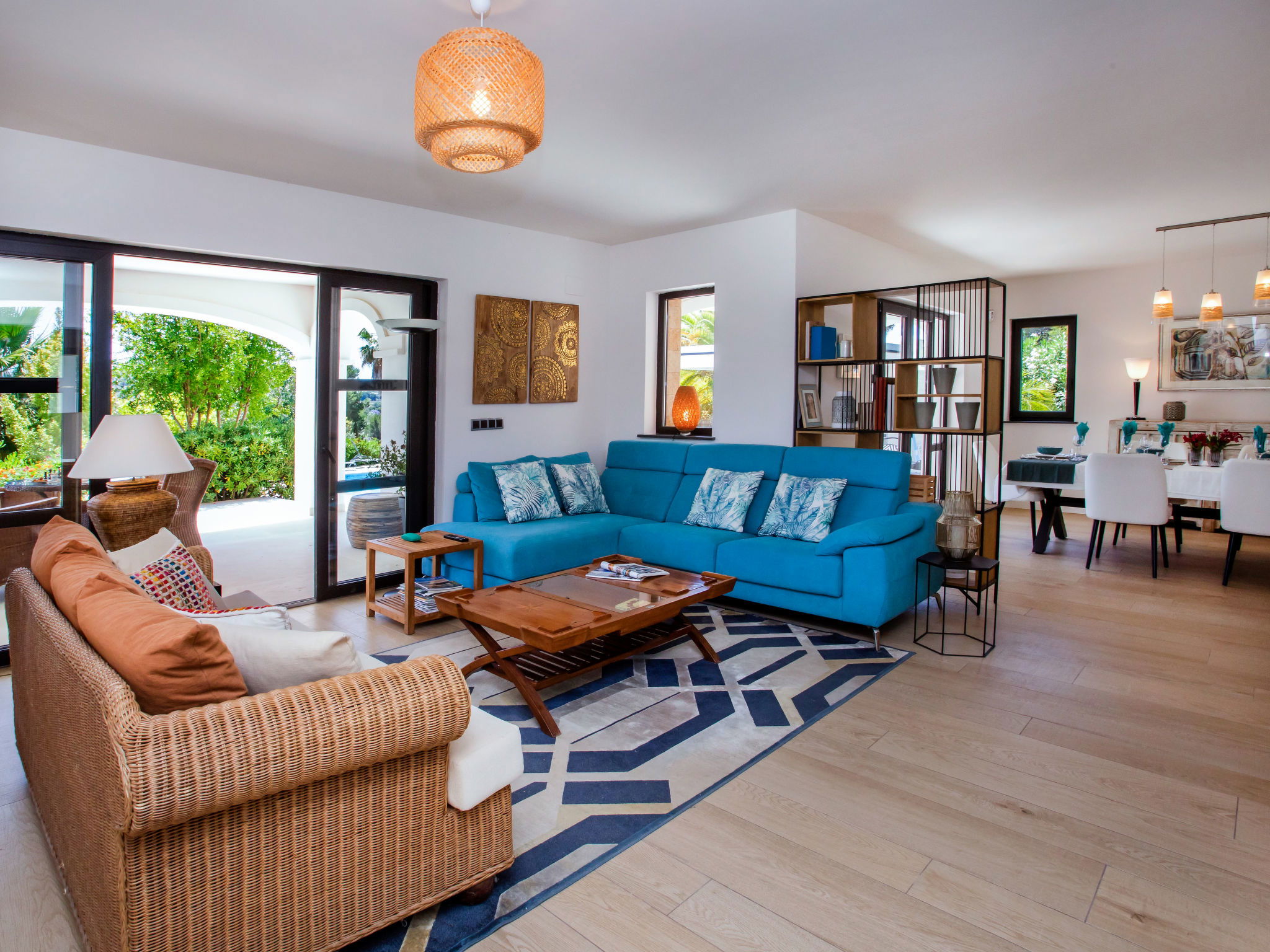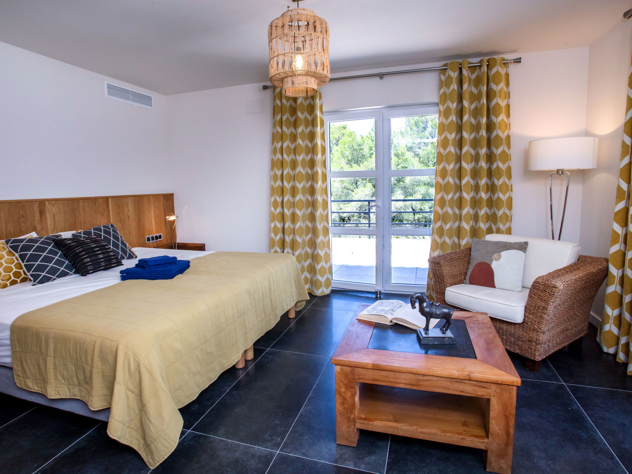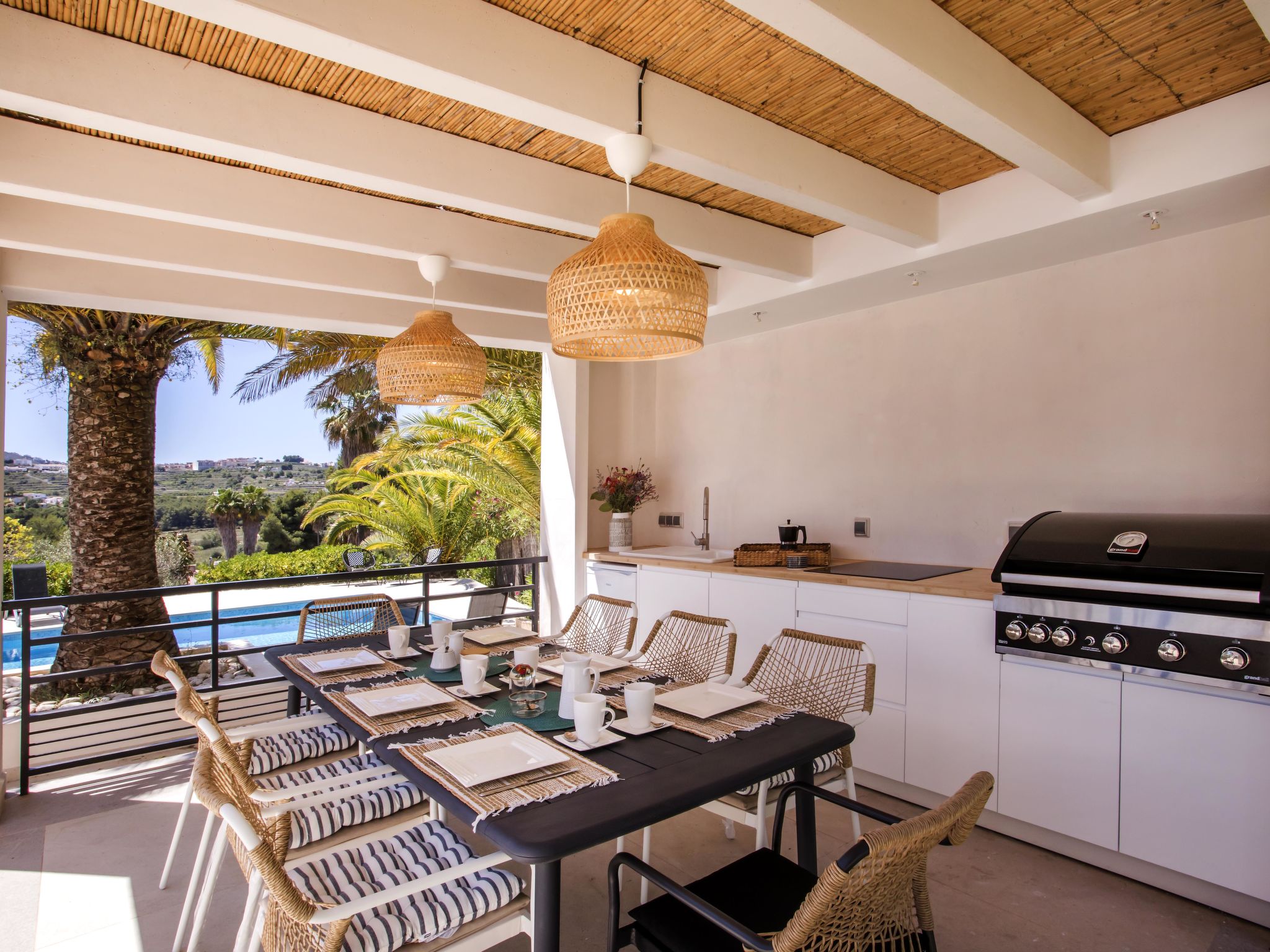 Very large, very modern, very luxurious villa "Almandrina", 2 storeys. In the district of La Lluca, in the resort 7 km from the centre of Javea - El Arenal, in a quiet, sunny position, 25 m from the edge of the forest, 7 km from the sea, 7 km from the beach. Private: property 2'000 m2 (fenced), large, beautiful, well-kept terraced garden with lawn and trees, swimming pool (10 x 5 m, depth 90 - 190 cm, seasonal availability: 01.Jan. - 31.Dec.) with internal staircase. Unconventional pool shape. Paddling pool, outdoor shower, pool house with fridge and cooking stove, pergola, garden furniture, barbecue house. In the house: air conditioning, laundry, washing machine. Parking on the premises, single garage. Shop 9 km, supermarket 2 km, shopping centre 20 km, restaurant 3 km, café 3 km, internet café 7 km, bus stop 7 km, sandy beach "Playa del Arenal" 7 km, shingle beach "Playa de Portitchol" 13 km, diving center 7 km. Sports harbour 7 km, golf course (9 hole) 2 km, surf school 7 km, sailing school 7 km, tennis 3 km, riding stable 10 km. Nearby attractions: Aqualandia Benidorm 40 km, Oceanografico Valencia 110 km. Hiking paths: Portichol 10 km. The owner does not accept any youth groups. Neighbourhood highly sensitive to noise. Quietness and good behaviour expected.