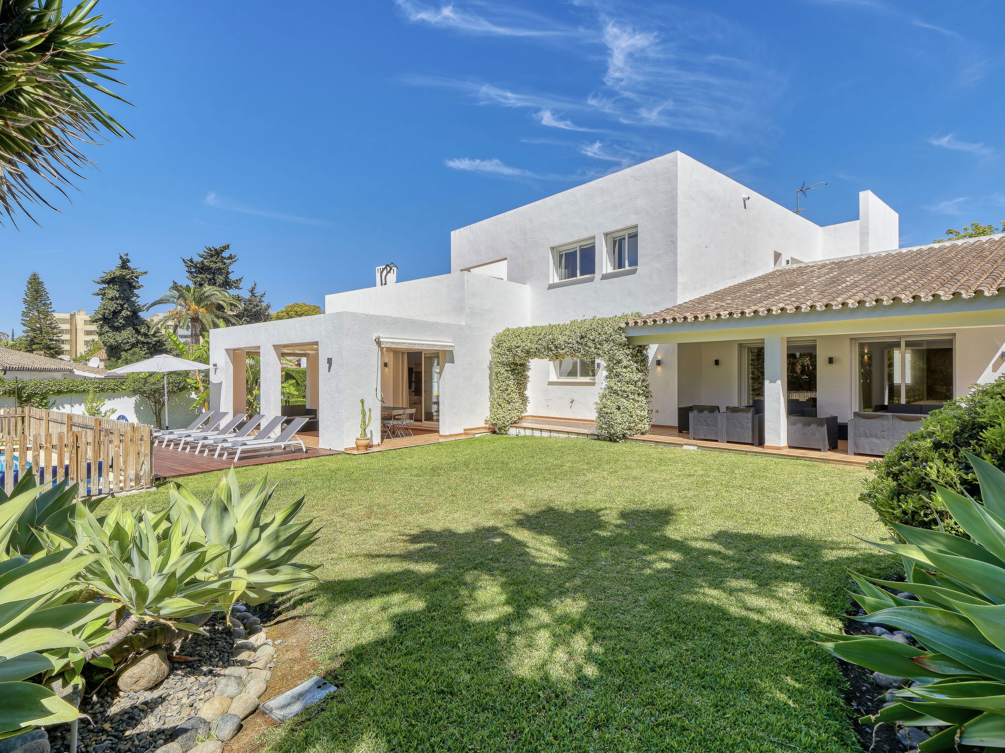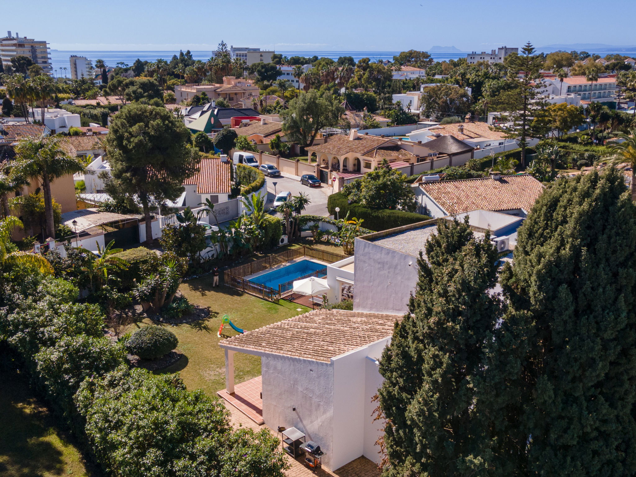 Atalaya 14 km from Estepona: Cosy, comfortable house "Villa Marina", 2 storeys, detached, renovated in 2023. 750 m from the sea, 750 m from the beach, south facing position. Private: property 1'263 m2 (fenced), garden with lawn, swimming pool angular (8 x 4 m, depth 120 - 200 cm, seasonal availability: 01.Jan. - 31.Dec.) with internal staircase. Supermarket 700 m, restaurant 500 m, bicycle rental 7.2 km, bus stop "Estación autobuses Marbella" 14.9 km, railway station "Estación de tren Fuengirola" 46.1 km, sandy beach "Playa del Saladillo" 5.7 km pebble beach "Playa San Pedro de Alcántara" 4.2 km. Marina 6.8 km, golf course (36 hole) 3.8 km, surf school 7.6 km, riding stable 7.5 km. Nearby attractions: Selwo Aventura 9.9 km, Orchidarium Estepona 15.7 km, Roman Villa & Roman Baths 8.1 km, Gibraltar 61.6 km, Marbella Center 14.1 km, Caminito del Rey 85.9 km. Well-known lakes can easily be reached: Lago de Las Tortugas 11 km, Reserva Natural Laguna Fuente de Piedra 140 km. Hiking paths: Senda Litoral Atalaya Isdabe - Marbella 12 km, Senda Estepona -Atalaya Isdabe - 11 km, Senda Atalaya Isdabe-Acequia Guadalmina 14 km. The owner does not accept any youth groups. Neighbourhood highly sensitive to noise. Quietness and good behaviour expected.