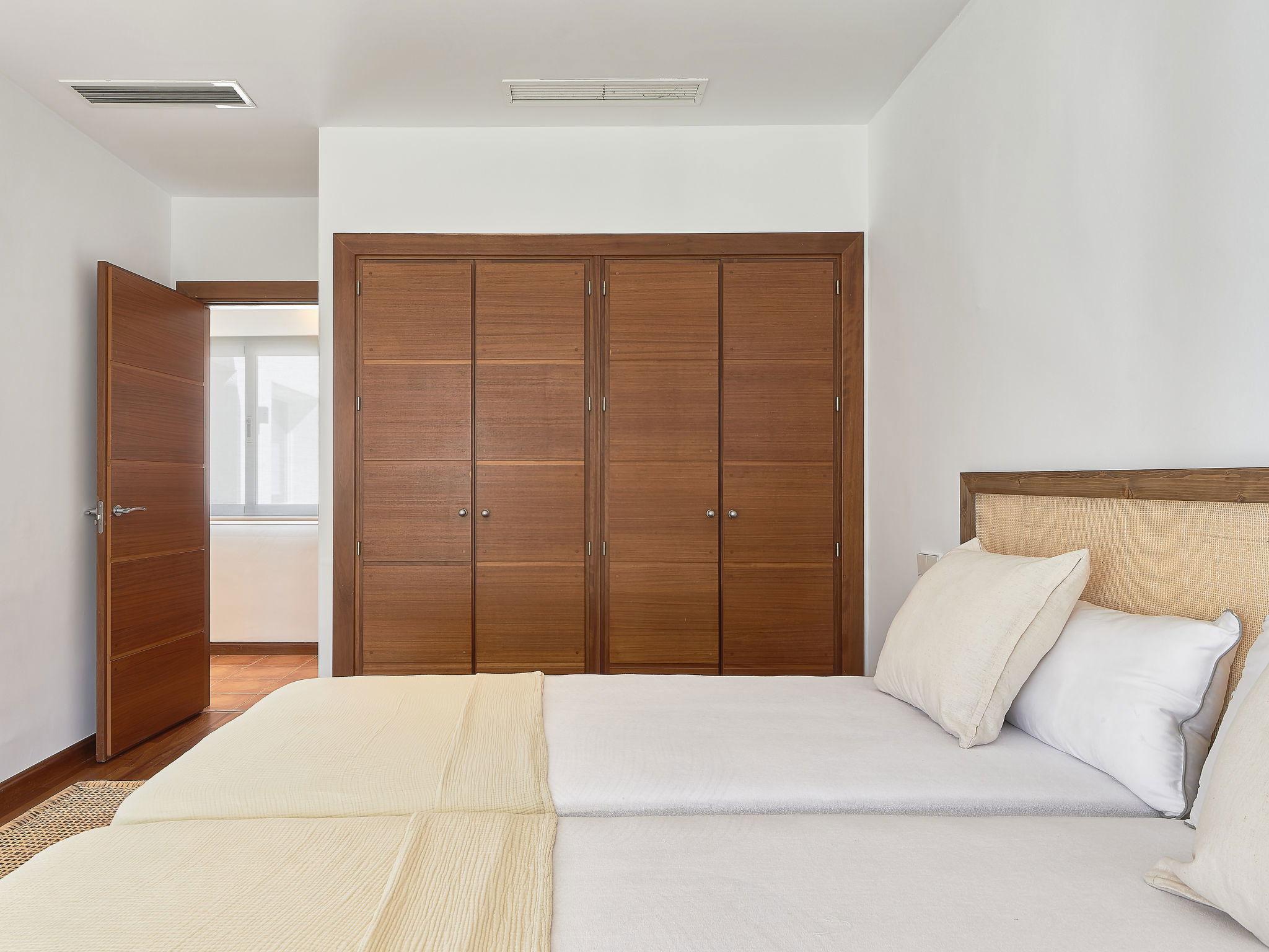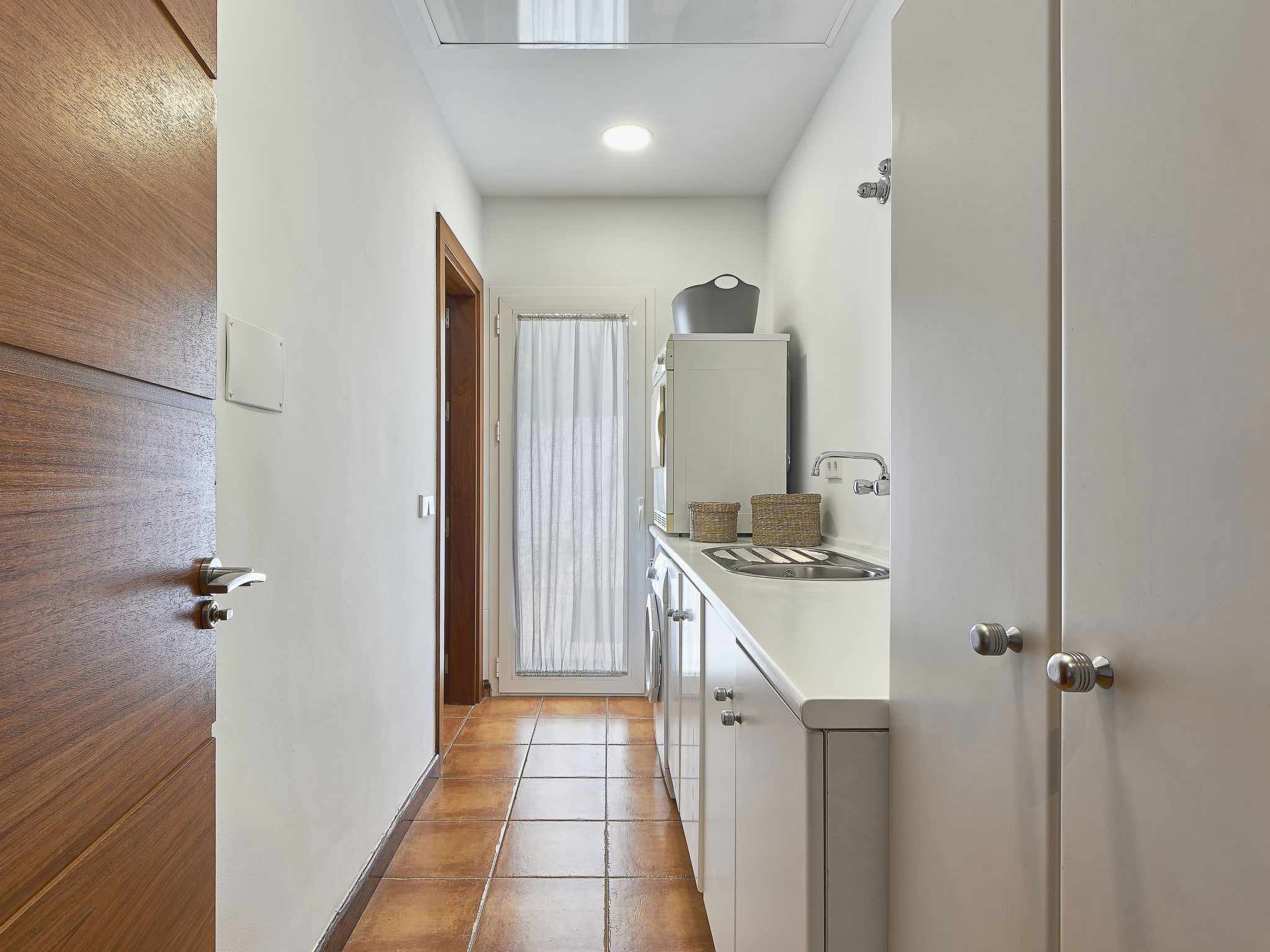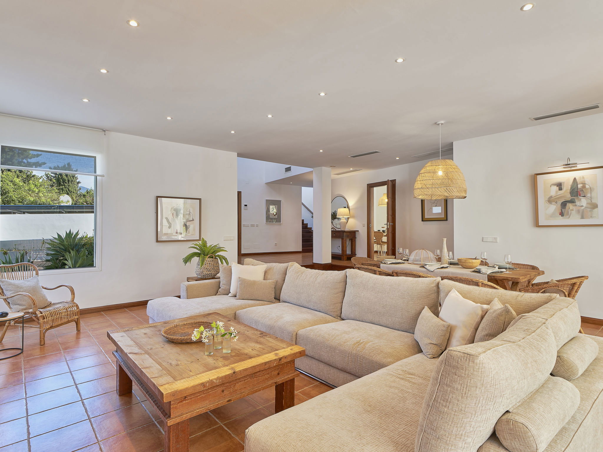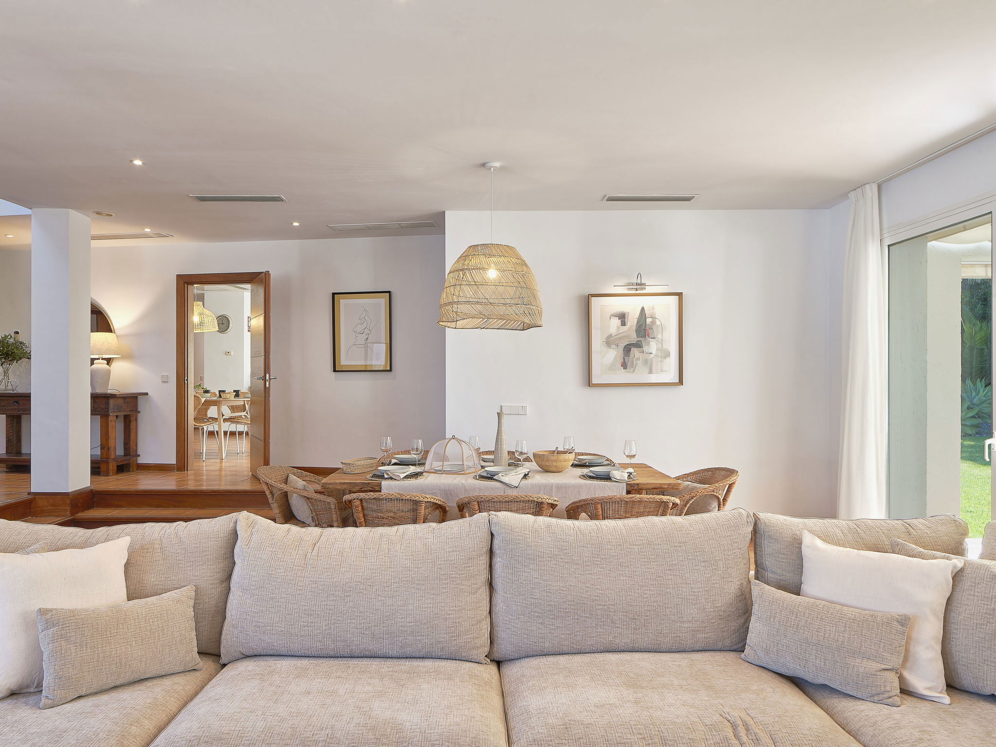 "Villa Marina", 7-room villa 235 m2 on 2 levels. Practical and comfortable furnishings: entrance hall. Living/dining room with open-hearth fireplace (only for decoration), digital TV, air conditioning and forced-air heating. Exit to the terrace. 1 room with 1 french bed (150 cm, length 200 cm), bathroom, air conditioning and forced-air heating. 2 rooms, each room with 2 beds (90 cm, length 200 cm), air conditioning and forced-air heating. 1 room with 1 bed (90 cm, length 200 cm), air conditioning and forced-air heating. Kitchen (oven, dishwasher, 4 ceramic glass hob hotplates, toaster, microwave, freezer, electric coffee machine, Capsules for coffee machine (Nexpresso) extra). Bathroom. Air-conditioning. Upper floor: 1 room with 2 beds (90 cm, length 200 cm), bathroom, air conditioning and forced-air heating. 1 room with 1 french bed (180 cm, length 200 cm), air conditioning and forced-air heating. 2 large terraces. Terrace furniture, barbecue, deck chairs (8), covered balcony. Facilities: washing machine, iron, children's high chair, baby cot, hair dryer. Internet (WiFi, free). Parking (2 cars) at the house. Please note: suitable for families. Fire extinguisher, no lift. VUT/MA/63771 // Reg. Nr.: ESFCTU0000290370001960560000000000000000VFT/MA/637712