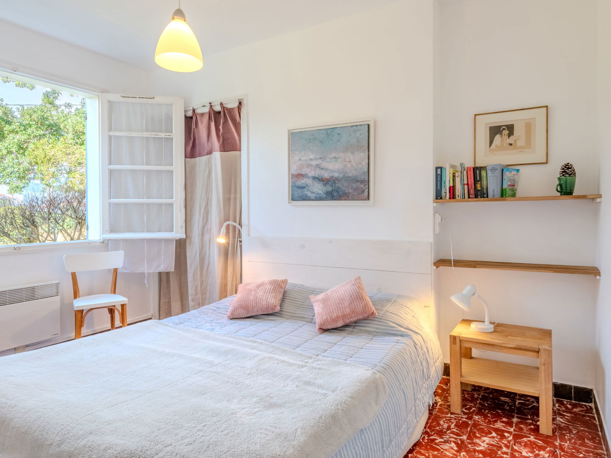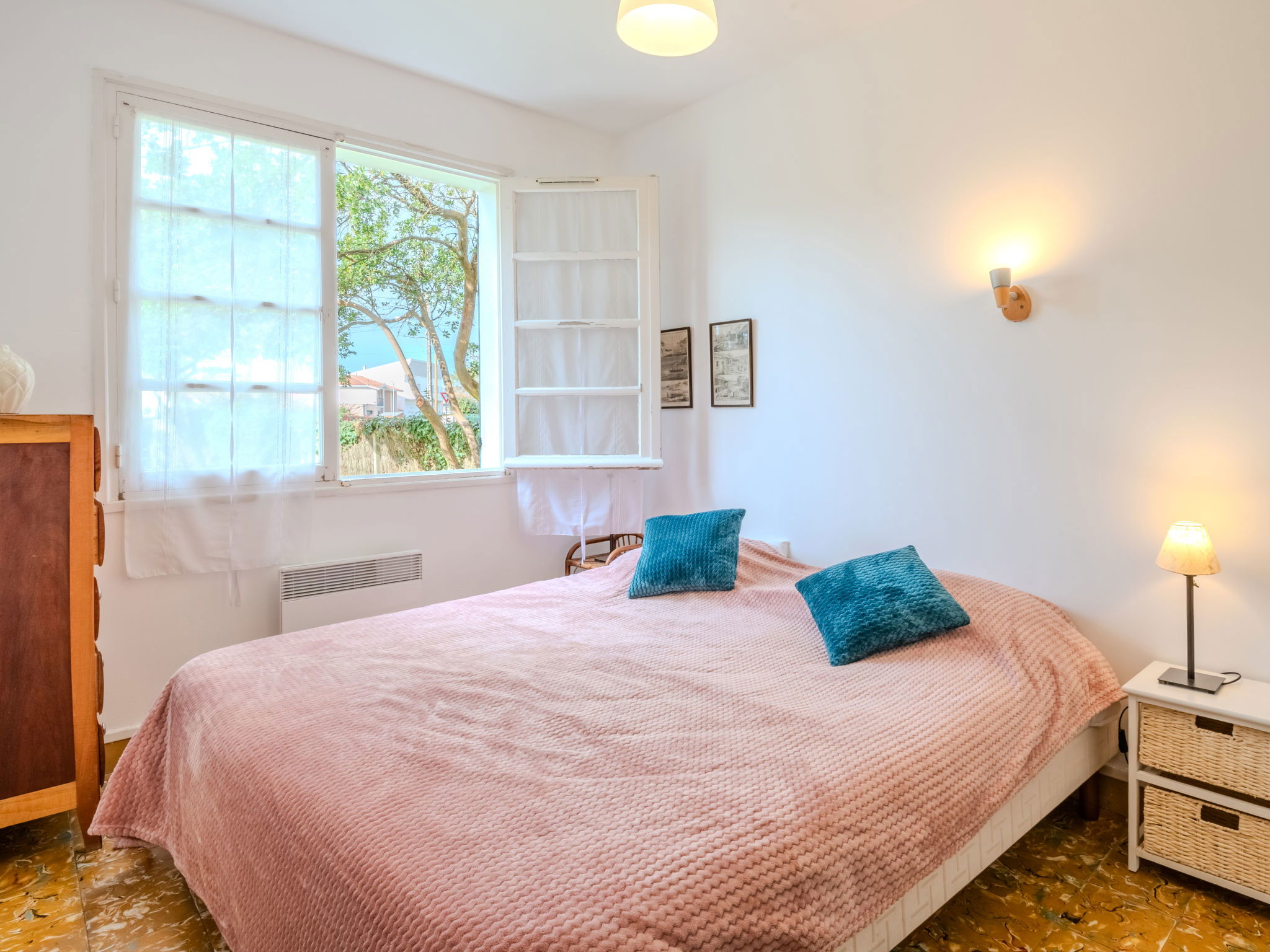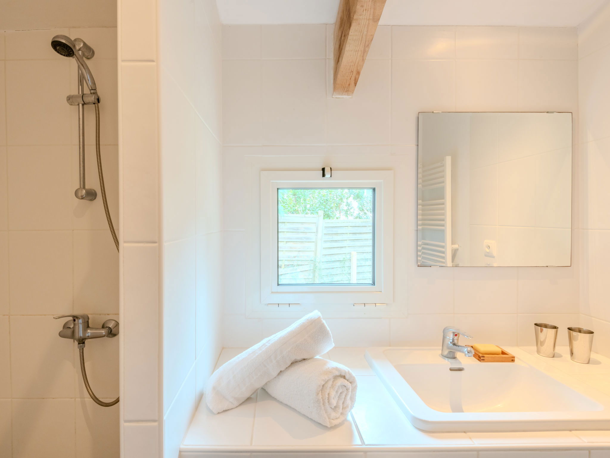 5-room house 100 m2. Beautiful furnishings: living room with satellite TV and international TV channels (flat screen), hi-fi system and DVD. Exit to the terrace. Dining room. Exit to the terrace. 1 room with 1 french bed (160 cm). 1 room with 1 french bed (160 cm), shower. Exit to the terrace. 1 room with 2 beds (90 cm, length 190 cm). Kitchen (4 hot plates, oven, dishwasher, microwave, electric coffee machine, Capsules for coffee machine (filtre + nespresso) extra). Exit to the terrace. Shower/WC, sep. WC. Electric heating. Terrace roofed terrace. Terrace furniture, deck chairs (4). Facilities: washing machine. Internet (WiFi, extra). Please note: maximum 1 pet/ dog allowed. Smoke alarm.