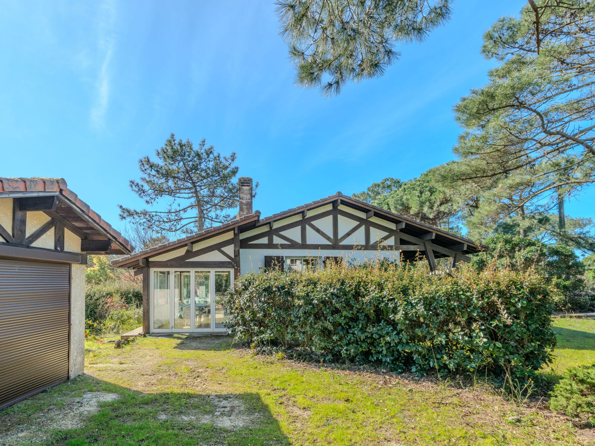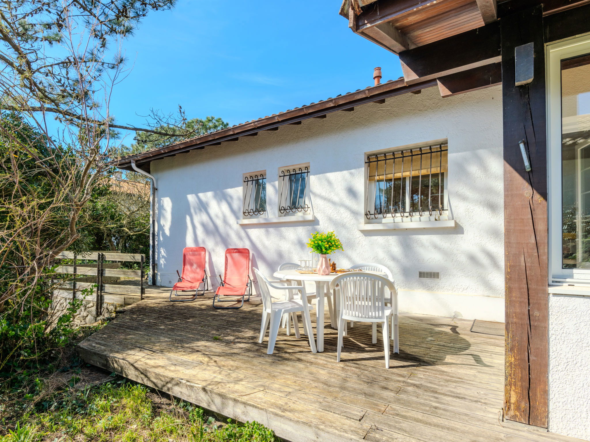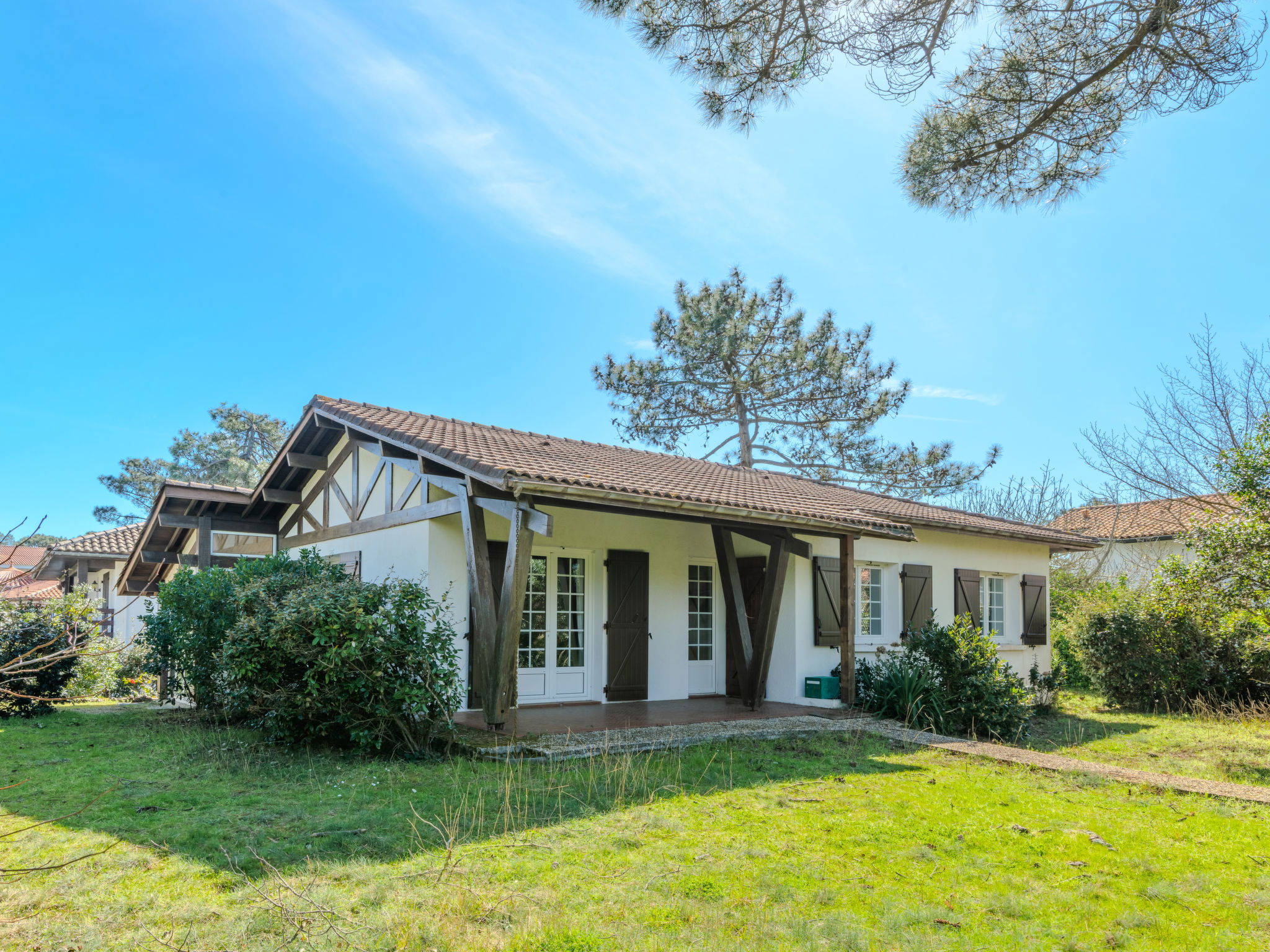 Single-family house "Promenade des Pins". In the resort 1 km from the centre of Mimizan-Plage, 500 m from the edge of the forest, 500 m from the sea, 500 m from the beach. Private: natural state property 1'000 m2 (fenced), parking on the premises. Grocery 1.5 km, supermarket 1.5 km, restaurant 1.2 km, bakery 1.5 km, pedestrian zone 1.5 km, bus stop "Office de tourisme" 1.3 km, railway station "Labouheyre" 30 km, sandy beach "Sud" 500 m, indoor swimming pool 6 km, bathing lake "Aureilhan" 10 km. Golf course (9 hole) 6 km, surf school 600 m, riding stable 7 km, cycle lane 500 m. Nearby attractions: Arcachon 70 km, Bordeaux 120 km, Biscarosse 40 km, Centre Nautique 7 km, Casino Mimizan Plage. Hiking paths: Parc naturel régional des Landes.