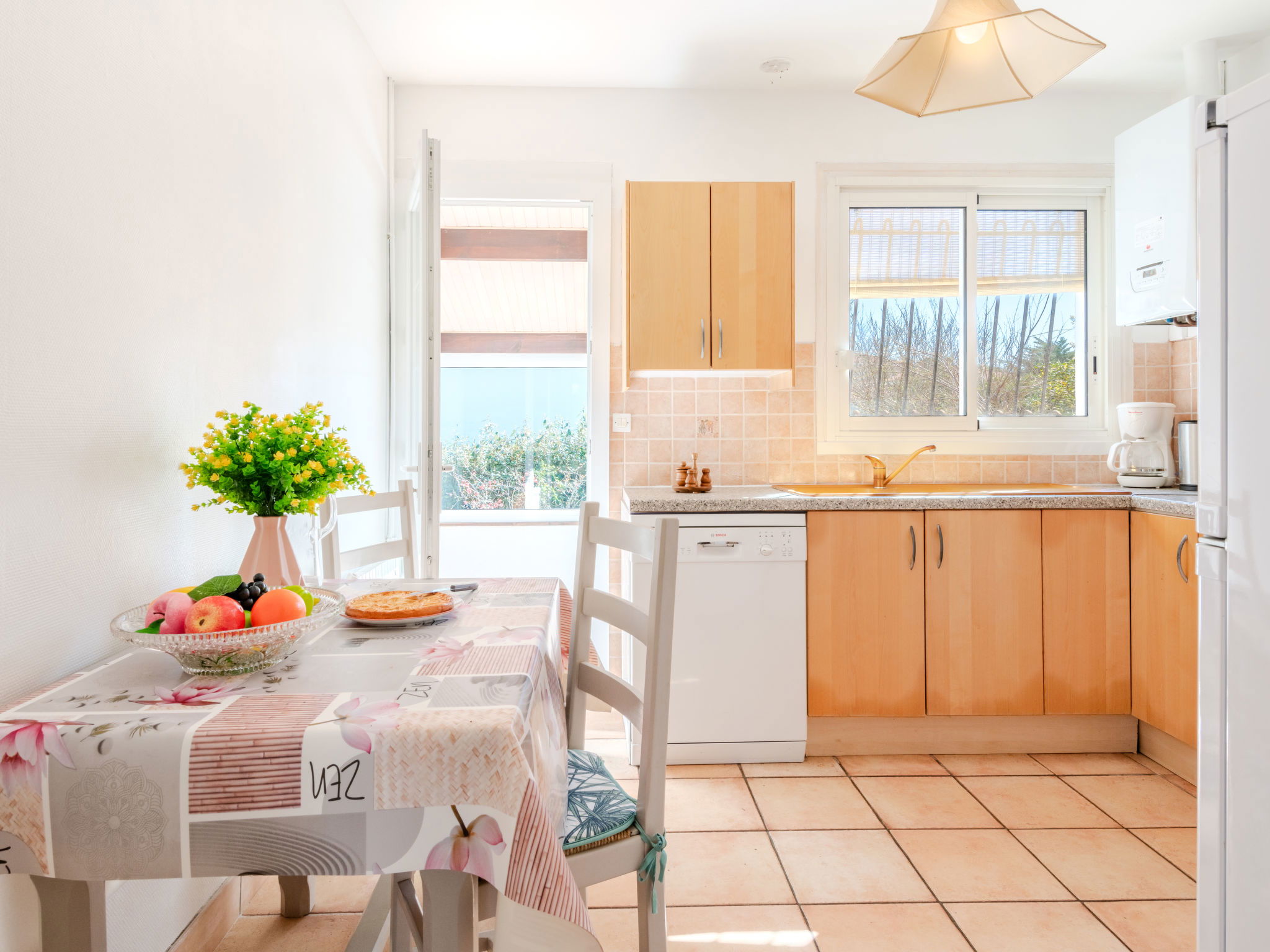 4-room house 95 m2. Rustic and antique furnishings: living/dining room with satellite TV and international TV channels (flat screen), hi-fi system and DVD. Exit to the terrace. 2 rooms, each room with 1 french bed (1 x 140 cm, length 190 cm). 1 room with 2 beds (90 cm, length 190 cm). Kitchen (4 hot plates, oven, dishwasher, microwave). Exit to the veranda. Shower, sep. WC. Gas heating. Terrace roofed, north facing position terrace, south facing position. Terrace furniture, barbecue, deck chairs (4). Facilities: washing machine. Internet (WiFi, extra). Please note: maximum 1 pet/ dog allowed. Smoke alarm.