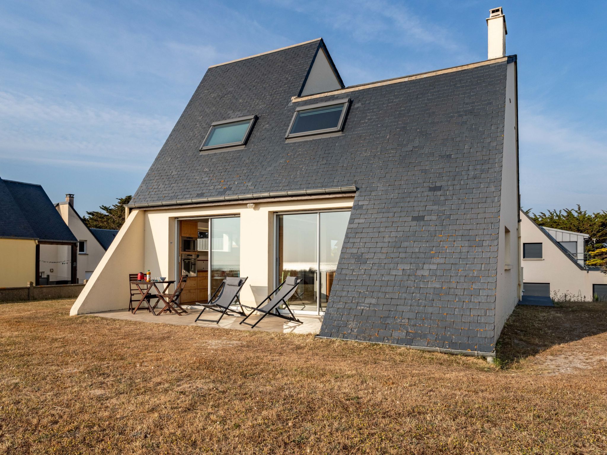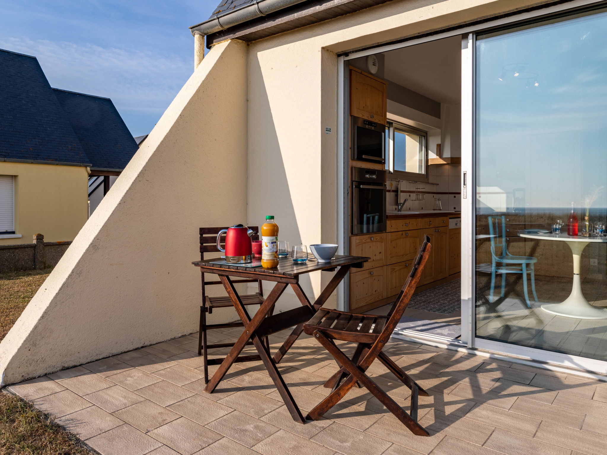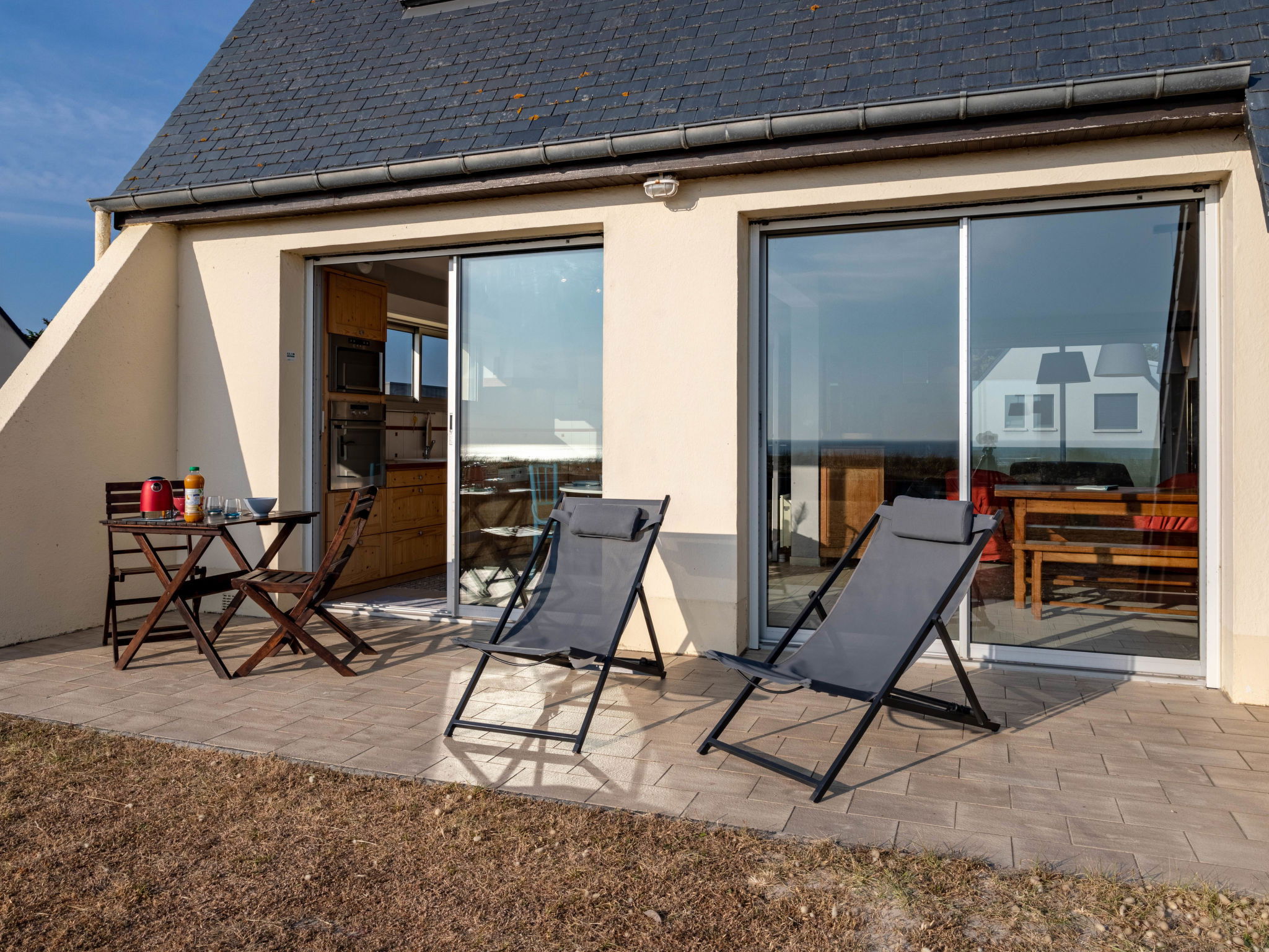 "Le Saint Germ", 2-room house 70 m2. Bright, beautiful and tasteful furnishings: living/dining room with open-hearth fireplace (only for decoration), dining table, TV and DVD. Exit to the terrace. 1 room with 1 french bed and shower. Exit to the terrace. Open kitchen (oven, dishwasher, 4 induction hot plates, toaster, kettle, microwave, freezer, electric coffee machine). Sep. WC. Electric heating. Terrace. Terrace furniture, deck chairs (2). View of the sea. Facilities: iron. Internet (WiFi, free). Please note: non-smoking house.