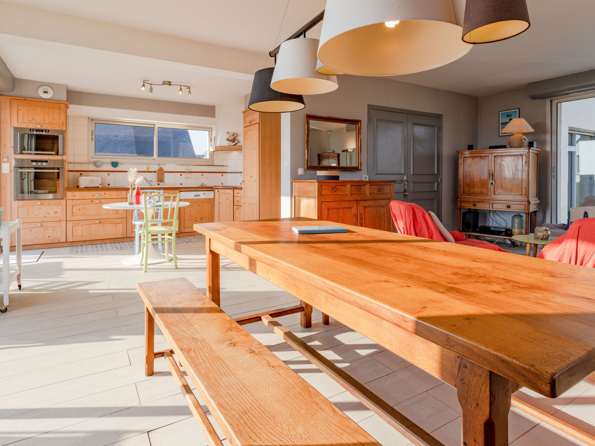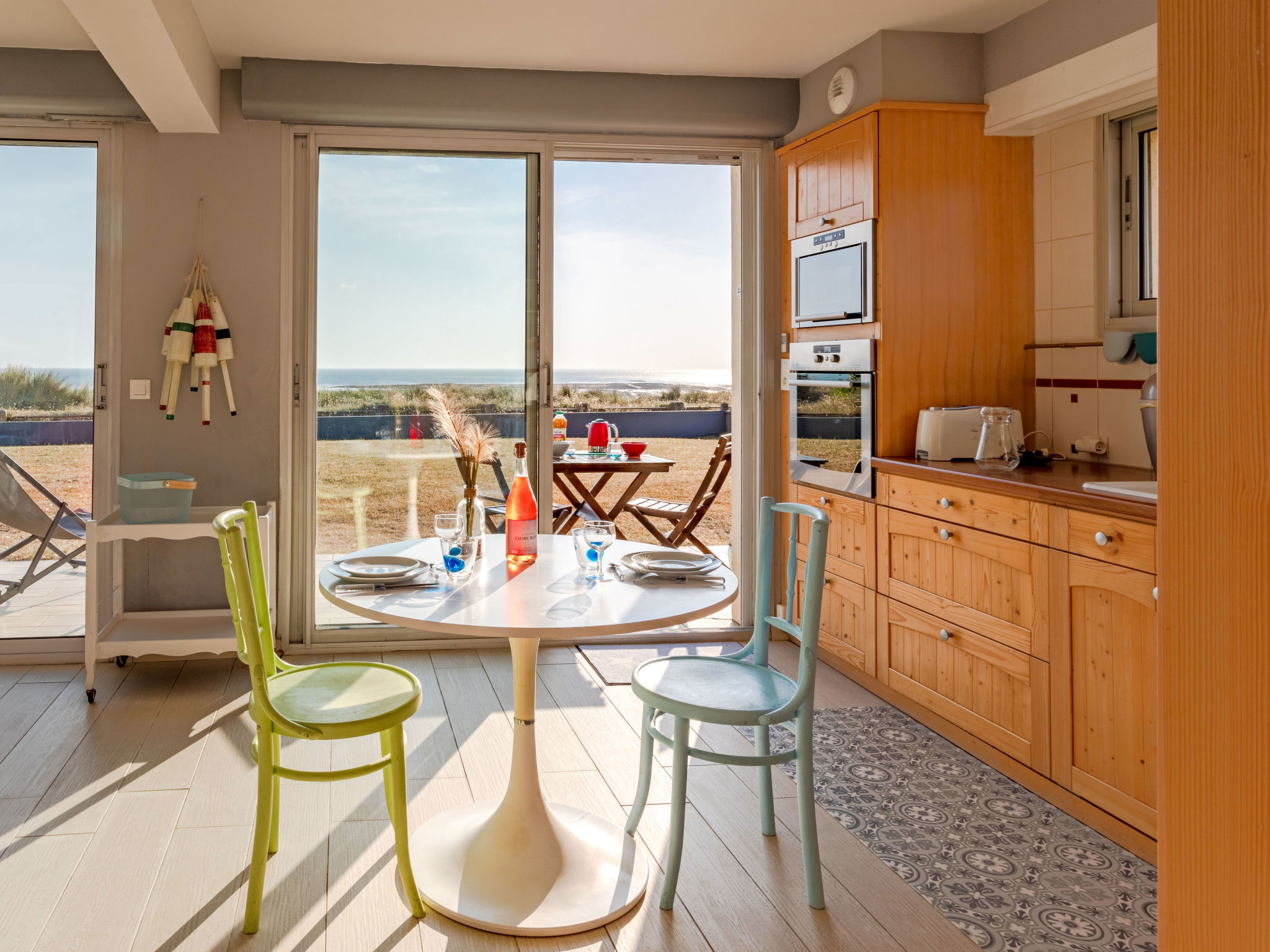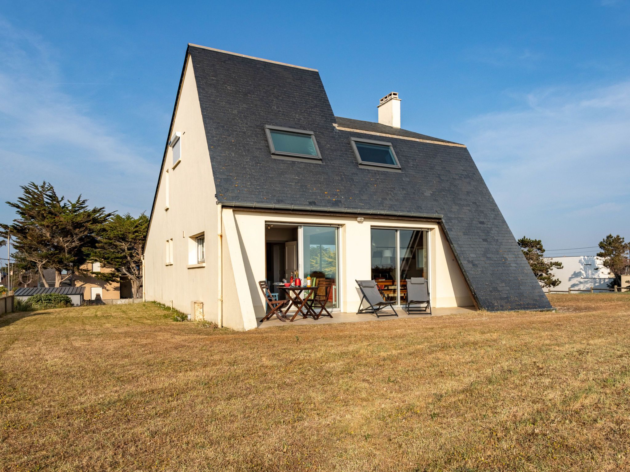 "Le Saint Germ", 2-room house 70 m2. Bright, beautiful and tasteful furnishings: living/dining room with open-hearth fireplace (only for decoration), dining table, TV and DVD. Exit to the terrace. 1 room with 1 french bed and shower. Exit to the terrace. Open kitchen (oven, dishwasher, 4 induction hot plates, toaster, kettle, microwave, freezer, electric coffee machine). Sep. WC. Electric heating. Terrace. Terrace furniture, deck chairs (2). View of the sea. Facilities: iron. Internet (WiFi, free). Please note: non-smoking house.