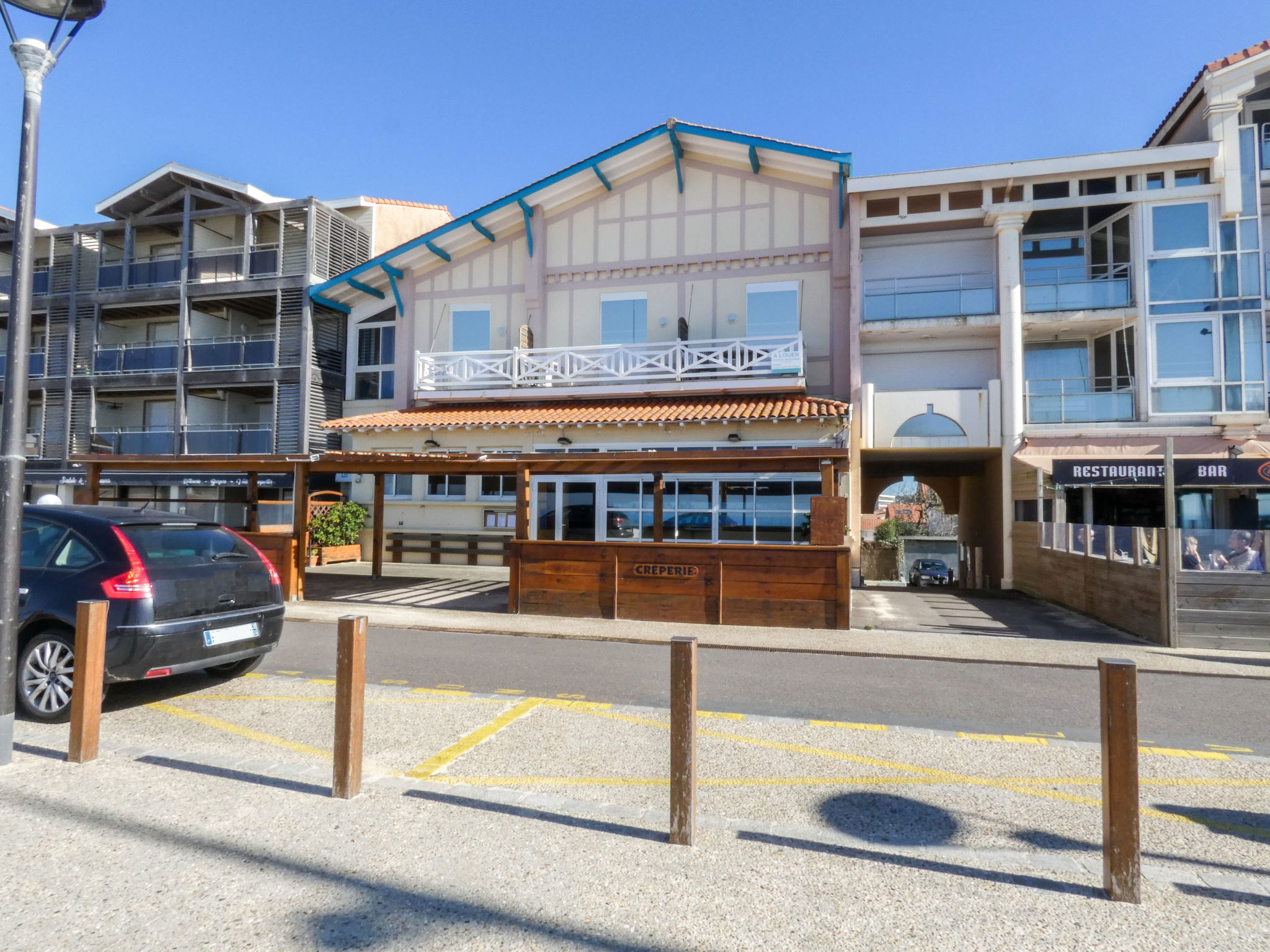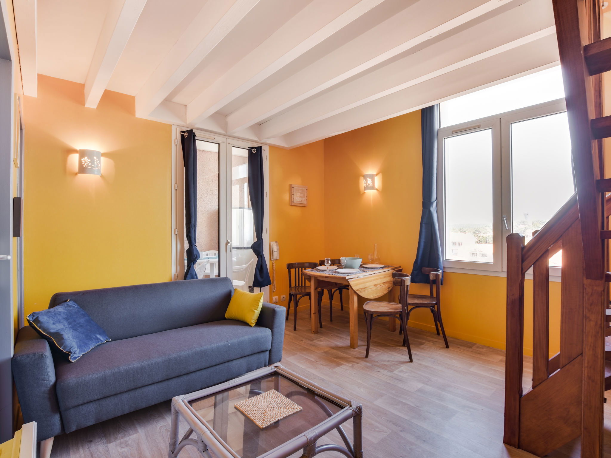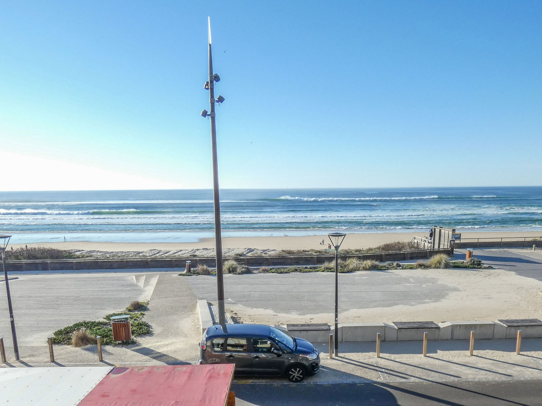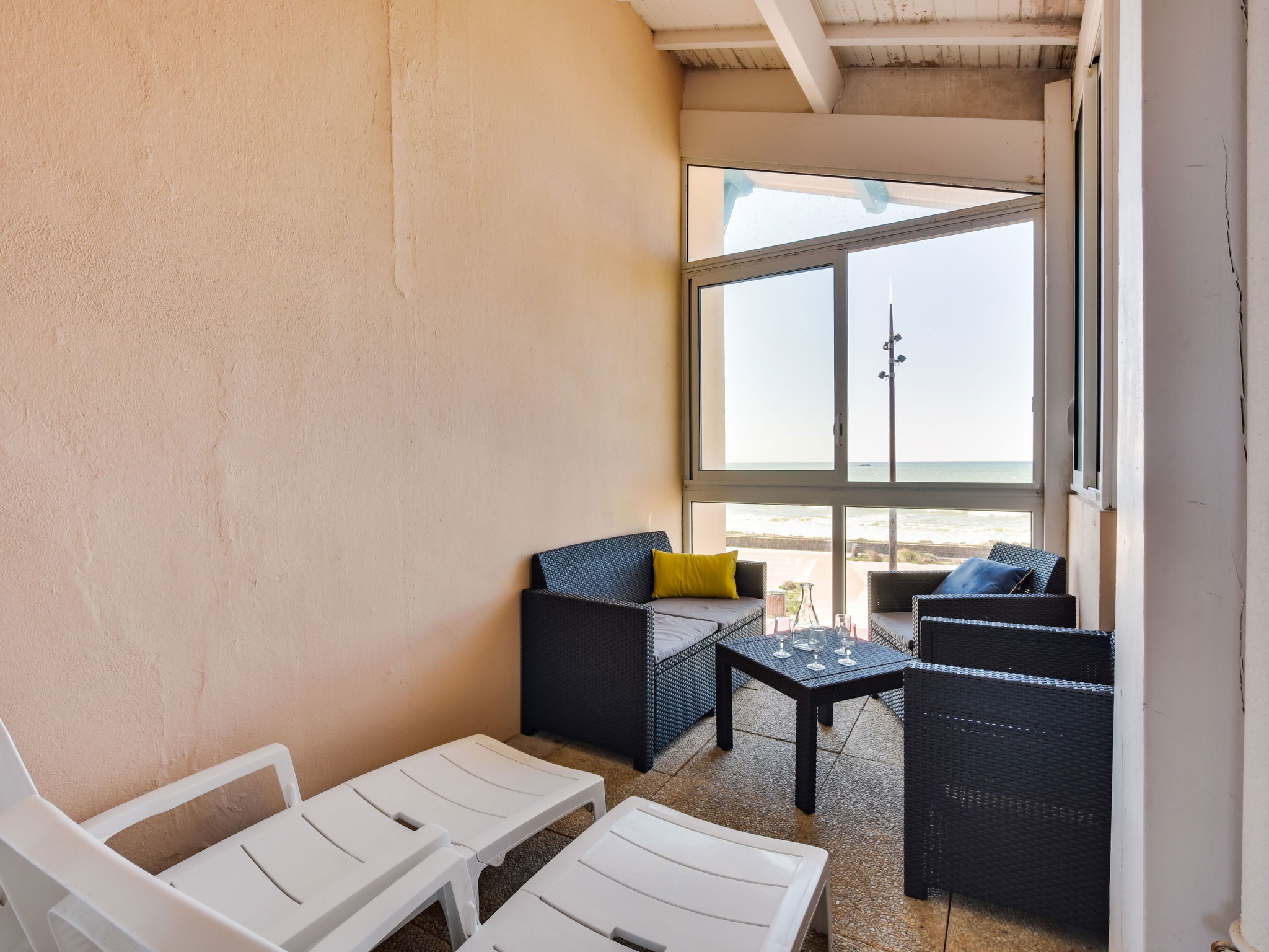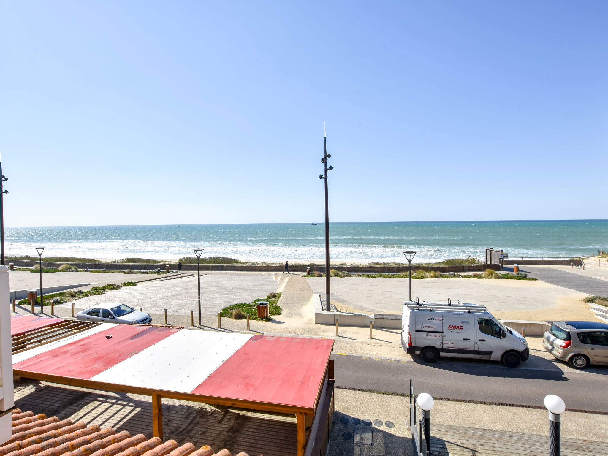 1-room studio 35 m2 on 2 levels on 1st floor. Object suitable for 2 adults + 2 children. Open small living/dining room 17 m2 with TV (flat screen). Exit to the loggia. Alcove with 1 x 2 bunk beds (80 cm, length 190 cm). Kitchenette (2 hot plates, microwave, electric coffee machine). Sep. WC. Electric heating. Upper floor: (steep stair) open gallery with sloping ceilings with 2 beds (90 cm). Shower. Electric heating. Terrace furniture, covered balcony. Partial view of the ocean. Facilities: Internet (WiFi, extra). Parking space n D grand large (roofed, 1 car). Please note: maximum 1 pet/ dog allowed. TV only FR. Smoke alarm. Instead of an enclosed bedroom, some sleeping areas are located in an open-plan area (gallery, alcove, etc.).