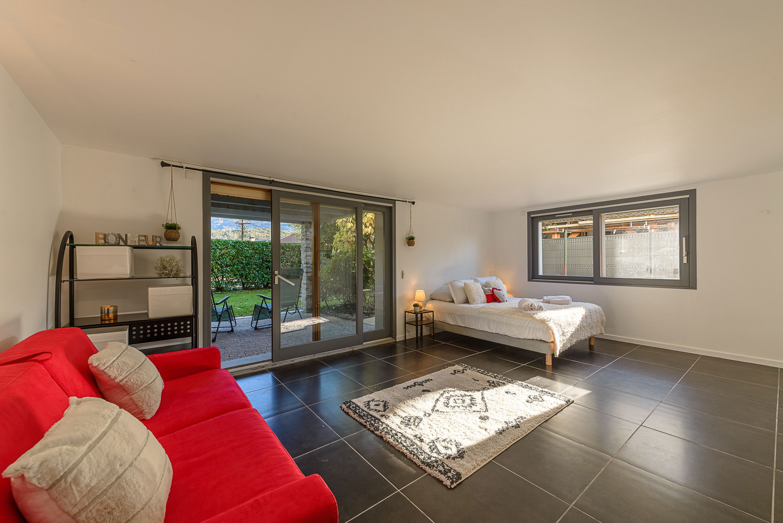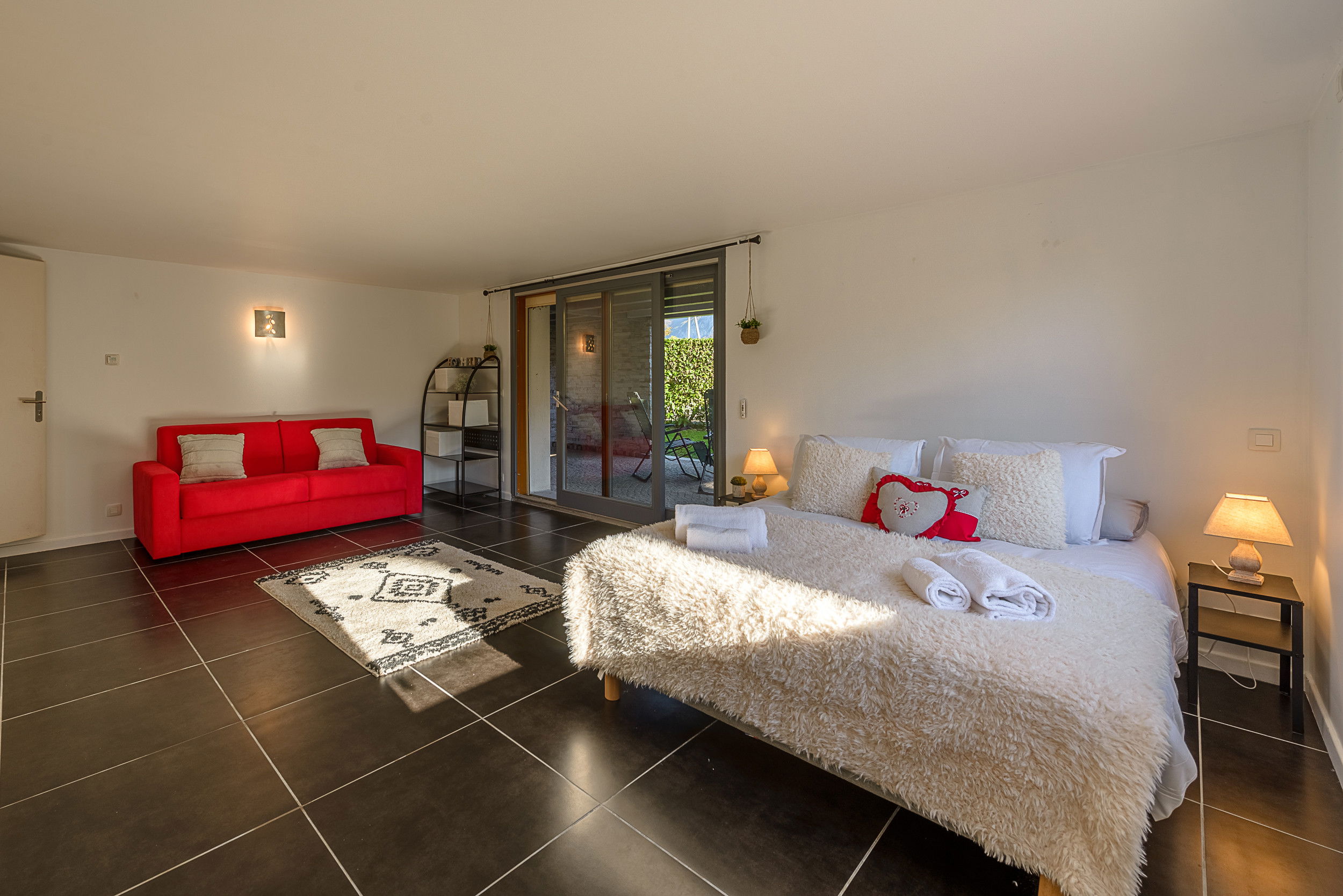 - Bedroom n°2 : Queensize bed with ensuite shower room and wc, electric shutters and direct garden access