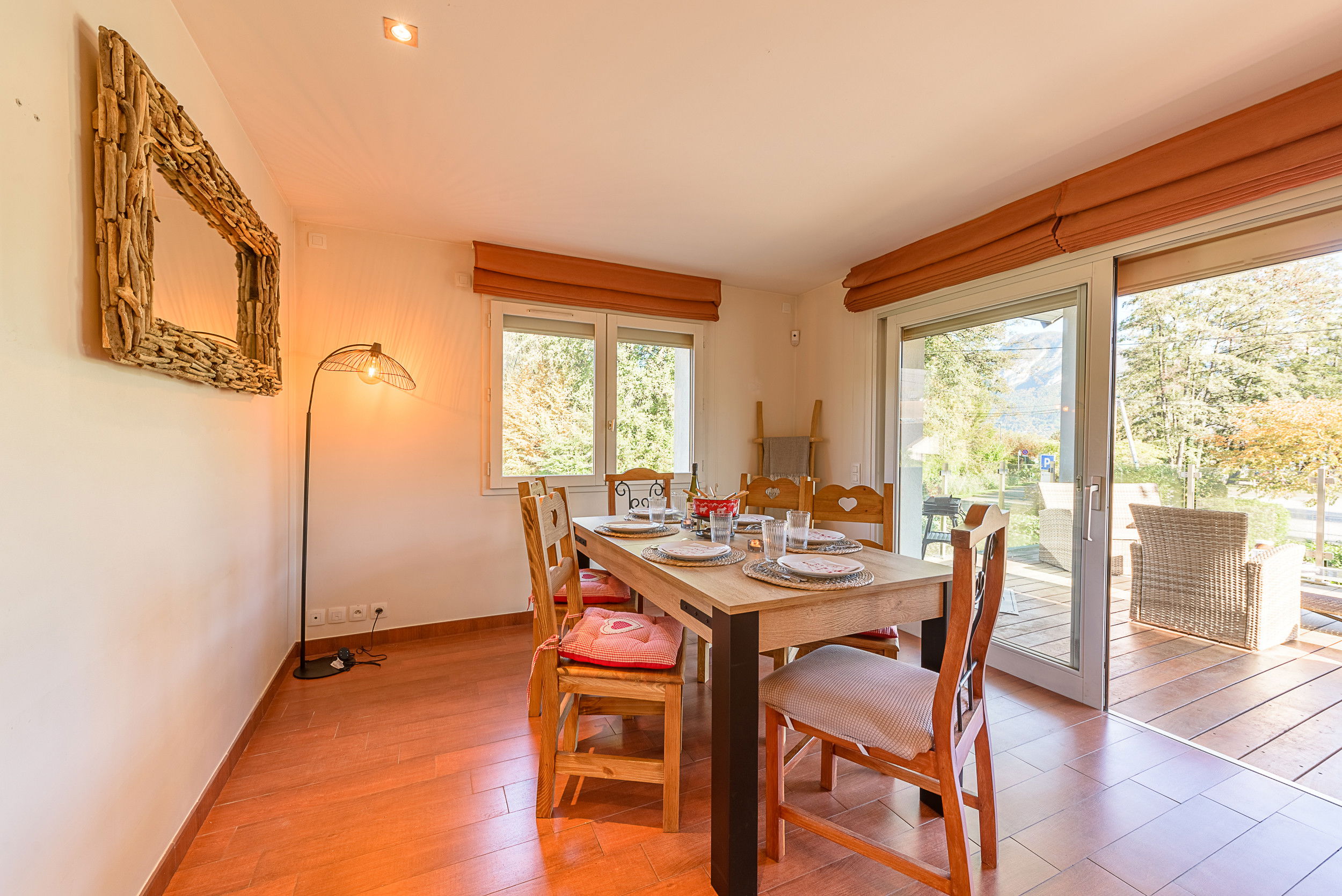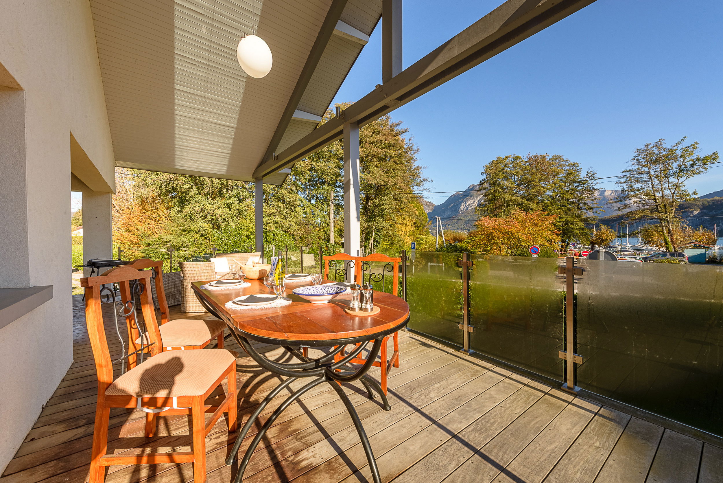 - Spacious terrace with lake view, garden furniture, dining table and plancha grill