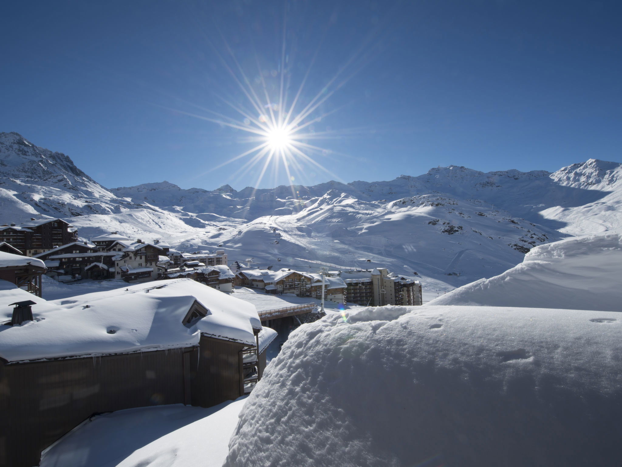 Beautiful, comfortable residence "Le Hameau du Kashmir". 92 apartments in the residence. 600 m from the centre of Val Thorens, on the outskirts, 17 km from the centre of Saint Martin-de-Belleville, 34 km from the centre of Moutiers, in an elevated position on a slope, directly by the skiing area. For shared use: indoor pool heated (pool opening hours: 10:00-20:00) with internal staircase. Unconventional pool shape. In the complex: reception, restaurant, bar, sauna, fitness room, massage (extra). Infrared sauna, storage room for skis, washing machine, tumble dryer (for shared use, extra), ski boot dryer. Bread roll service and breakfast possible on request. Storeroom available. Communal covered parking (extra). Shop 600 m, bus stop 50 m. Tennis 350 m, sports centre, walking paths from the house 20 m, slopes, ski rental, ski school 600 m. Well-known ski regions can easily be reached: Les 3 Vallées. Please note: In case of good snow conditions, the house is accessible on skis. The photo is just an example. The holiday properties may differ in living space, floorplan, equipment and furnishing.