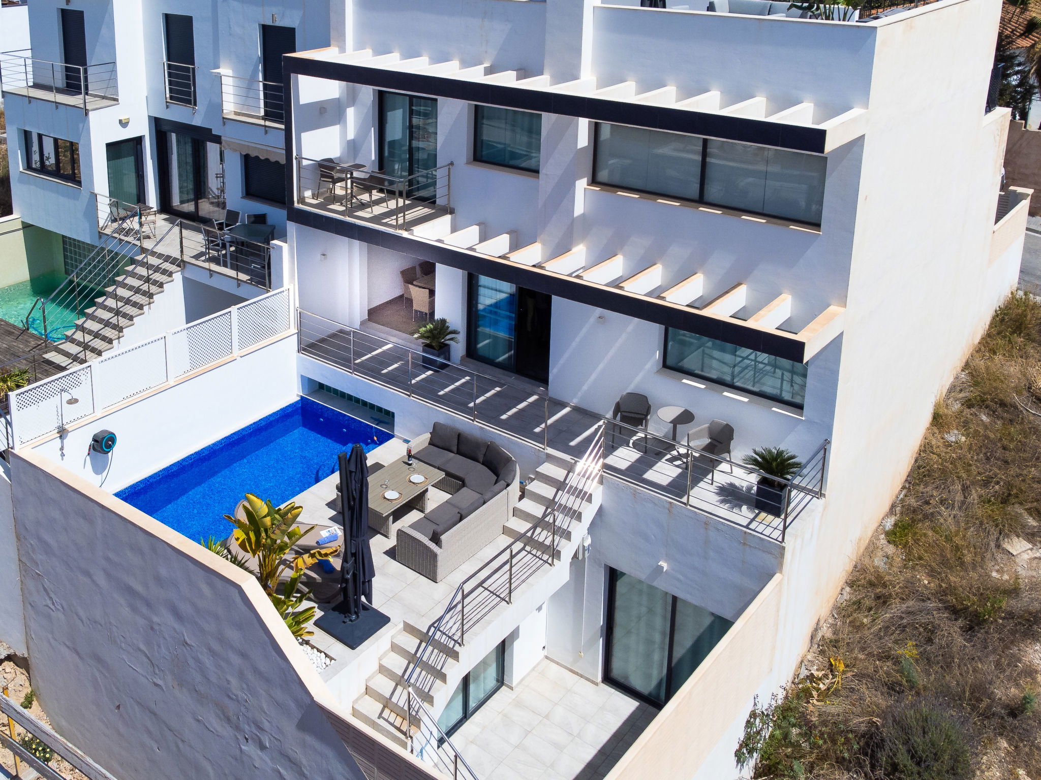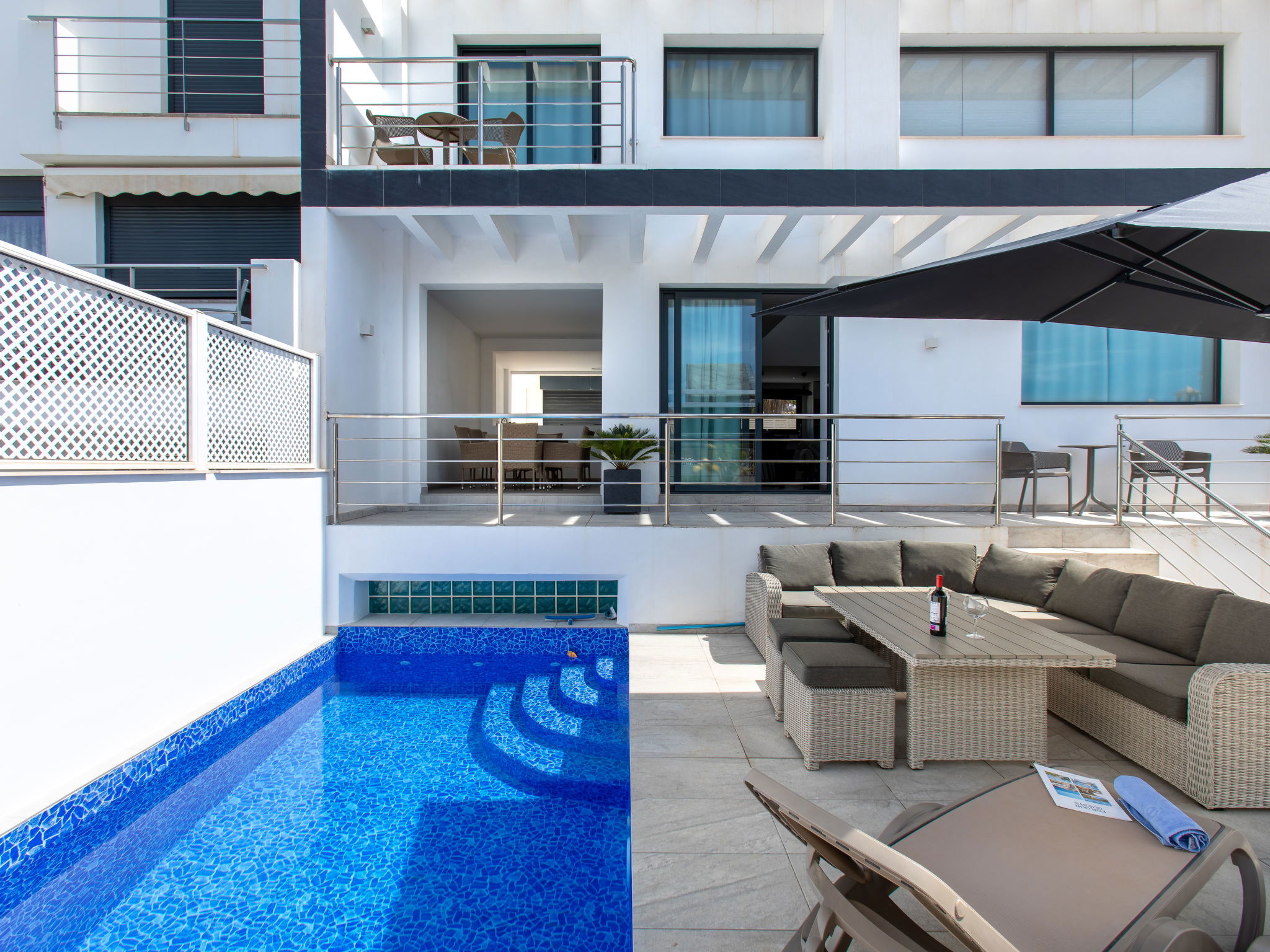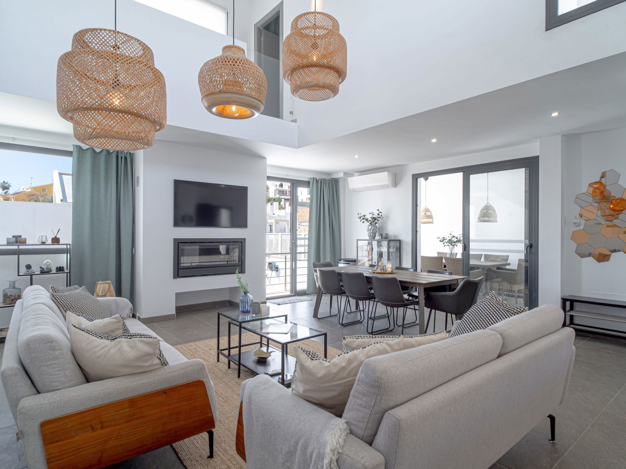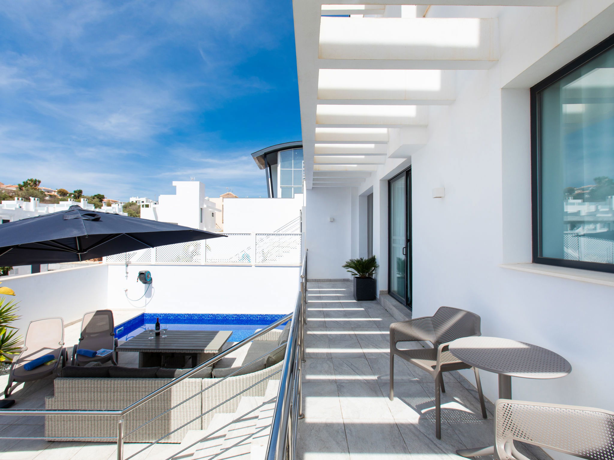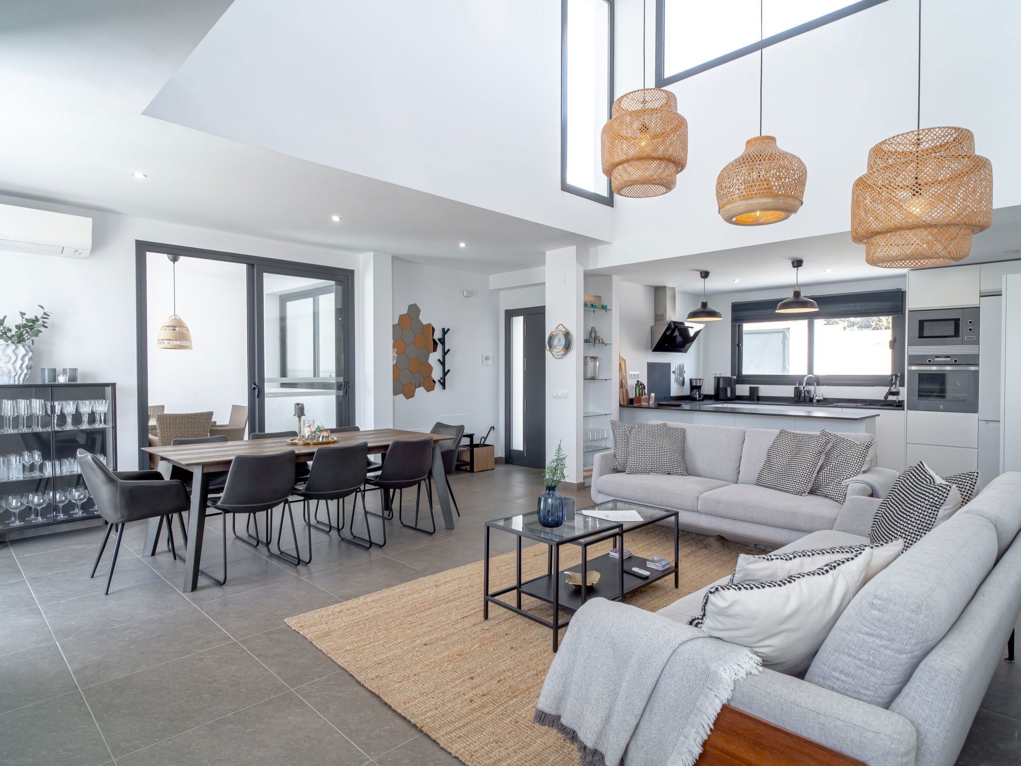 "Aldea", 5-room villa 120 m2. Spacious and bright, comfortable furnishings: living/dining room with TV, international TV channels, air conditioning and forced-air heating. Open kitchen (oven, dishwasher, 3 induction hot plates, toaster, kettle, microwave, freezer, electric coffee machine). Sep. WC. On the lower ground floor: 1 room with 2 beds (90 cm, length 200 cm), air conditioning and forced-air heating. 1 room with 1 french bed (180 cm, length 200 cm), air conditioning and forced-air heating. Exit to the terrace, to the swimming pool. Lounge with air conditioning and forced-air heating. Exit to the terrace, to the swimming pool. 1 room with 2 beds (90 cm, length 200 cm), air conditioning and forced-air heating. 2 baths/WC. Upper floor: 1 room with 1 french bed (180 cm, length 200 cm), shower/WC. Exit to the terrace. 2 large terraces. Terrace furniture, barbecue, deck chairs. Side view of the sea and the resort. Facilities: washing machine, iron, children's high chair, baby cot, hair dryer. Internet (WiFi, free). The Television is Smart , Private pool can be heated, costs 20 euros per day to warm up. VUT/MA50852 // Reg. Nr.: ESFCTU00002901300101534300000000000000000VUT/MA508528