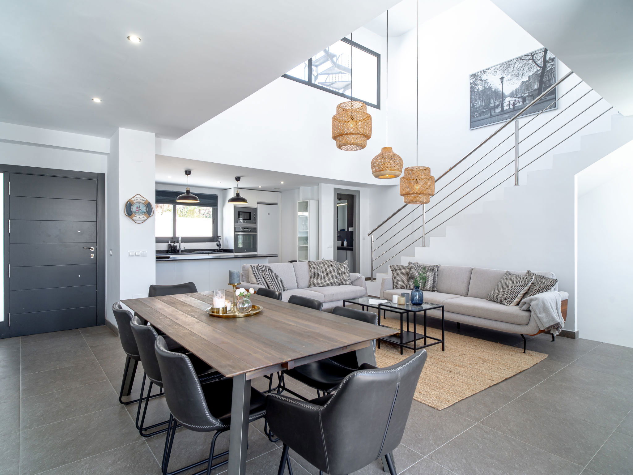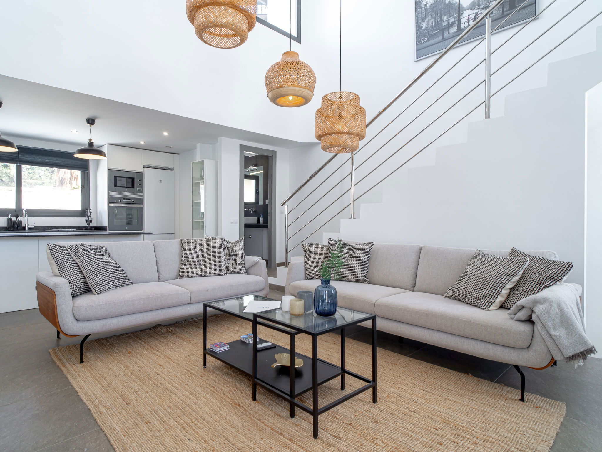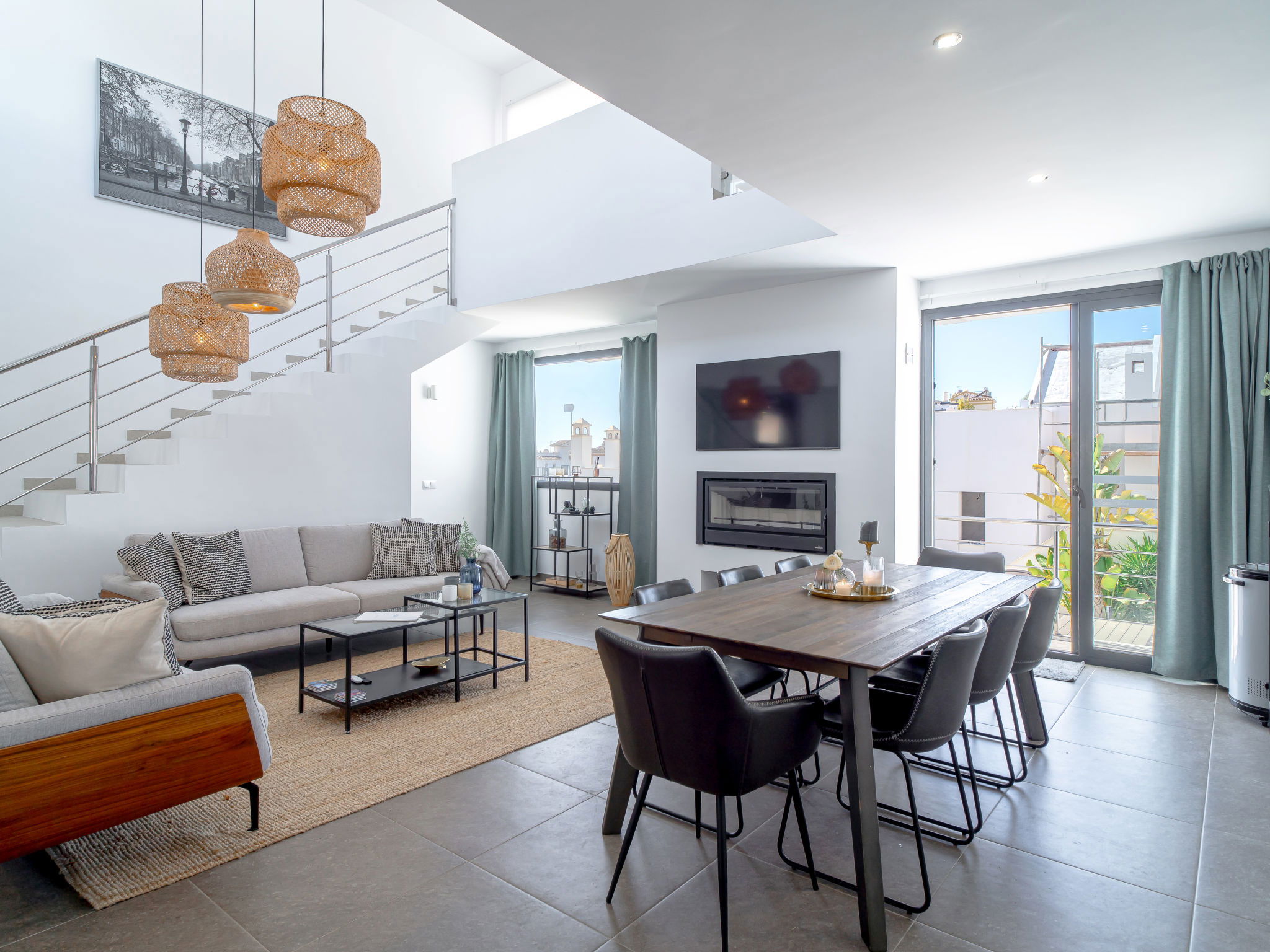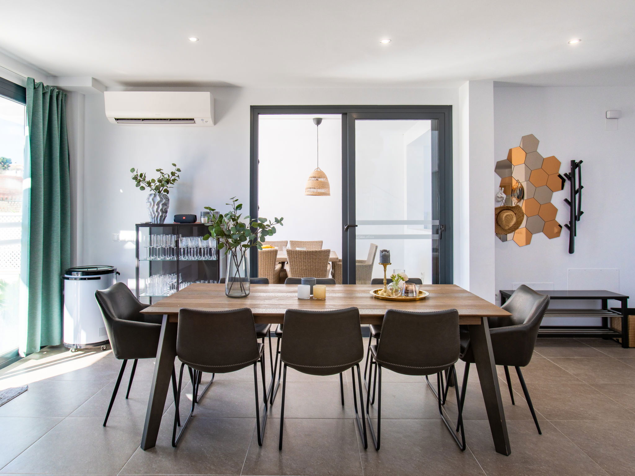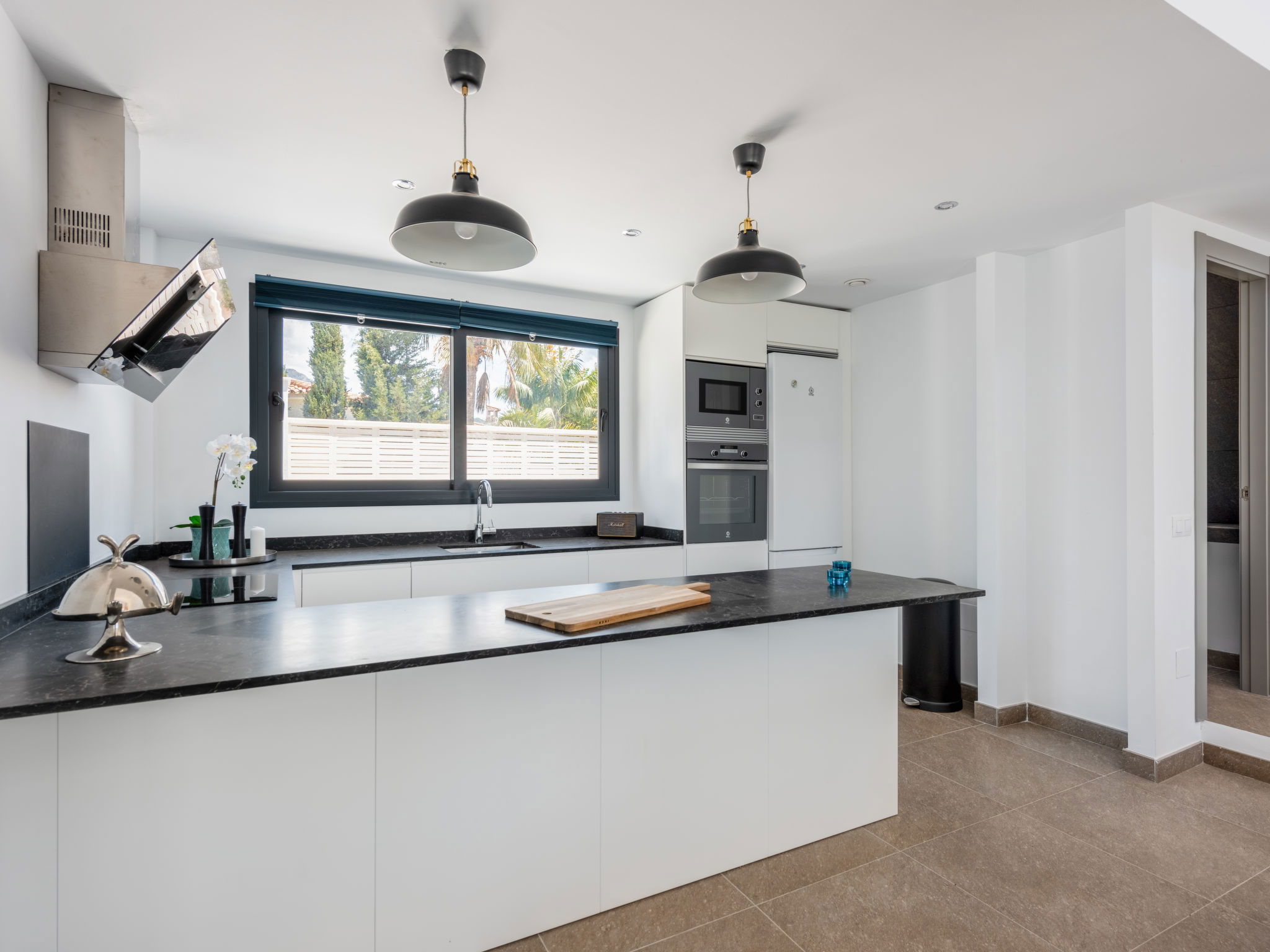 "Aldea", 5-room villa 120 m2. Spacious and bright, comfortable furnishings: living/dining room with TV, international TV channels, air conditioning and forced-air heating. Open kitchen (oven, dishwasher, 3 induction hot plates, toaster, kettle, microwave, freezer, electric coffee machine). Sep. WC. On the lower ground floor: 1 room with 2 beds (90 cm, length 200 cm), air conditioning and forced-air heating. 1 room with 1 french bed (180 cm, length 200 cm), air conditioning and forced-air heating. Exit to the terrace, to the swimming pool. Lounge with air conditioning and forced-air heating. Exit to the terrace, to the swimming pool. 1 room with 2 beds (90 cm, length 200 cm), air conditioning and forced-air heating. 2 baths/WC. Upper floor: 1 room with 1 french bed (180 cm, length 200 cm), shower/WC. Exit to the terrace. 2 large terraces. Terrace furniture, barbecue, deck chairs. Side view of the sea and the resort. Facilities: washing machine, iron, children's high chair, baby cot, hair dryer. Internet (WiFi, free). The Television is Smart , Private pool can be heated, costs 20 euros per day to warm up. VUT/MA50852 // Reg. Nr.: ESFCTU00002901300101534300000000000000000VUT/MA508528