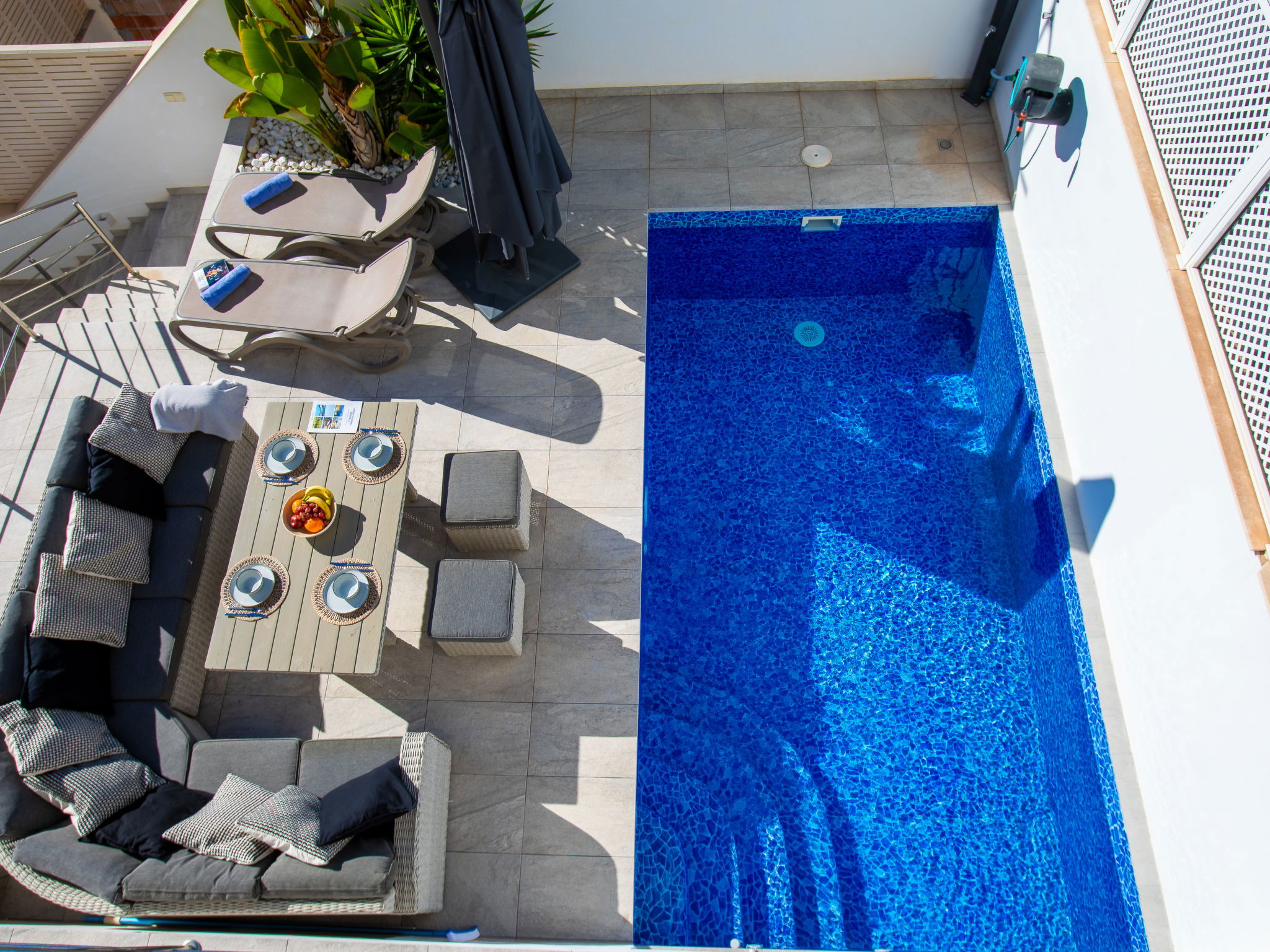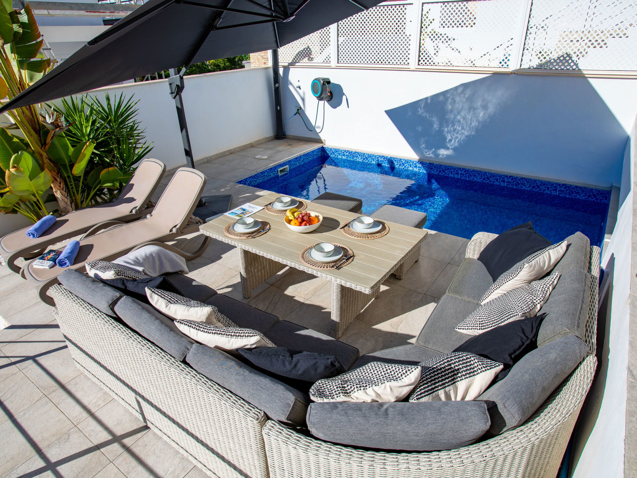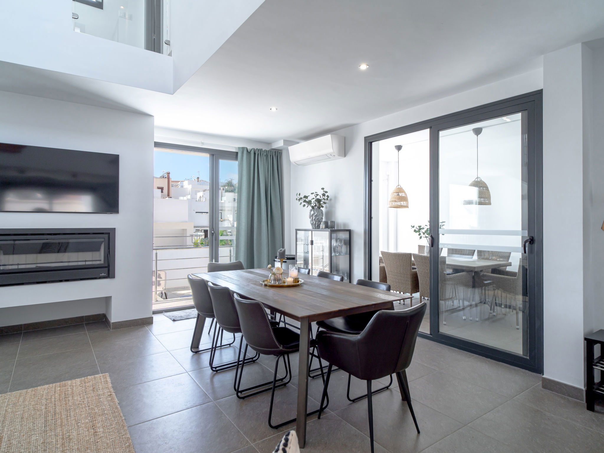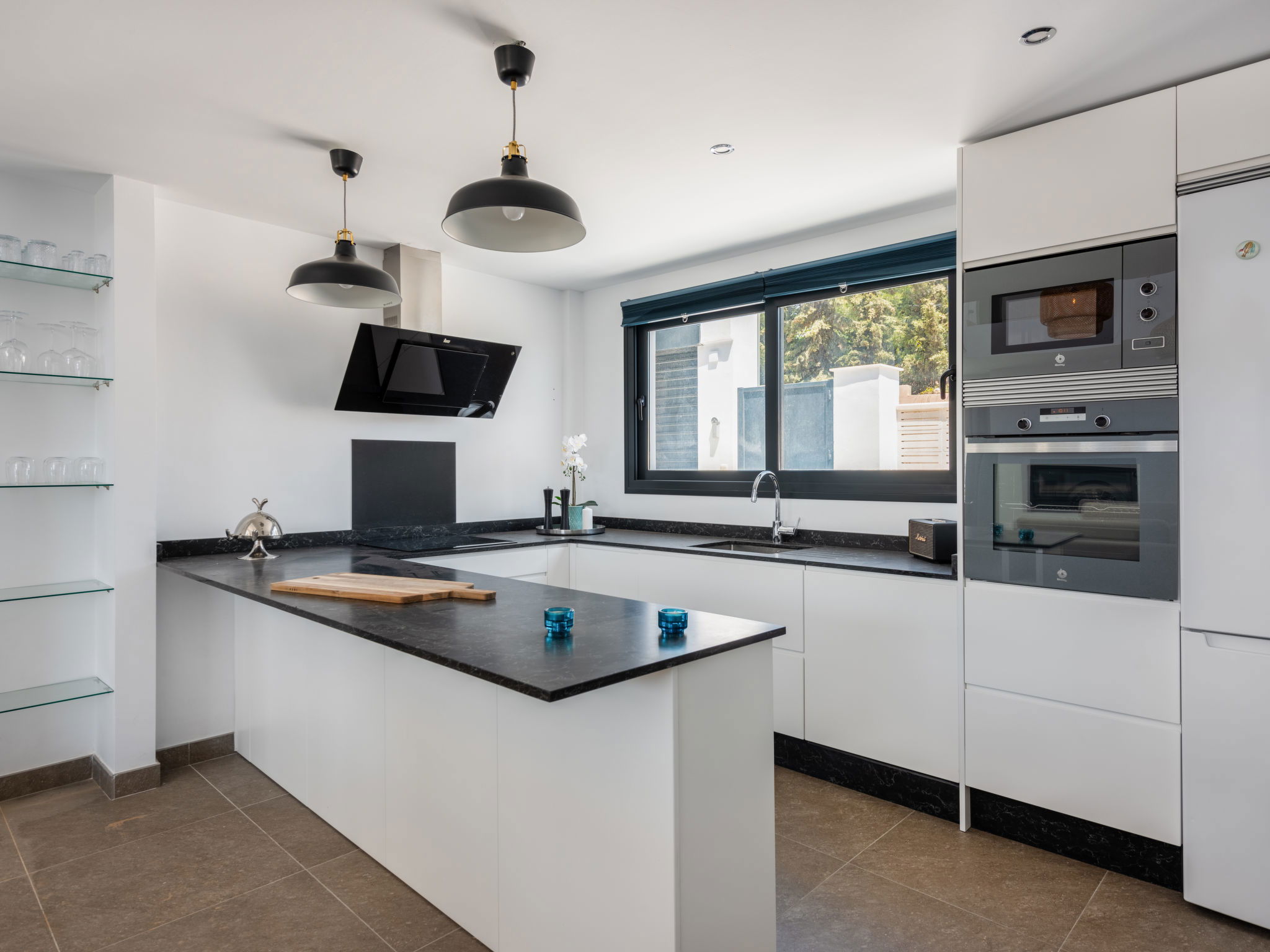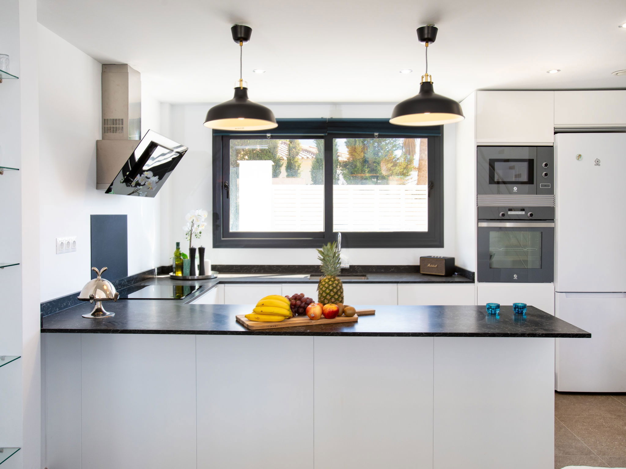 "Aldea", 5-room villa 120 m2. Spacious and bright, comfortable furnishings: living/dining room with TV, international TV channels, air conditioning and forced-air heating. Open kitchen (oven, dishwasher, 3 induction hot plates, toaster, kettle, microwave, freezer, electric coffee machine). Sep. WC. On the lower ground floor: 1 room with 2 beds (90 cm, length 200 cm), air conditioning and forced-air heating. 1 room with 1 french bed (180 cm, length 200 cm), air conditioning and forced-air heating. Exit to the terrace, to the swimming pool. Lounge with air conditioning and forced-air heating. Exit to the terrace, to the swimming pool. 1 room with 2 beds (90 cm, length 200 cm), air conditioning and forced-air heating. 2 baths/WC. Upper floor: 1 room with 1 french bed (180 cm, length 200 cm), shower/WC. Exit to the terrace. 2 large terraces. Terrace furniture, barbecue, deck chairs. Side view of the sea and the resort. Facilities: washing machine, iron, children's high chair, baby cot, hair dryer. Internet (WiFi, free). The Television is Smart , Private pool can be heated, costs 20 euros per day to warm up. VUT/MA50852 // Reg. Nr.: ESFCTU00002901300101534300000000000000000VUT/MA508528