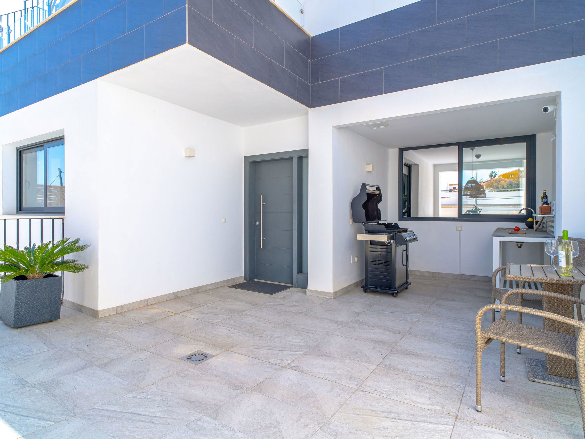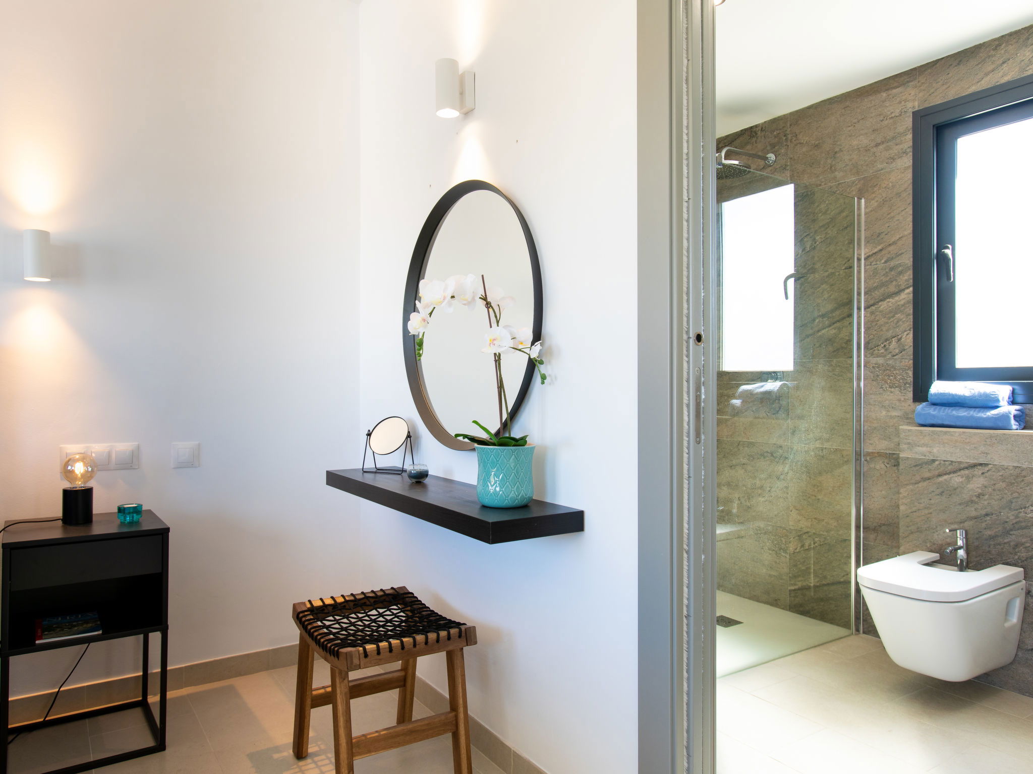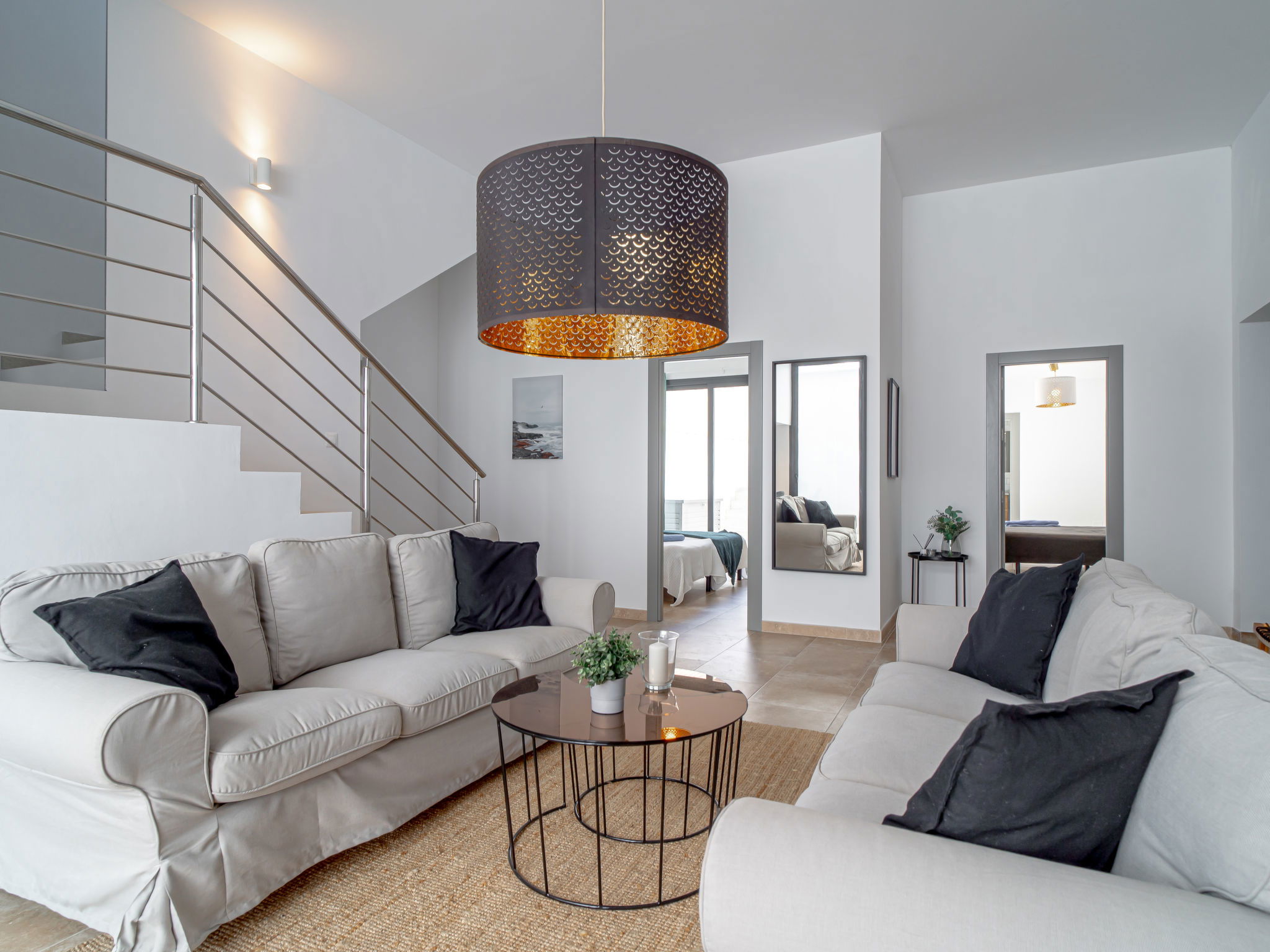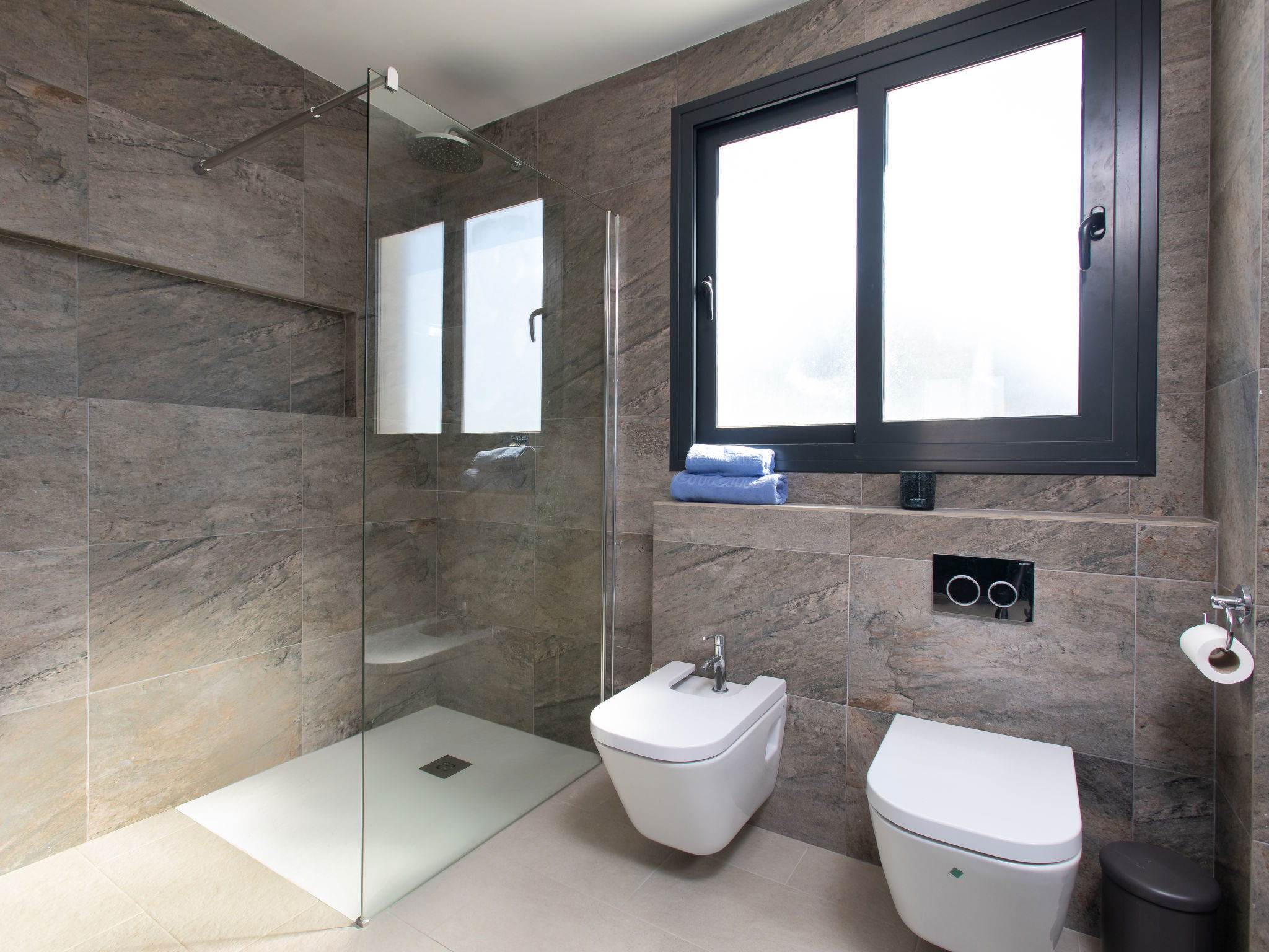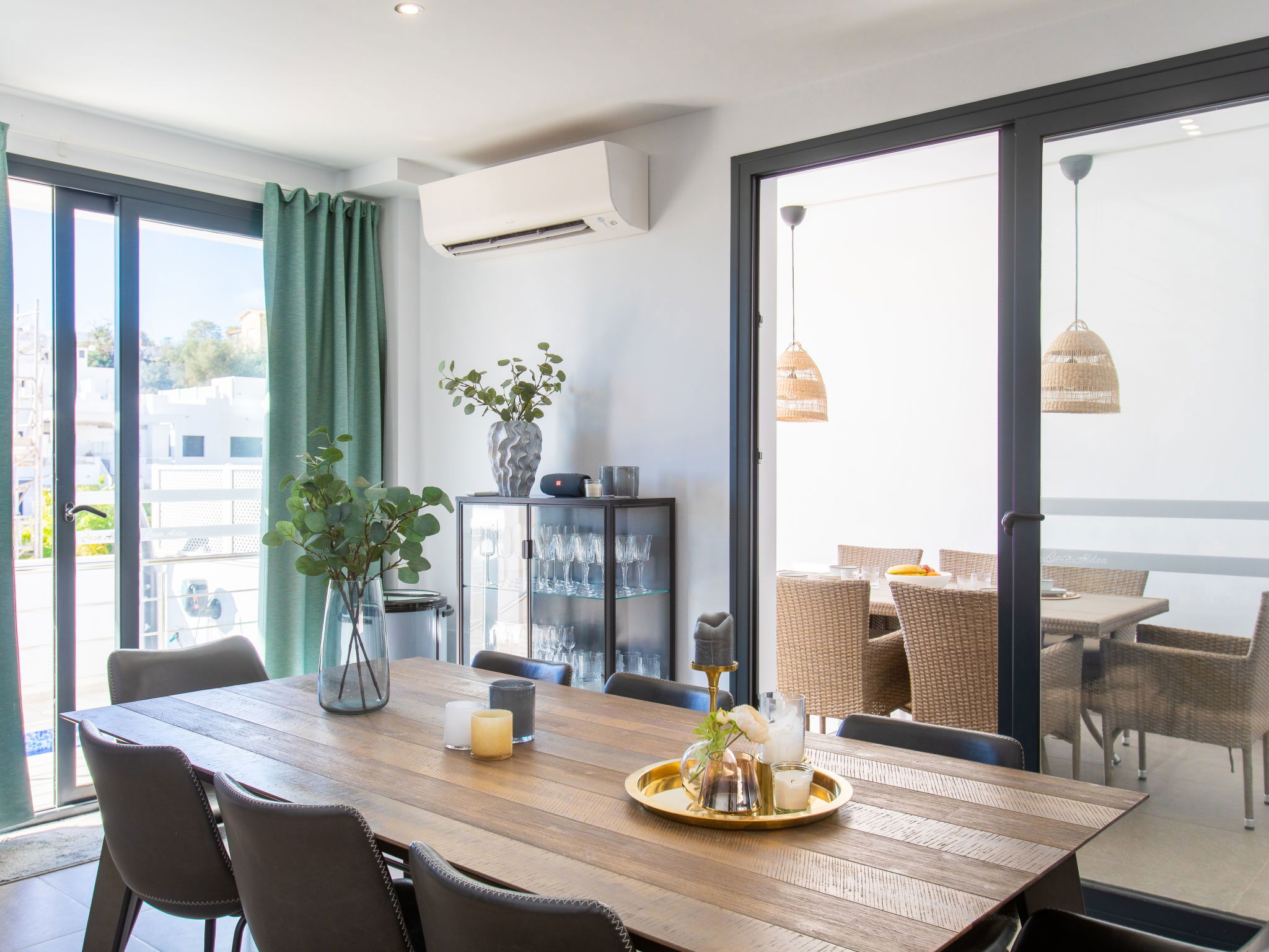 "Aldea", 5-room villa 120 m2. Spacious and bright, comfortable furnishings: living/dining room with TV, international TV channels, air conditioning and forced-air heating. Open kitchen (oven, dishwasher, 3 induction hot plates, toaster, kettle, microwave, freezer, electric coffee machine). Sep. WC. On the lower ground floor: 1 room with 2 beds (90 cm, length 200 cm), air conditioning and forced-air heating. 1 room with 1 french bed (180 cm, length 200 cm), air conditioning and forced-air heating. Exit to the terrace, to the swimming pool. Lounge with air conditioning and forced-air heating. Exit to the terrace, to the swimming pool. 1 room with 2 beds (90 cm, length 200 cm), air conditioning and forced-air heating. 2 baths/WC. Upper floor: 1 room with 1 french bed (180 cm, length 200 cm), shower/WC. Exit to the terrace. 2 large terraces. Terrace furniture, barbecue, deck chairs. Side view of the sea and the resort. Facilities: washing machine, iron, children's high chair, baby cot, hair dryer. Internet (WiFi, free). The Television is Smart , Private pool can be heated, costs 20 euros per day to warm up. VUT/MA50852 // Reg. Nr.: ESFCTU00002901300101534300000000000000000VUT/MA508528