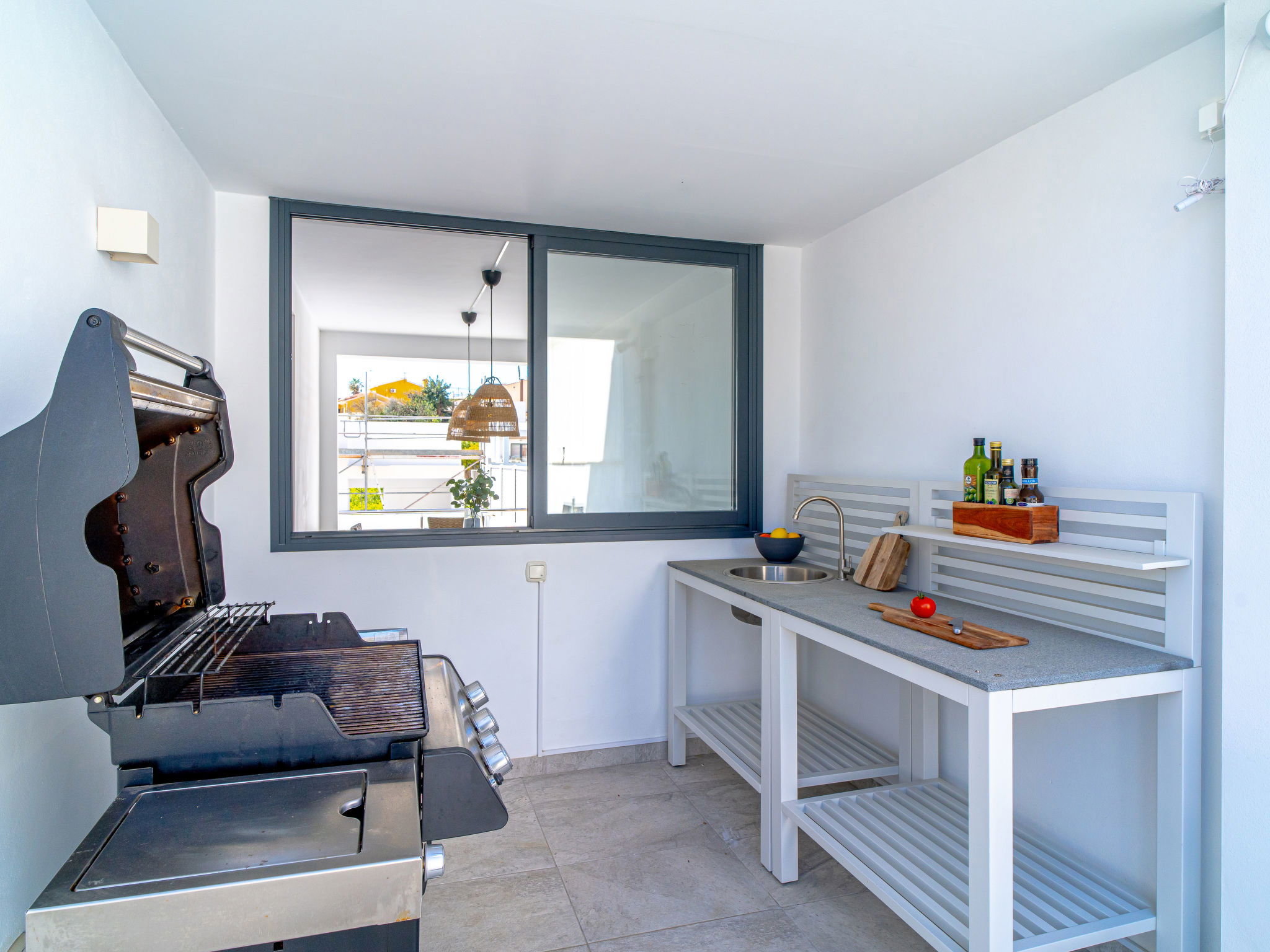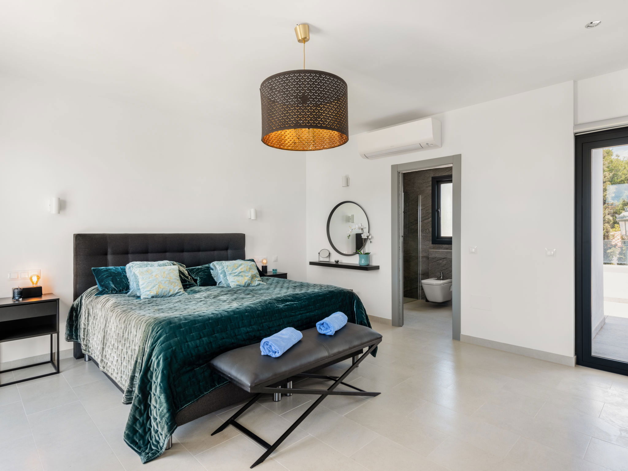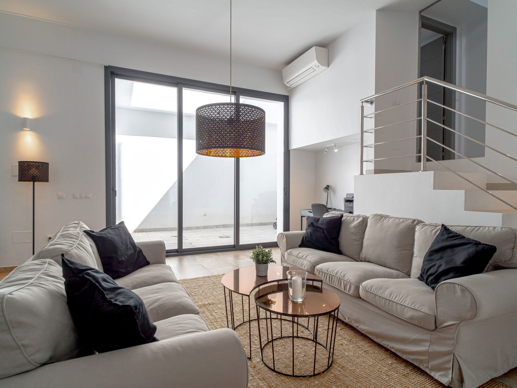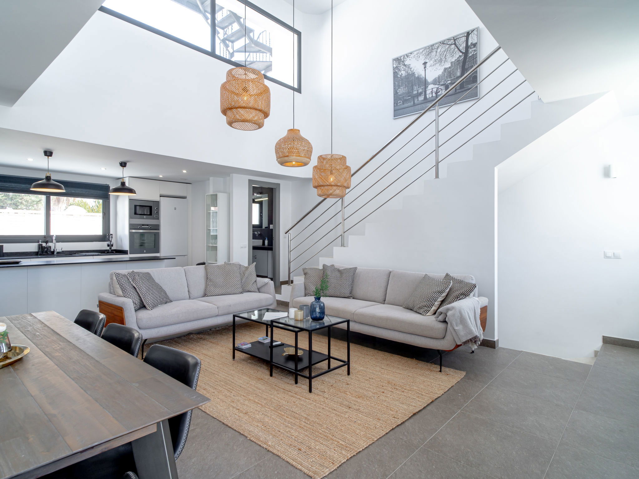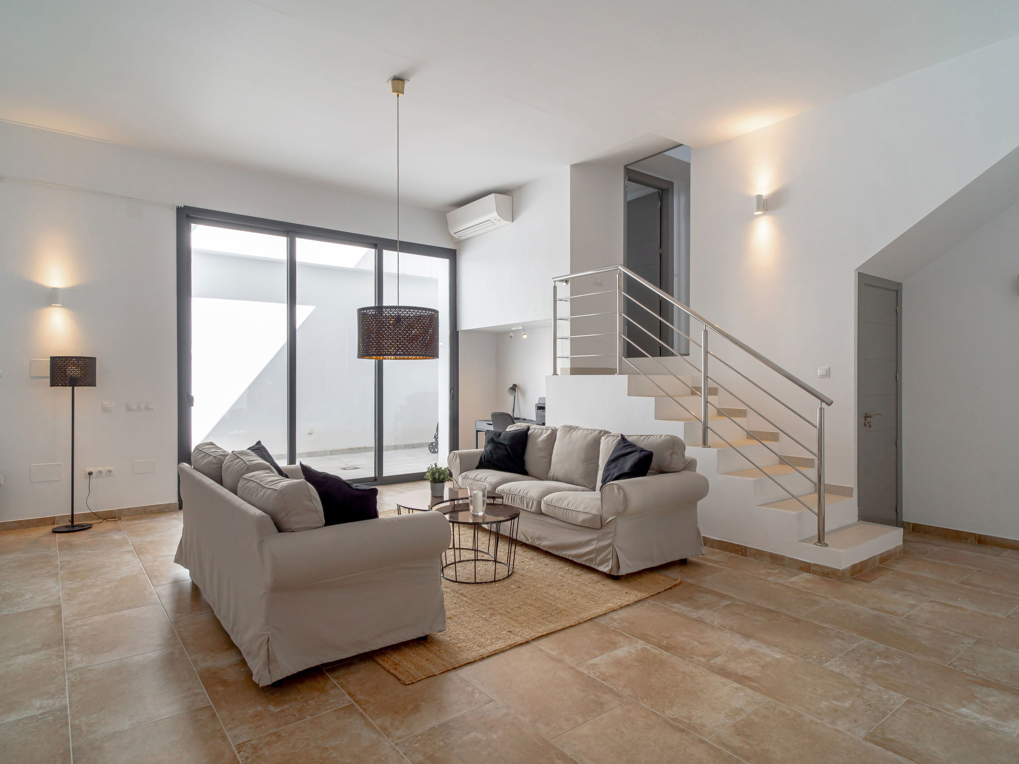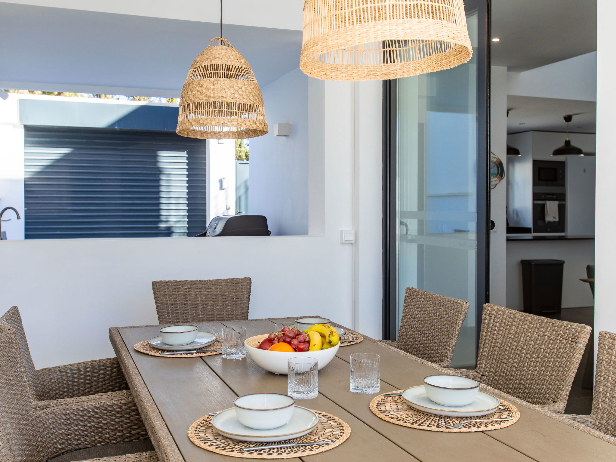 "Aldea", 5-room villa 120 m2. Spacious and bright, comfortable furnishings: living/dining room with TV, international TV channels, air conditioning and forced-air heating. Open kitchen (oven, dishwasher, 3 induction hot plates, toaster, kettle, microwave, freezer, electric coffee machine). Sep. WC. On the lower ground floor: 1 room with 2 beds (90 cm, length 200 cm), air conditioning and forced-air heating. 1 room with 1 french bed (180 cm, length 200 cm), air conditioning and forced-air heating. Exit to the terrace, to the swimming pool. Lounge with air conditioning and forced-air heating. Exit to the terrace, to the swimming pool. 1 room with 2 beds (90 cm, length 200 cm), air conditioning and forced-air heating. 2 baths/WC. Upper floor: 1 room with 1 french bed (180 cm, length 200 cm), shower/WC. Exit to the terrace. 2 large terraces. Terrace furniture, barbecue, deck chairs. Side view of the sea and the resort. Facilities: washing machine, iron, children's high chair, baby cot, hair dryer. Internet (WiFi, free). The Television is Smart , Private pool can be heated, costs 20 euros per day to warm up. VUT/MA50852 // Reg. Nr.: ESFCTU00002901300101534300000000000000000VUT/MA508528