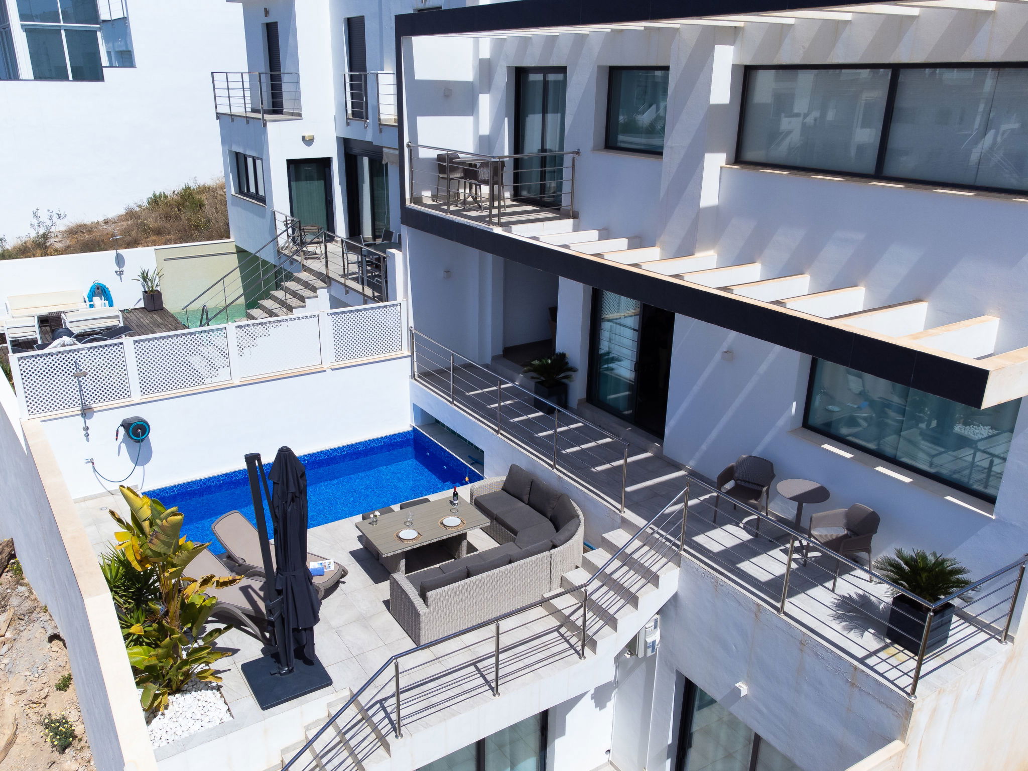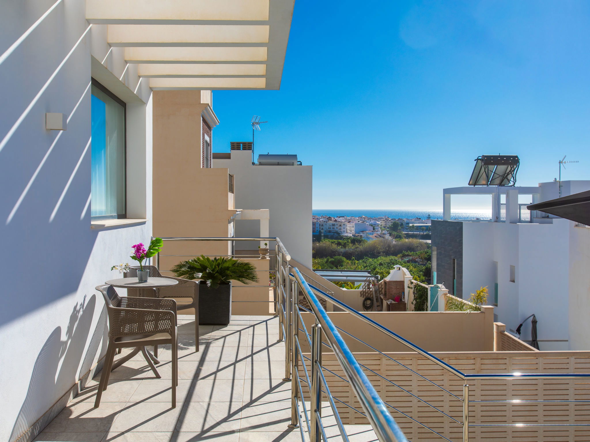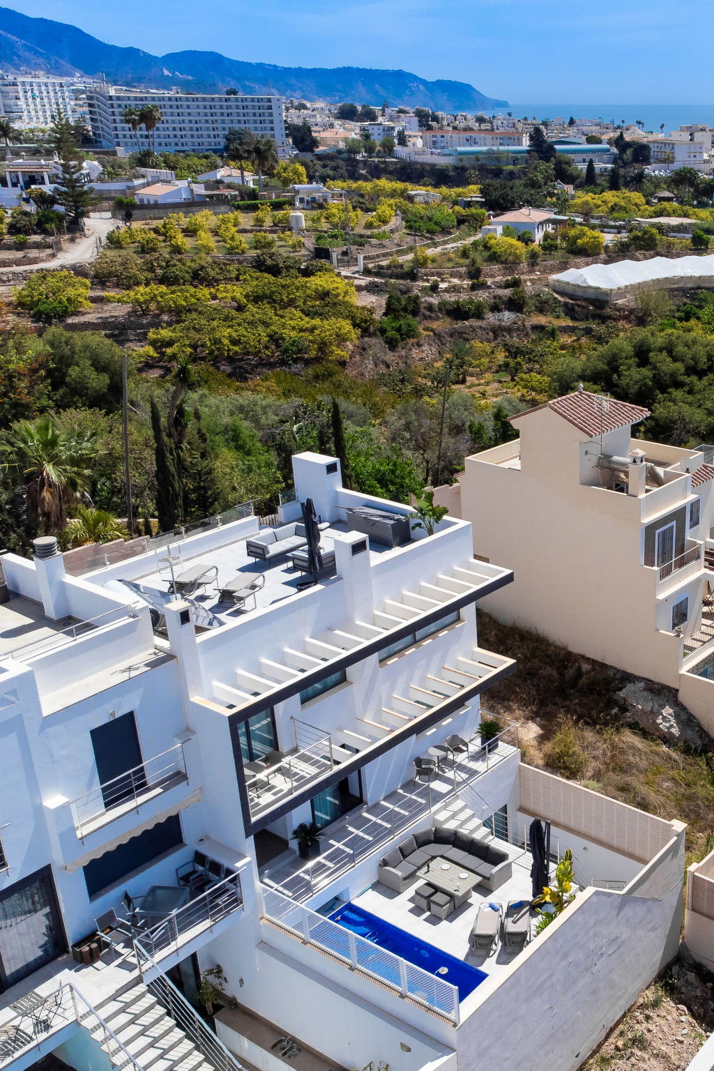 Nerja: Modern, beautiful, comfortable house "Aldea", 3 storeys. In the resort 2 km from the centre of Nerja, in a quiet position in the residential district, residential area (villas), 2 km from the sea, 2 km from the beach. Private: courtyard, swimming pool angular, heated (5 x 2 m, depth 100 - 150 cm, seasonal availability: 01.Jan. - 31.Dec., extra 30). Terrace, garden furniture, barbecue. In the house: sun terrace, washing machine. Shop 1 km, grocery 1 km, supermarket 1 km, shopping centre 23 km, restaurant 1.5 km, bar 1.5 km, bakery 1 km, café 1.5 km, pedestrian zone 2 km, bicycle rental 2 km, pub garden 1.5 km, bus stop 500 m, railway station "Málaga", sandy beach "Burriana" 2 km, diving center 2 km. Sports harbour 20 km, marina 20 km, golf course (18 hole) 22 km, surf school 20 km, sailing school 20 km, tennis 2 km. Nearby attractions: Nerja, Frigiliana, Cuevas de Nerja, Malaga, Granada, Almuñecar. Well-known ski regions can easily be reached: Sierra Nevada. Hiking paths: Sierra Tejeda, Sierra Almijara. Please note: car recommended. Baby equipment (included). The owner does not accept any youth groups. Loading and unloading of baggage is possible at the holiday house.