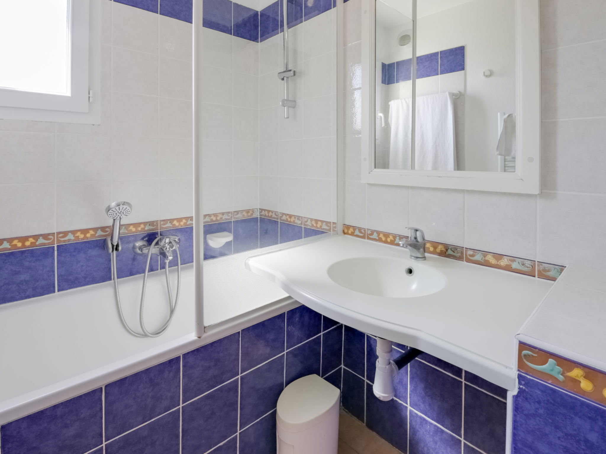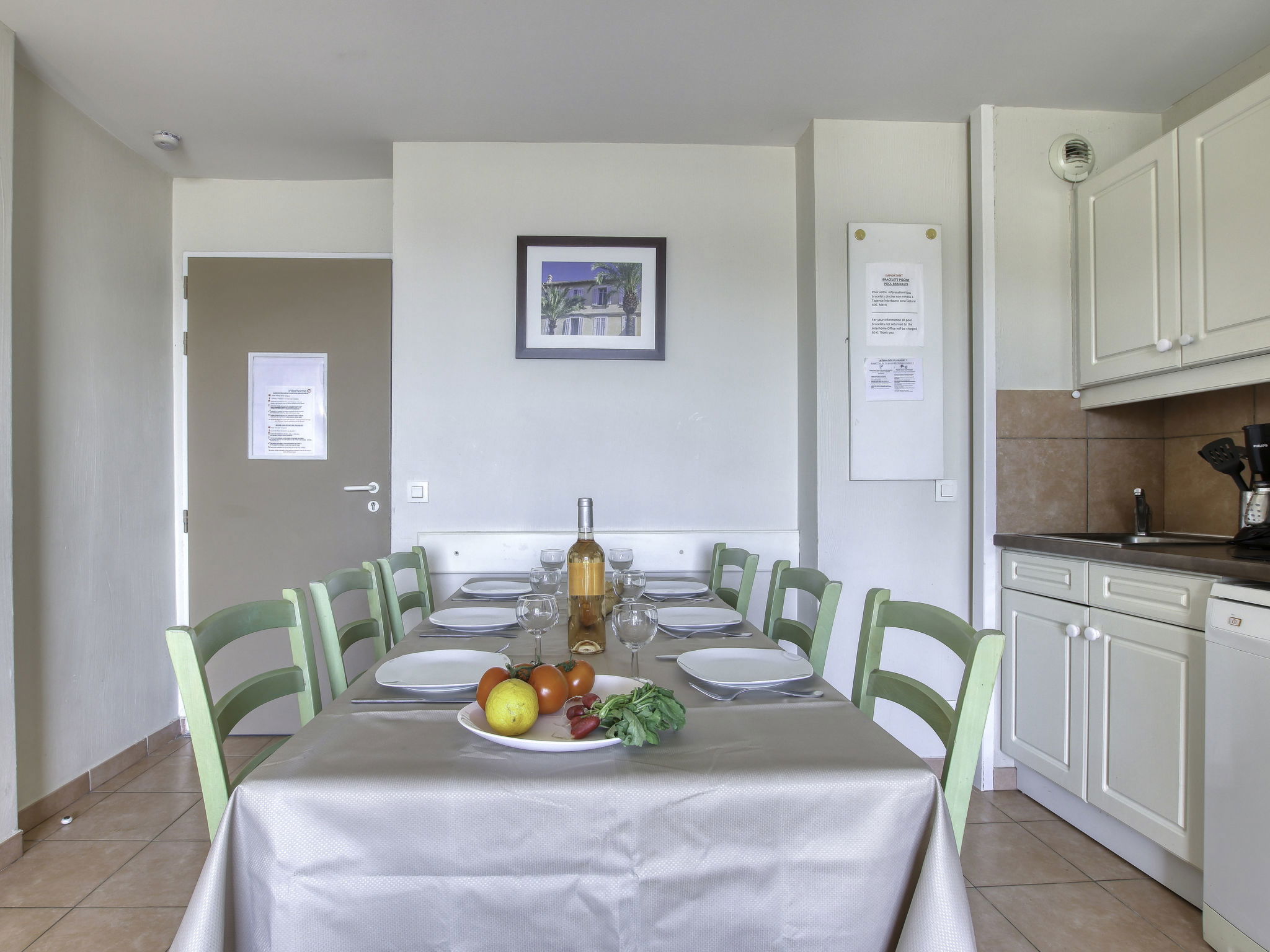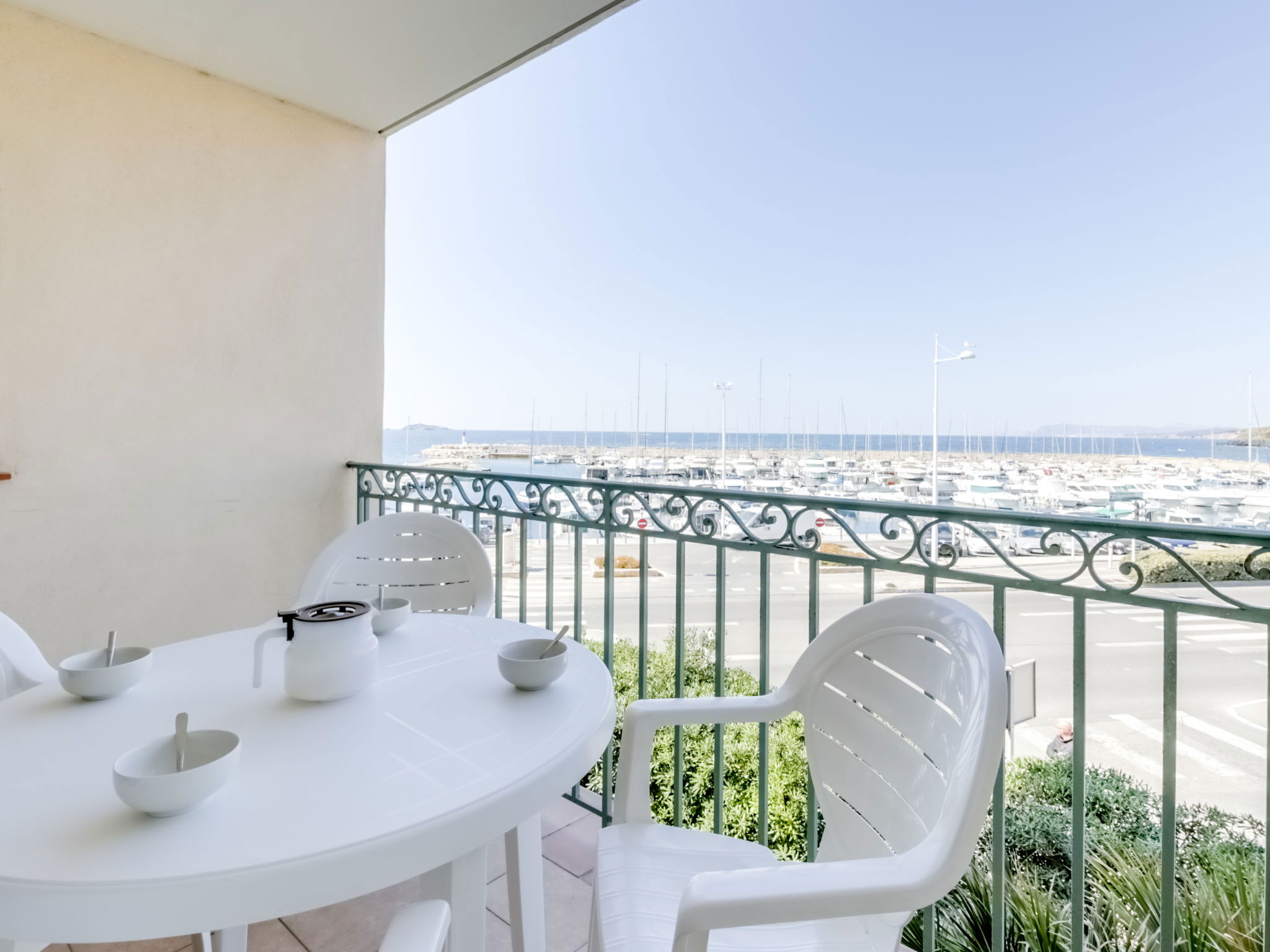 3-room apartment 38 m2 on 1st floor. Practical and comfortable furnishings: living/dining room with 1 bed (80 cm, length 190 cm), TV (flat screen). Exit to the terrace. Sleeping alcove with 1 x 2 bunk beds (80 cm, length 190 cm). 1 room with 1 french bed (140 cm, length 190 cm). Kitchenette (dishwasher, 4 ceramic glass hob hotplates, toaster, kettle, microwave, freezer, electric coffee machine). Bathroom, shower/WC. Electric heating. Terrace 5 m2, roofed, north-west facing position. Terrace furniture. Beautiful view of the sea. Facilities: Internet (WiFi, extra). Parking space n 471 (Niveau 1) (roofed), height 190 cm, width 232 cm. Please note: apartment street side. Maximum 1 pet/ dog allowed. TV only FR. Smoke alarm. The accommodation is 30 meters only from the road and a red light. Instead of an enclosed bedroom, some sleeping areas are located in an open-plan area (gallery, alcove, etc.).