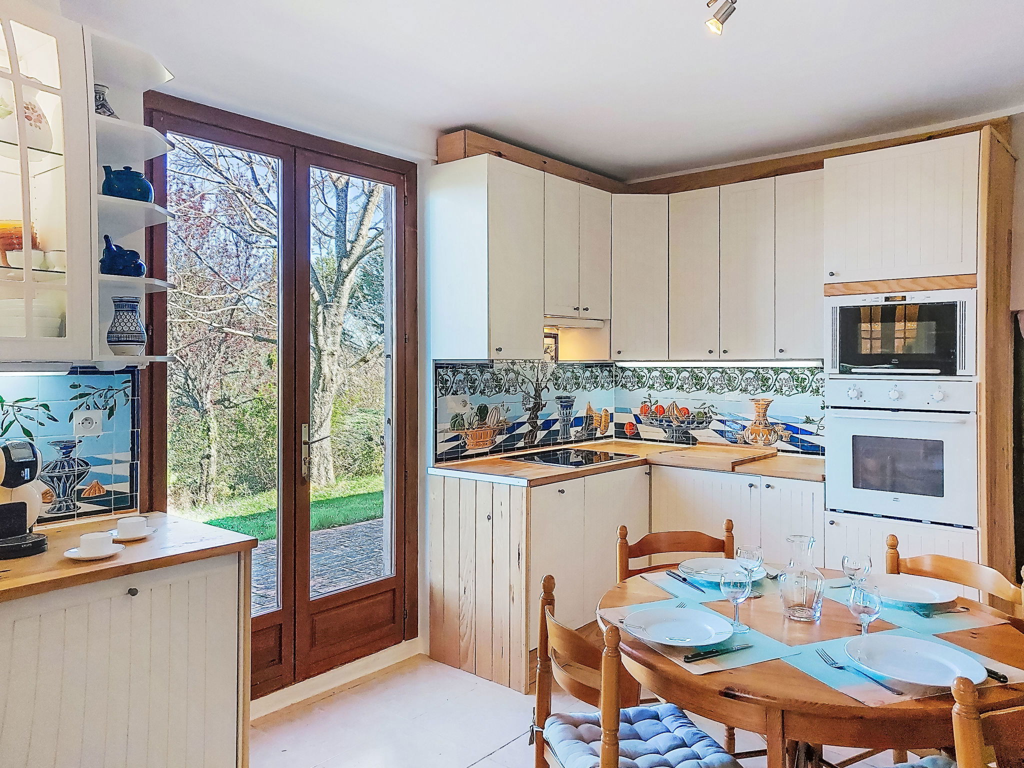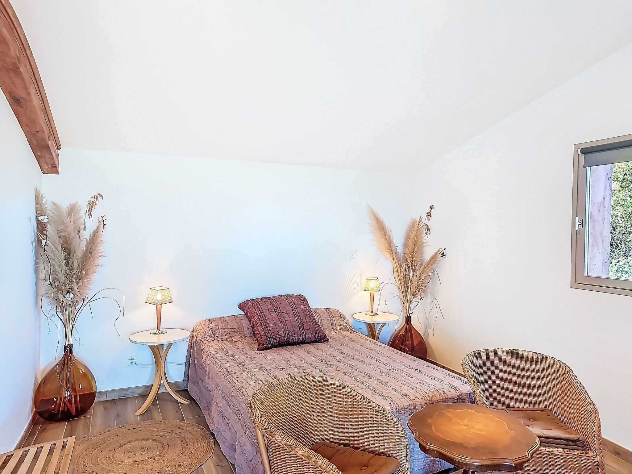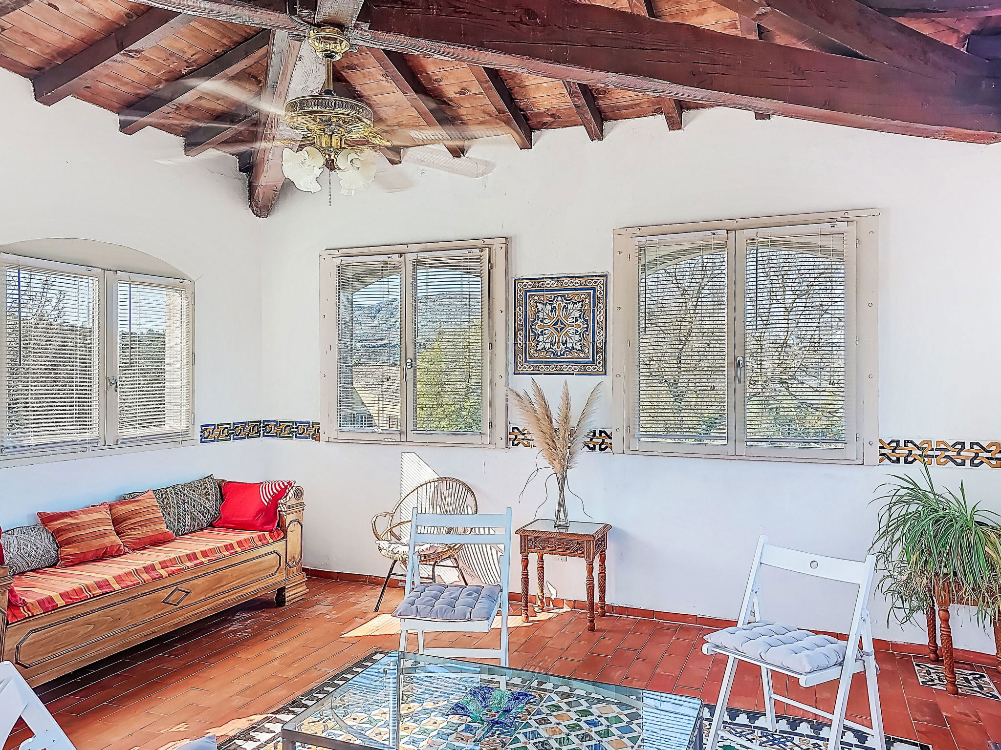 6-room house 300 m2 on 3 levels. Partly renovated in 2025, stylish furnishings: large living/dining room 120 m2 with TV and international TV channels (flat screen), DVD and air conditioning. Exit to the terrace. 1 room with 2 beds. 1 room with 1 french bed (160 cm, length 200 cm), separate WC and shower. 1 room with 1 french bed (140 cm), separate WC and shower. Open kitchen (oven, dishwasher, 4 ceramic glass hob hotplates, microwave, freezer, electric coffee machine, Capsules for coffee machine (dolce gusto) extra) with dining table. Shower/WC. Upper floor: (spiral staircase), 1 room with 1 french bed (160 cm, length 200 cm). 2nd upper floor: (spiral staircase) lounge. Electric heating. Porch 12 m2, south facing position. Terrace furniture, barbecue (portable), deck chairs (8). Marvellous panoramic view of the valley and the countryside. Facilities: washing machine, iron, hair dryer. Garage (2 cars), height 225 cm, width 237 cm. Please note: maximum 1 pet/ dog allowed. Smoke alarm. 3 wall fountains and a skylight in the living room. Alambra mosaics (Arabic type) throughout the house. The rooms located upstairs are in the tower, the living room is accessible via the double bedroom only from where we have a 180 degree view of the surrounding countryside. A plancha (gas) has been installed on the terrace near the kitchen. Please note: Air conditioning is only available in the bedrooms.