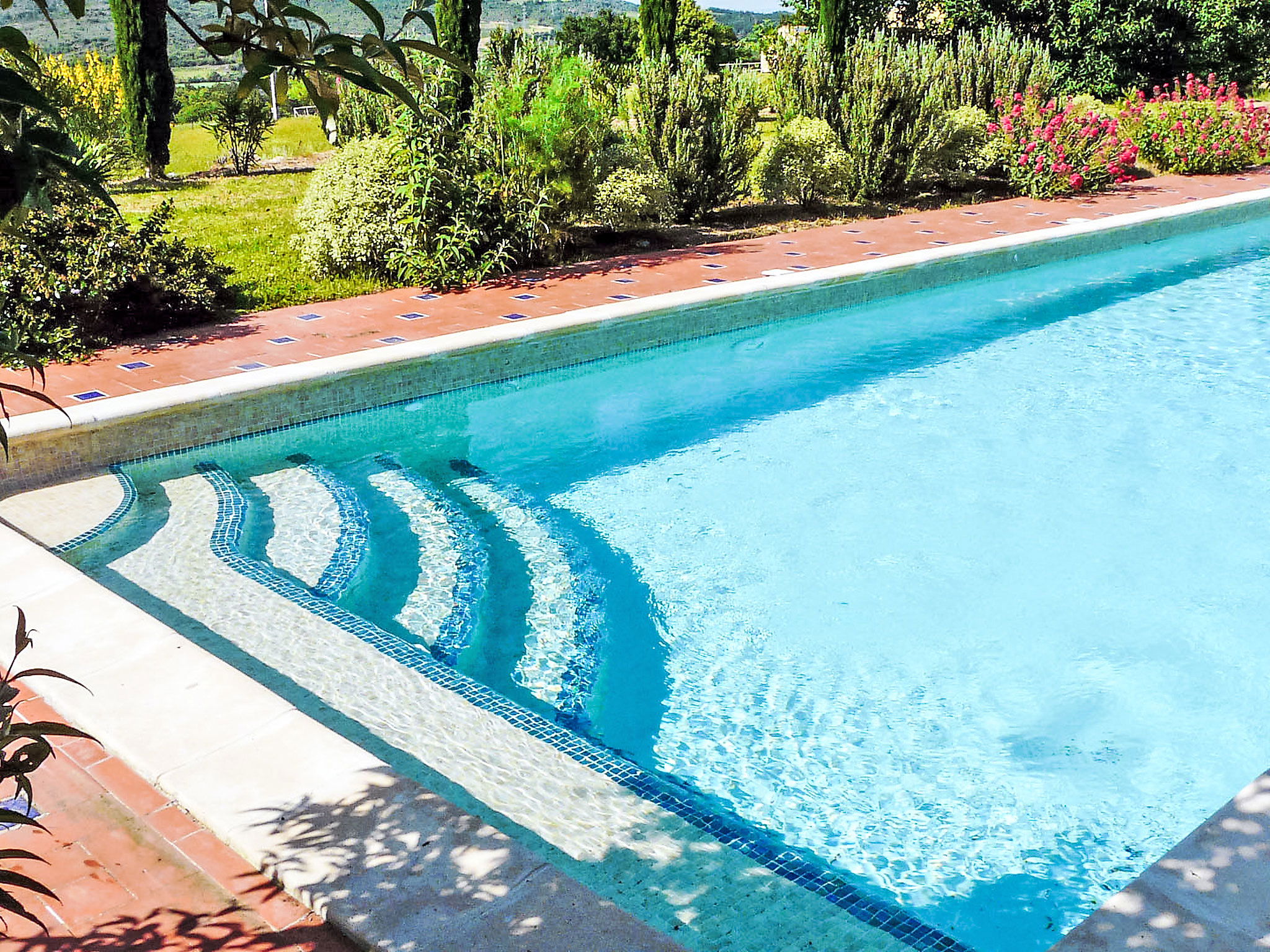 Le Hameau de Vendemies 3 km from Limoux: Old stables including a main one storey building and a tower on 2 floors, completely renovated in 2003-2004, Oriental style (Alhambra mosaics), in a very quiet position, on a hill overlooking the meadows and fields. Single-family house "Les Ecuries". Outside the resort, in the countryside. For shared use: boccia. Private: natural garden 5'000 m2 (fenced), swimming pool angular (12 x 4 m, depth 150 - 150 cm, seasonal availability: 01.Jun. - 30.Sep.) with internal staircase. Terrace (120 m2), parking on the premises, single garage. Shop 3 km, grocery 3 km, restaurant 3 km, café 3 km, bus stop "Gare de Limoux" 6 km. Nearby attractions: Cité de Carcassonne 32 km. Please note: car recommended. horses, a donkey and sheeps nearby. A refrigerator was installed near the pool .