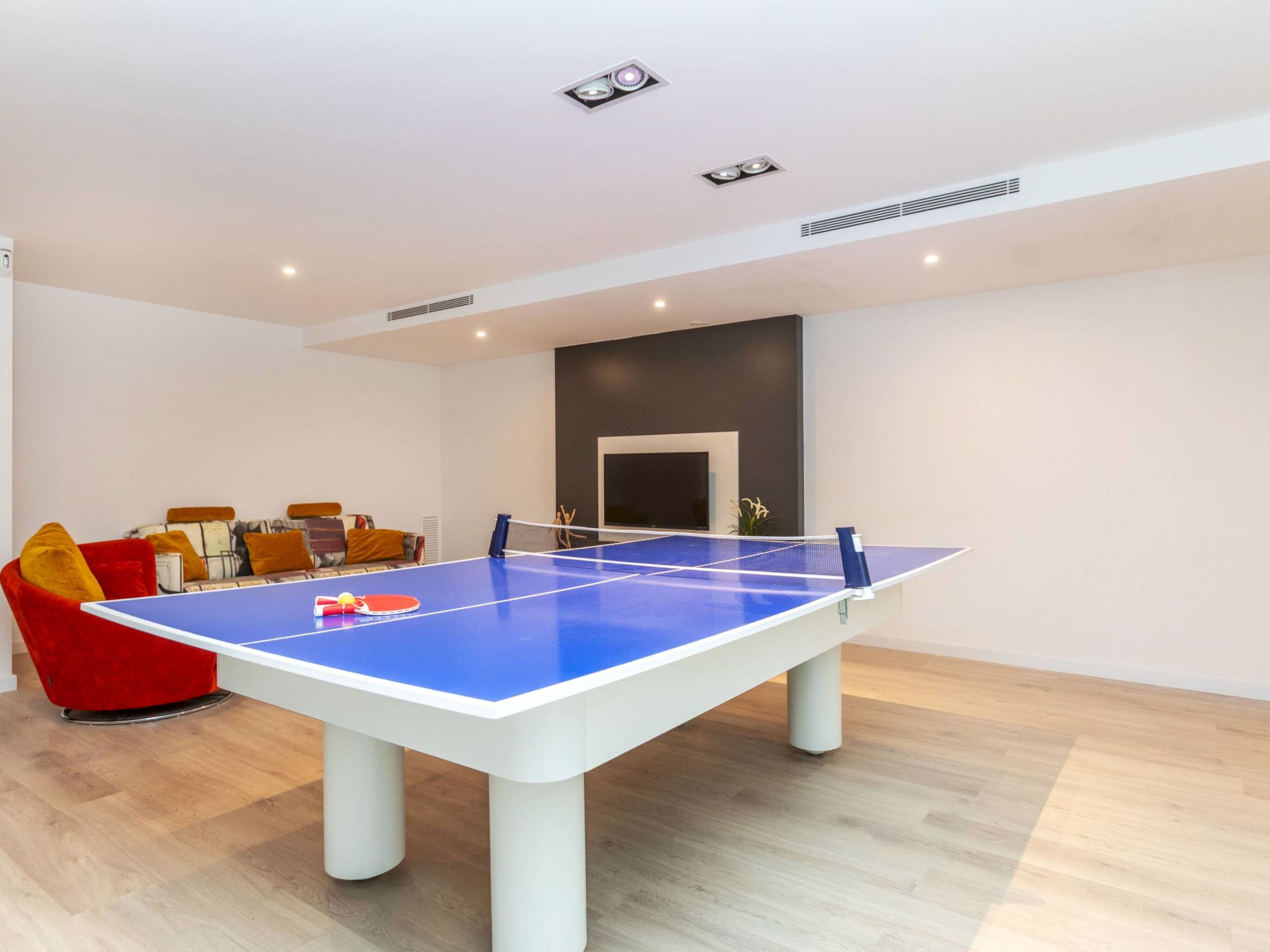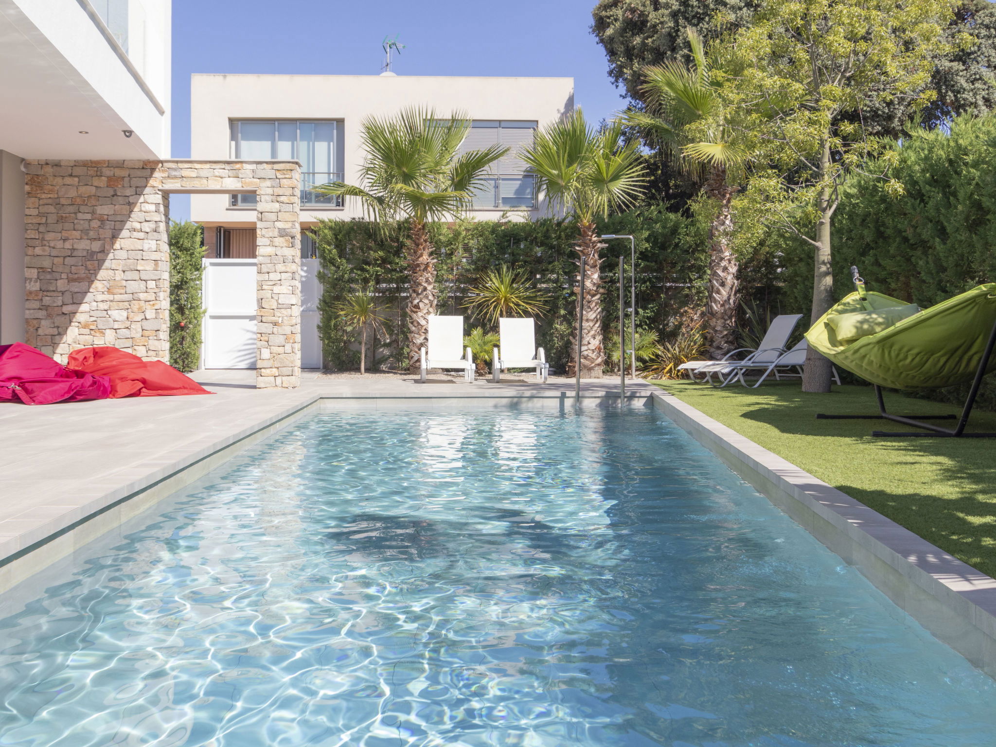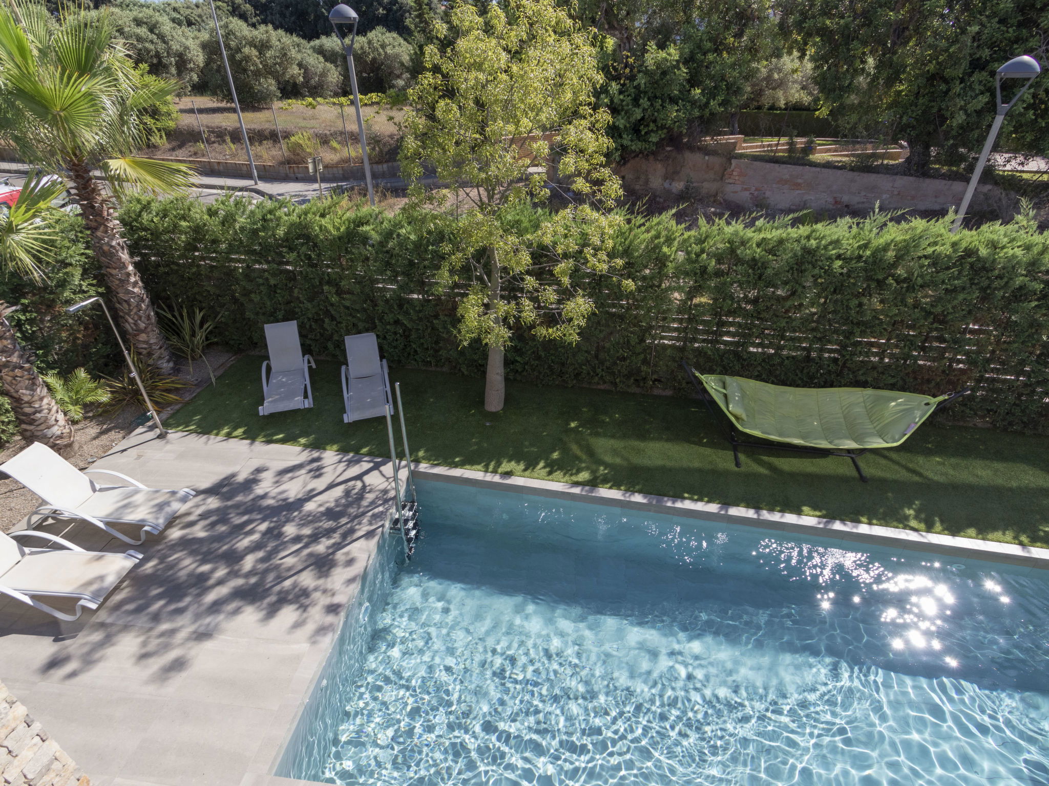 Cambrils: Very modern, beautiful villa "Ardiaca", 3 storeys, built in 2018. In a quiet, sunny position residential area (villas), 200 m from the sea, 200 m from the beach. For shared use: table tennis. Private: large, well-kept garden with lawn 250 m2 trees, swimming pool angular (36 m2, seasonal availability: 01.Jan. - 31.Dec.). Outdoor shower, terrace, garden furniture, barbecue, pool maintenance by the owner/gardener. Public parking on the road. Grocery 600 m, supermarket 2.3 km, restaurant, bar 500 m, bakery 600 m, pedestrian zone 200 m, bicycle rental 4 km, bus stop "N-340 benzinera La Dorada" 900 m, railway station "Cambrils" 3 km. Sports harbour 3 km, golf course (18 hole) 12 km, surf school, sailing school 600 m, riding stable 9 km. Nearby attractions: Port Aventura / Ferrari Land 16 km, Aquopolis 20 km, Aquum Spa 20 km, Jumpland 5 km. Hiking paths: La Mussara 45 km. Please note: suitable for families. The owner does not accept any groups. The owner does not accept any youth groups. Neighbourhood highly sensitive to noise. Quietness and good behaviour expected.