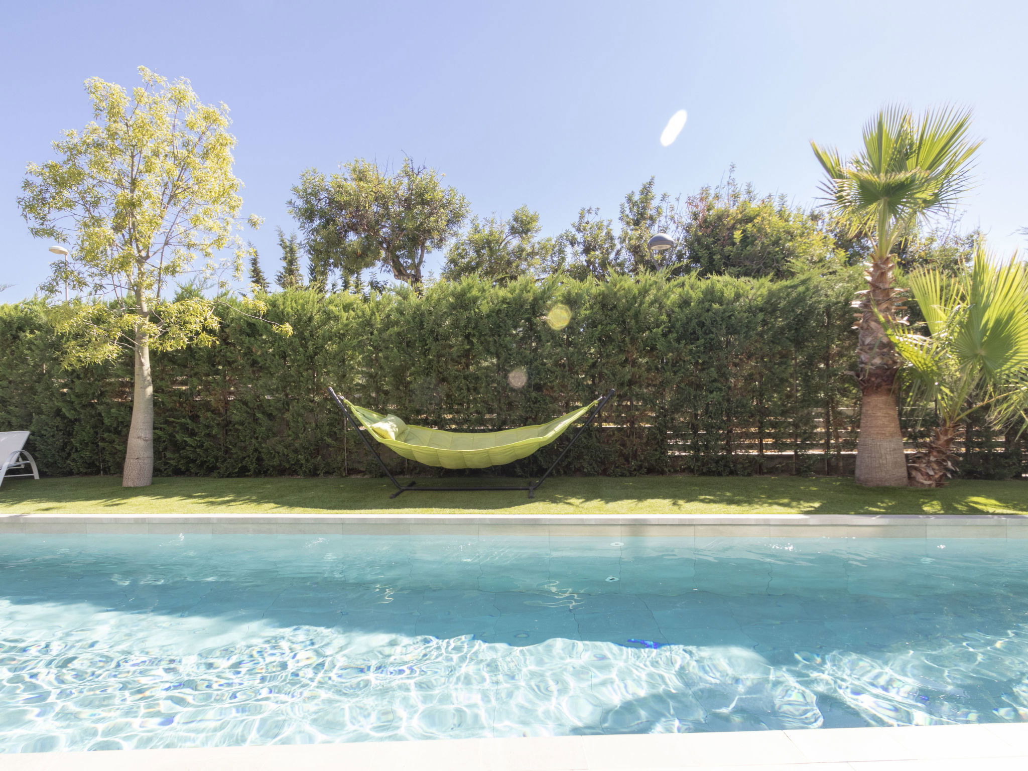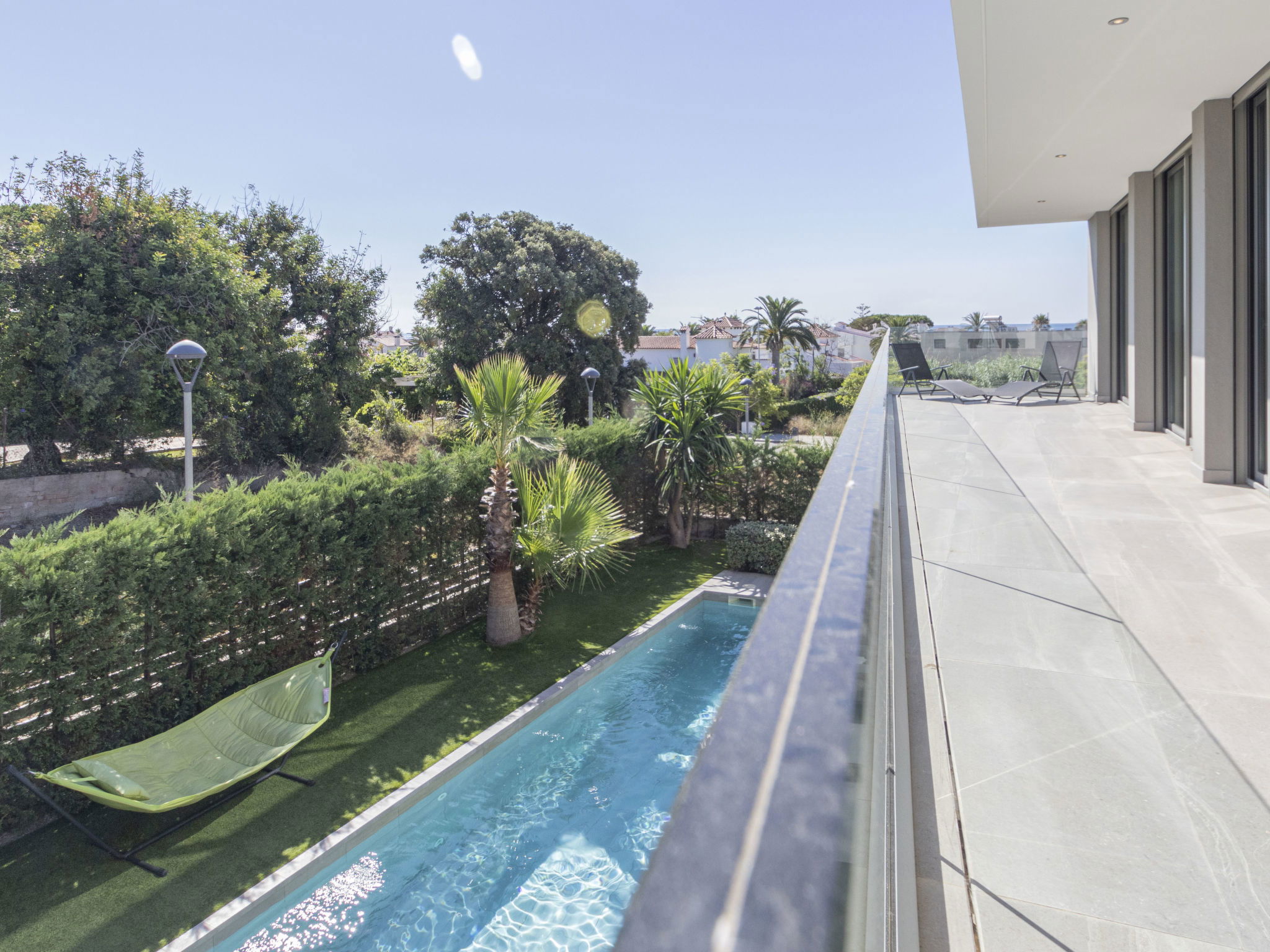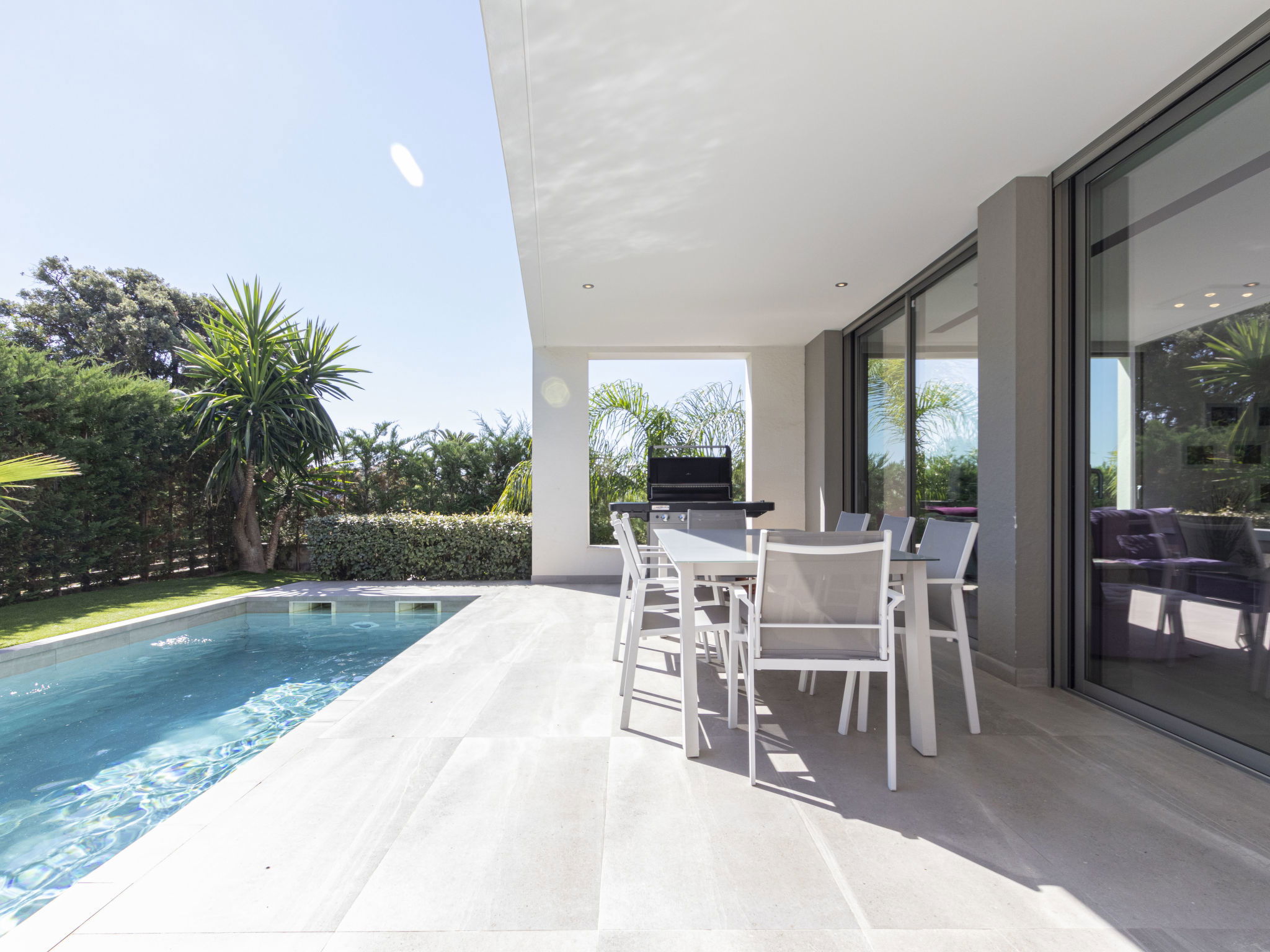 Cambrils: Very modern, beautiful villa "Ardiaca", 3 storeys, built in 2018. In a quiet, sunny position residential area (villas), 200 m from the sea, 200 m from the beach. For shared use: table tennis. Private: large, well-kept garden with lawn 250 m2 trees, swimming pool angular (36 m2, seasonal availability: 01.Jan. - 31.Dec.). Outdoor shower, terrace, garden furniture, barbecue, pool maintenance by the owner/gardener. Public parking on the road. Grocery 600 m, supermarket 2.3 km, restaurant, bar 500 m, bakery 600 m, pedestrian zone 200 m, bicycle rental 4 km, bus stop "N-340 benzinera La Dorada" 900 m, railway station "Cambrils" 3 km. Sports harbour 3 km, golf course (18 hole) 12 km, surf school, sailing school 600 m, riding stable 9 km. Nearby attractions: Port Aventura / Ferrari Land 16 km, Aquopolis 20 km, Aquum Spa 20 km, Jumpland 5 km. Hiking paths: La Mussara 45 km. Please note: suitable for families. The owner does not accept any groups. The owner does not accept any youth groups. Neighbourhood highly sensitive to noise. Quietness and good behaviour expected.