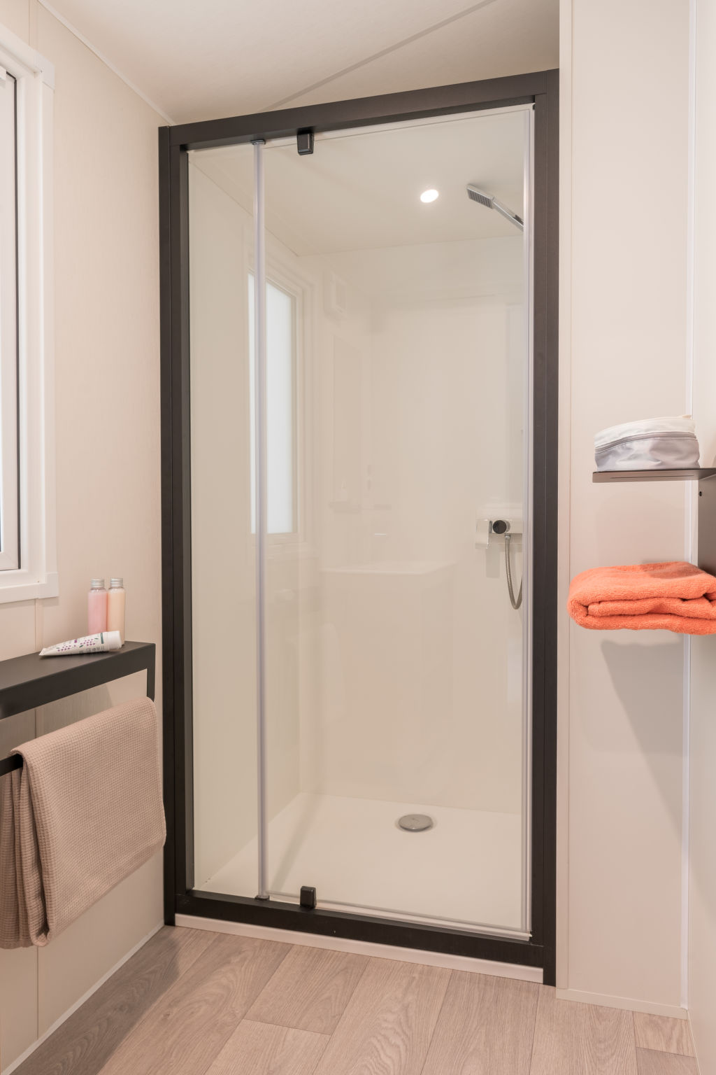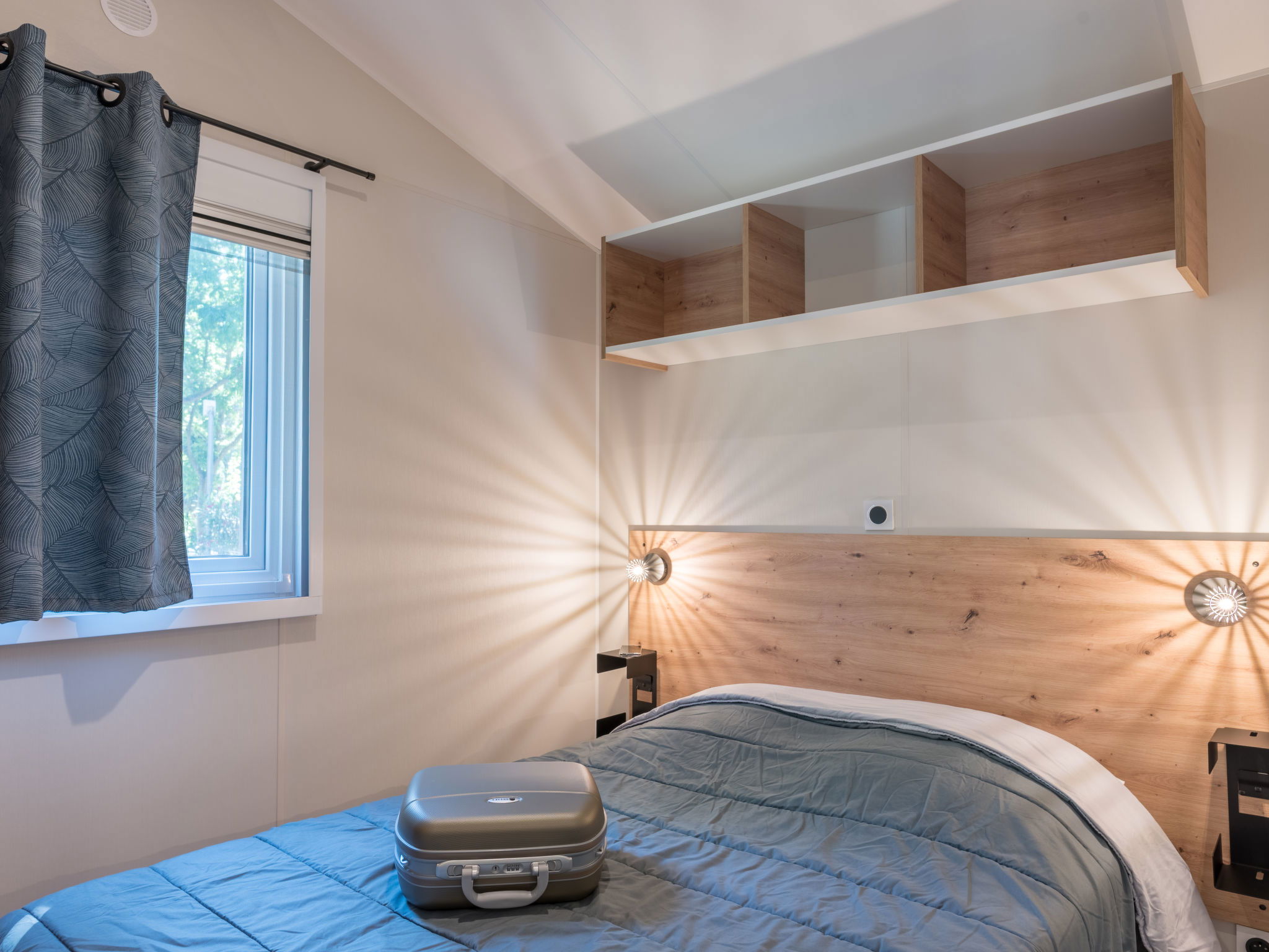 "Le Mediterranée", 4-room mobile home 32 m2. Comfortable furnishings: living/dining room with dining table and TV (flat screen). Exit to the terrace. 1 room with 1 french bed (140 cm, length 190 cm). 2 rooms, each room with 2 beds (80 cm, length 190 cm). Open kitchen (4 gas rings, microwave, freezer, electric coffee machine). Shower, sep. WC. Air-conditioning, forced-air heating. Terrace partly roofed. Terrace furniture, deck chairs (2). Facilities: children's high chair, baby cot for up to 2 year olds (extra). Internet (WiFi, extra). Please note: maximum 1 pet/ dog allowed. Smoke alarm.