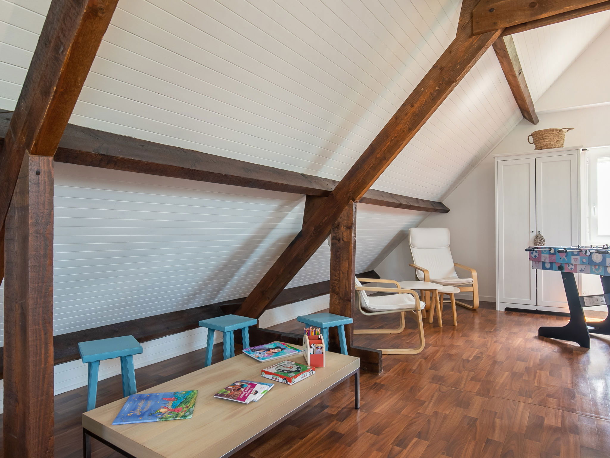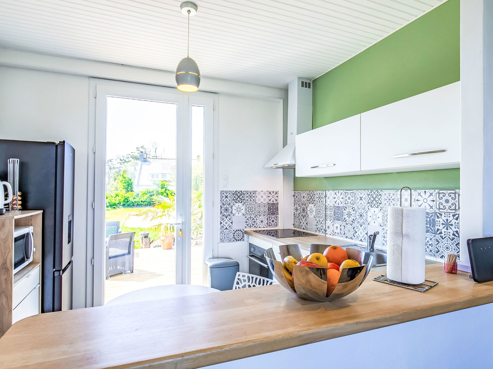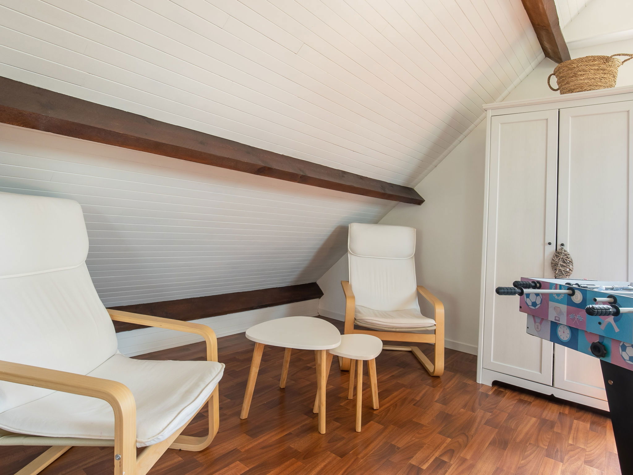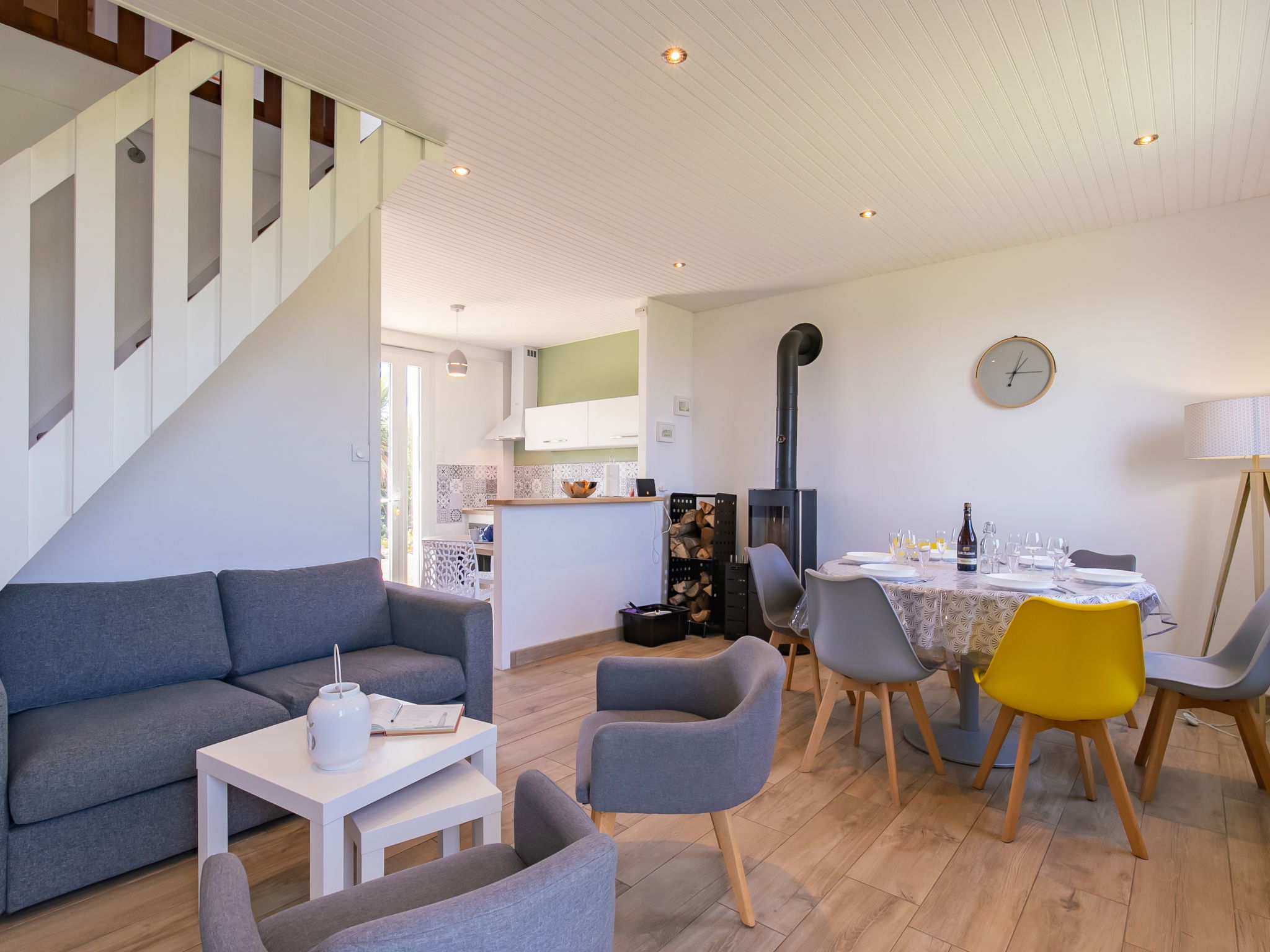 "Le Bruit de la Mer - ", 4-room house 90 m2. Bright, fully renovated in 2021, comfortable and tasteful furnishings: living/dining room with satellite TV, international TV channels and wood-burning stove. Exit to the garden, to the terrace. 2 rooms, each room with 1 french bed (160 cm, length 200 cm). Open kitchen (oven, dishwasher, 4 ceramic glass hob hotplates, toaster, kettle, microwave, freezer, electric coffee machine) with small dining table. Exit to the terrace. Shower, sep. WC. Upper floor: (steep stair) open living/sleeping room 20 m2, with sloping ceilings with 2 beds (90 cm, length 190 cm), electric heating. Parquet floors. Terrace, south facing position and west facing position. Terrace furniture, barbecue (portable), deck chairs (2), box-room. Facilities: washing machine, dryer, iron. Internet (WiFi, free). Please note: non-smoking house. Maximum 2 pets/ dogs allowed. Smoke alarm.