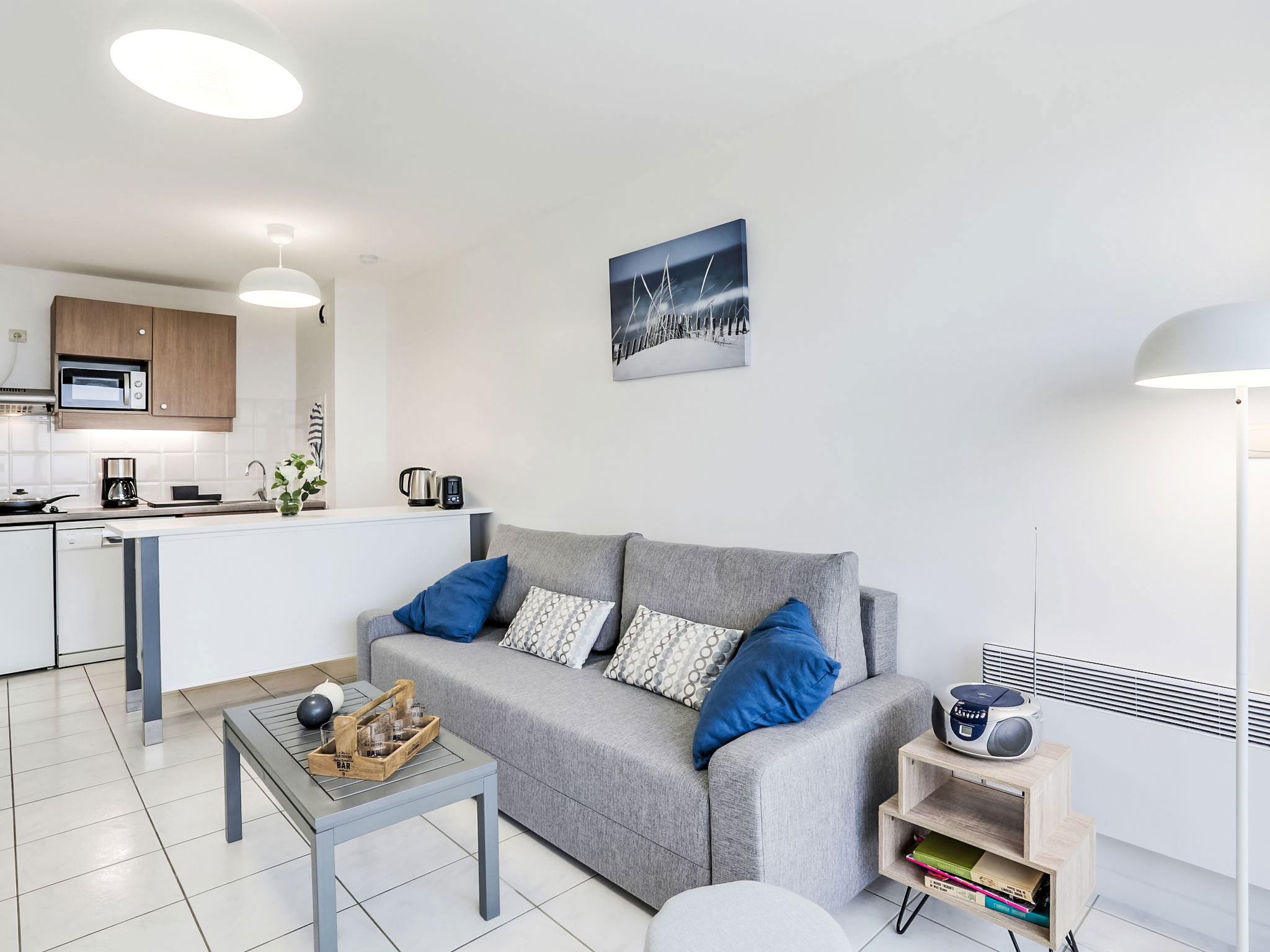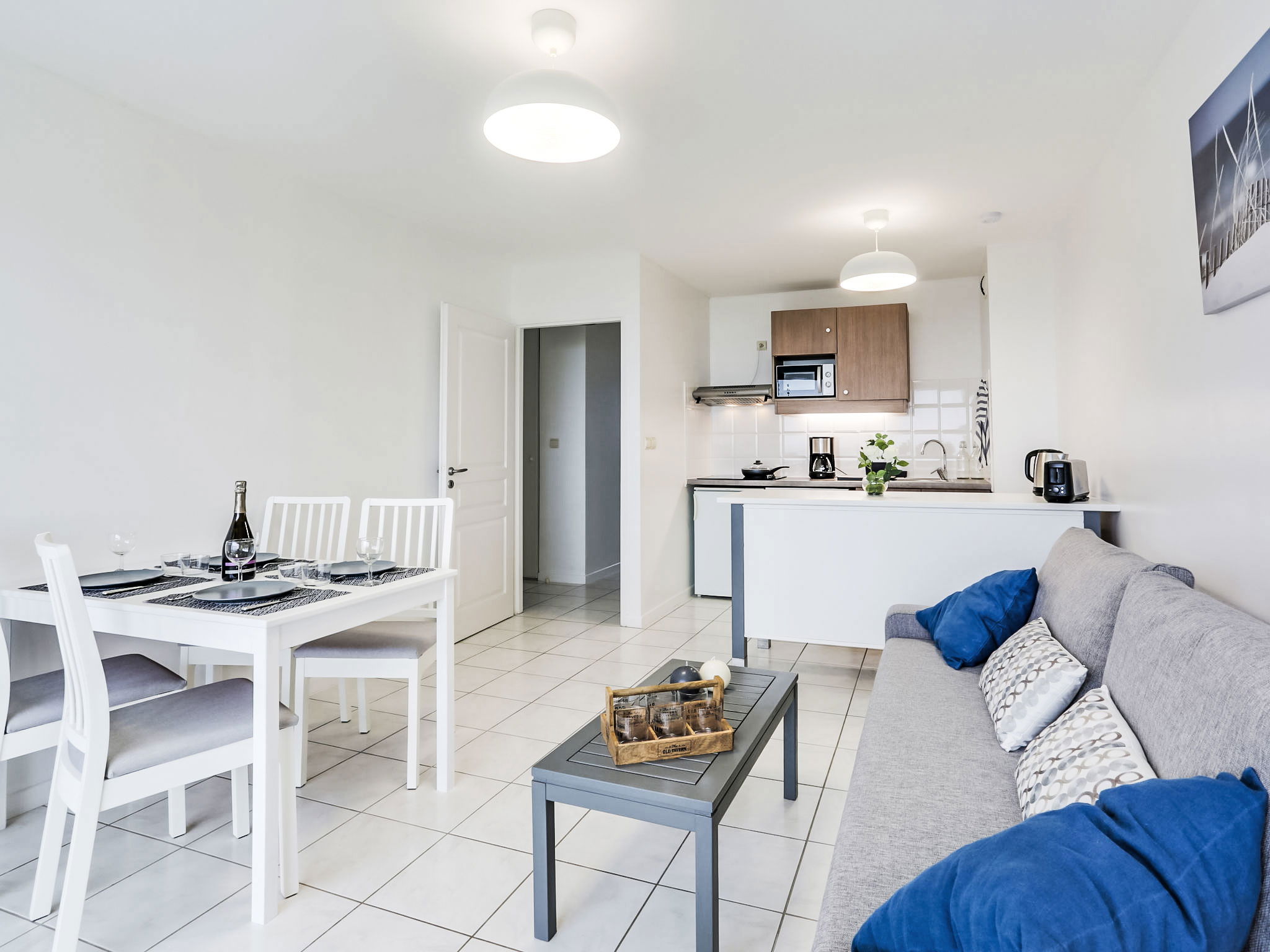 3-room apartment 54 m2 on 2nd floor. Beautiful furnishings: living/dining room with TV (flat screen). Exit to the balcony. 1 room with 1 french bed (1 x 160 cm, length 200 cm). 1 room with 2 beds. Kitchenette (dishwasher, 1 ceramic glass hob hotplate, 4 gas rings, microwave, electric coffee machine). Bathroom, sep. WC. Electric heating. Balcony. Balcony furniture. View of the sea. Facilities: washing machine. Internet (WiFi, free). Parking. Please note: maximum 1 pet/ dog allowed. TV only FR, DE. Smoke alarm. Please note: private cellar for bicycles and surfboards.