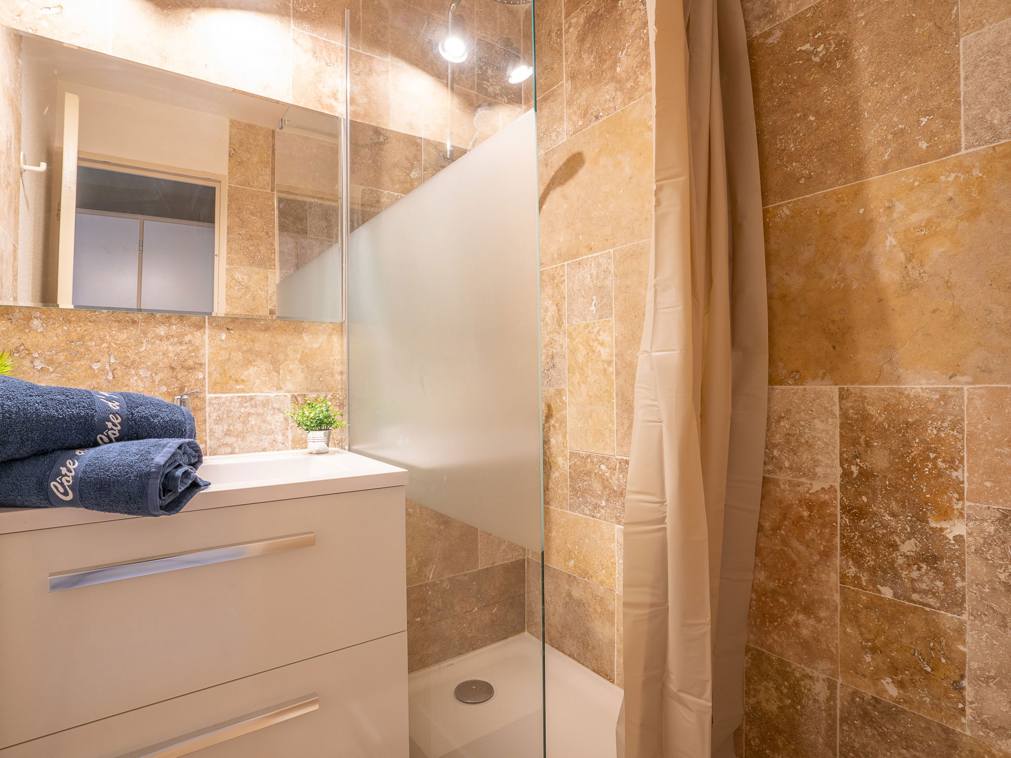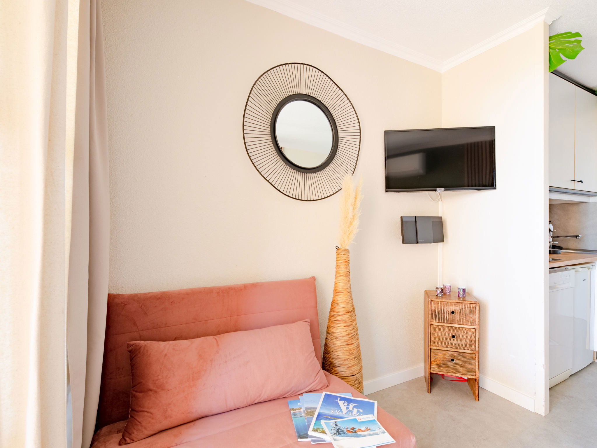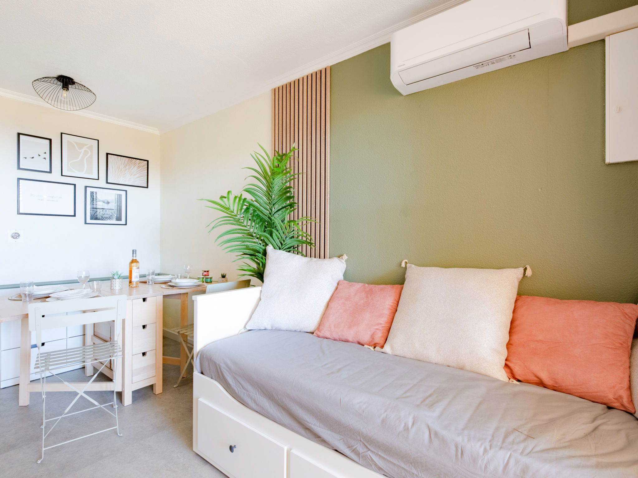 "L'Esquinade ", 2-room apartment 30 m2, on the ground floor. Renovated in 2022, comfortable furnishings: living room with 1 pull-out bed (2 x 80 cm, length 190 cm), TV (flat screen), air conditioning. Exit to the terrace, to the patio. 1 room with 1 french bed (140 cm, length 190 cm). Kitchenette (2 hot plates, dishwasher, toaster, kettle, microwave, freezer, electric coffee machine, Capsules for coffee machine (Nespresso) extra). Shower, sep. WC. Electric heating. Terrace 12 m2, patio. Terrace furniture, deck chairs (1). View of the sea. Facilities: children's high chair, baby cot for up to 2 year olds. Internet (WiFi, extra). Parking space n 2670 (roofed, 1 car), height 180 cm. Please note: suitable for families. Non-smokers only. Maximum 1 small pet/ dog allowed. Smoke alarm. Offer by a private individual according to Art. 155, IV of CGI.