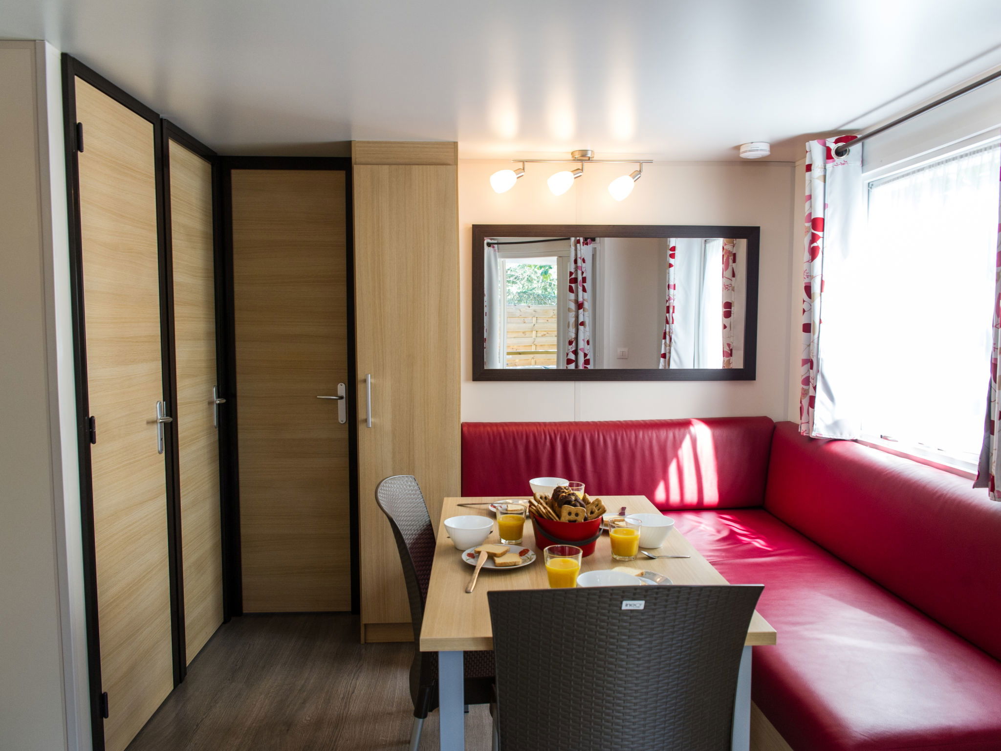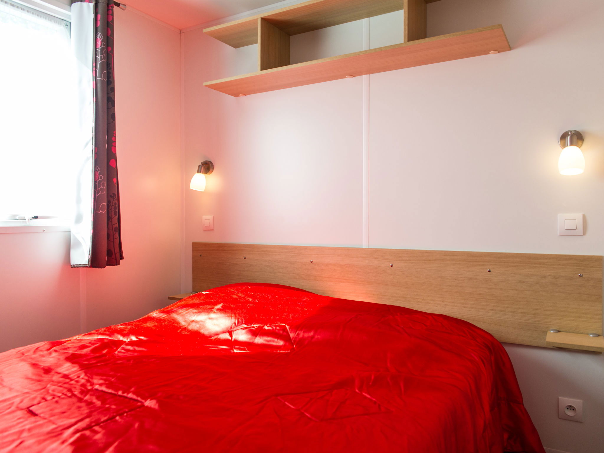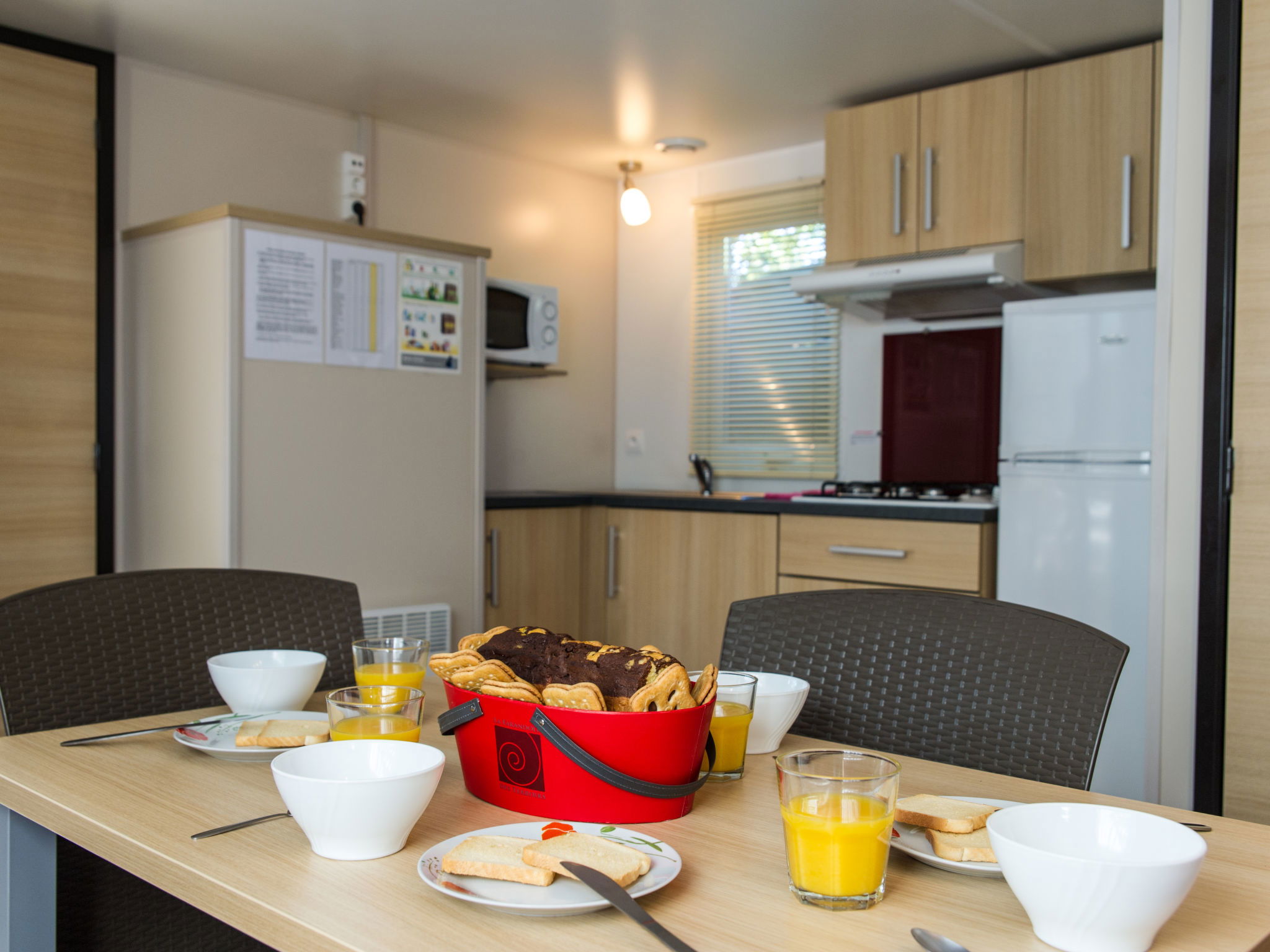 "Camping La Plage", 3-room mobile home 31 m2. Practical furnishings: living/dining room with TV (flat screen). Exit to the terrace. 1 room with 1 french bed (140 cm, length 190 cm). 1 room with 2 beds (70 cm, length 190 cm). Kitchenette (4 gas rings, microwave, freezer, electric coffee machine). Shower, sep. WC. Electric heating, air-conditioning. Terrace partly roofed. Terrace furniture. Facilities: children's high chair, baby cot for up to 2 year olds (extra). Internet (WiFi, extra). Please note: maximum 1 pet/ dog allowed. Smoke alarm.