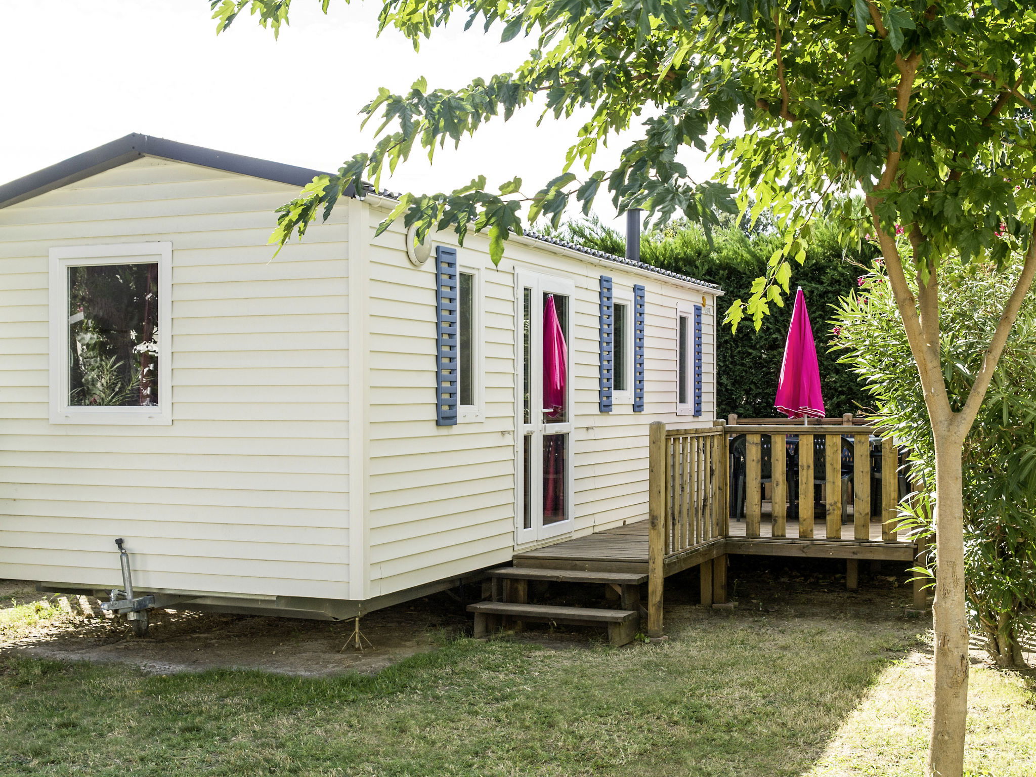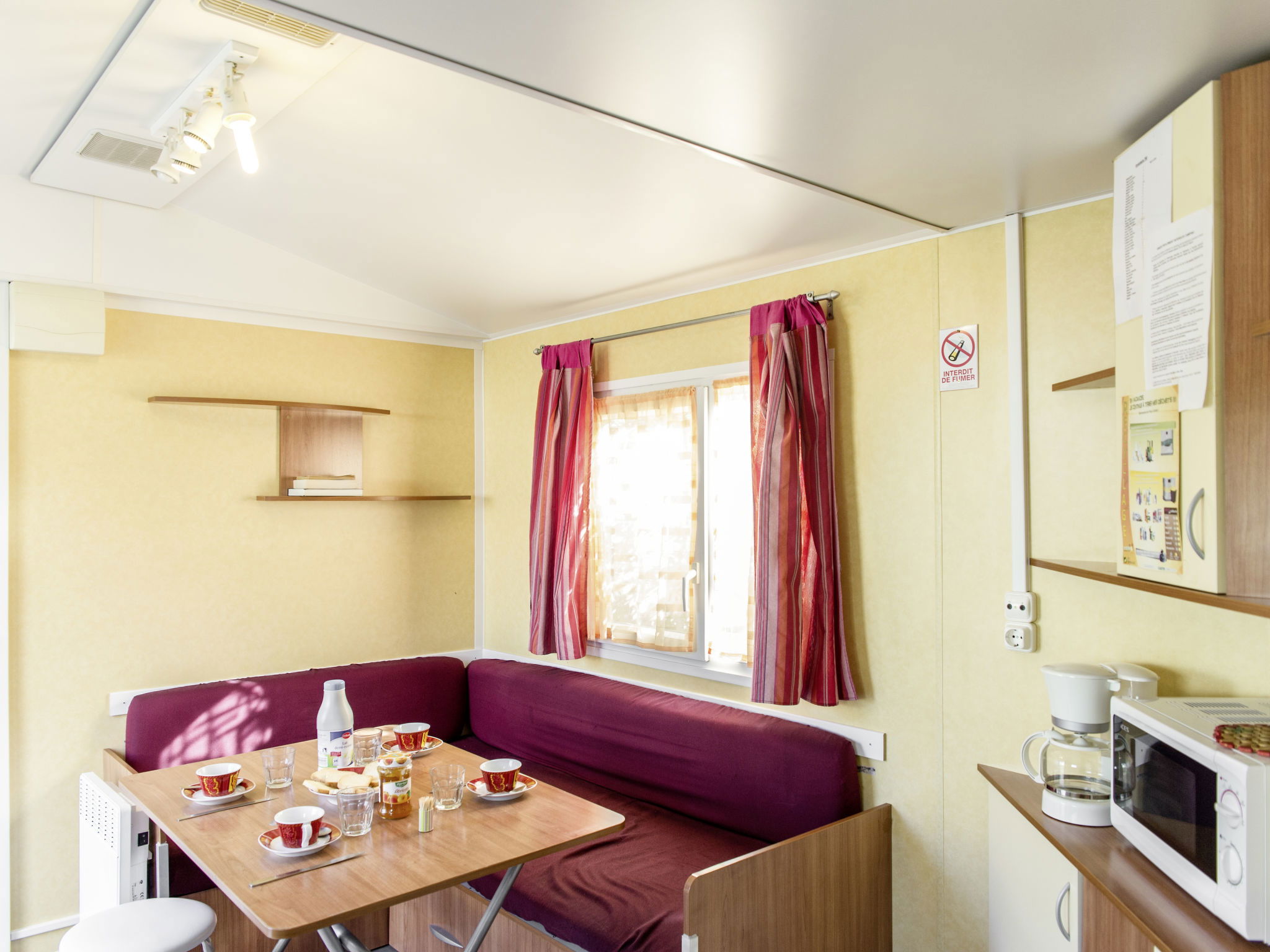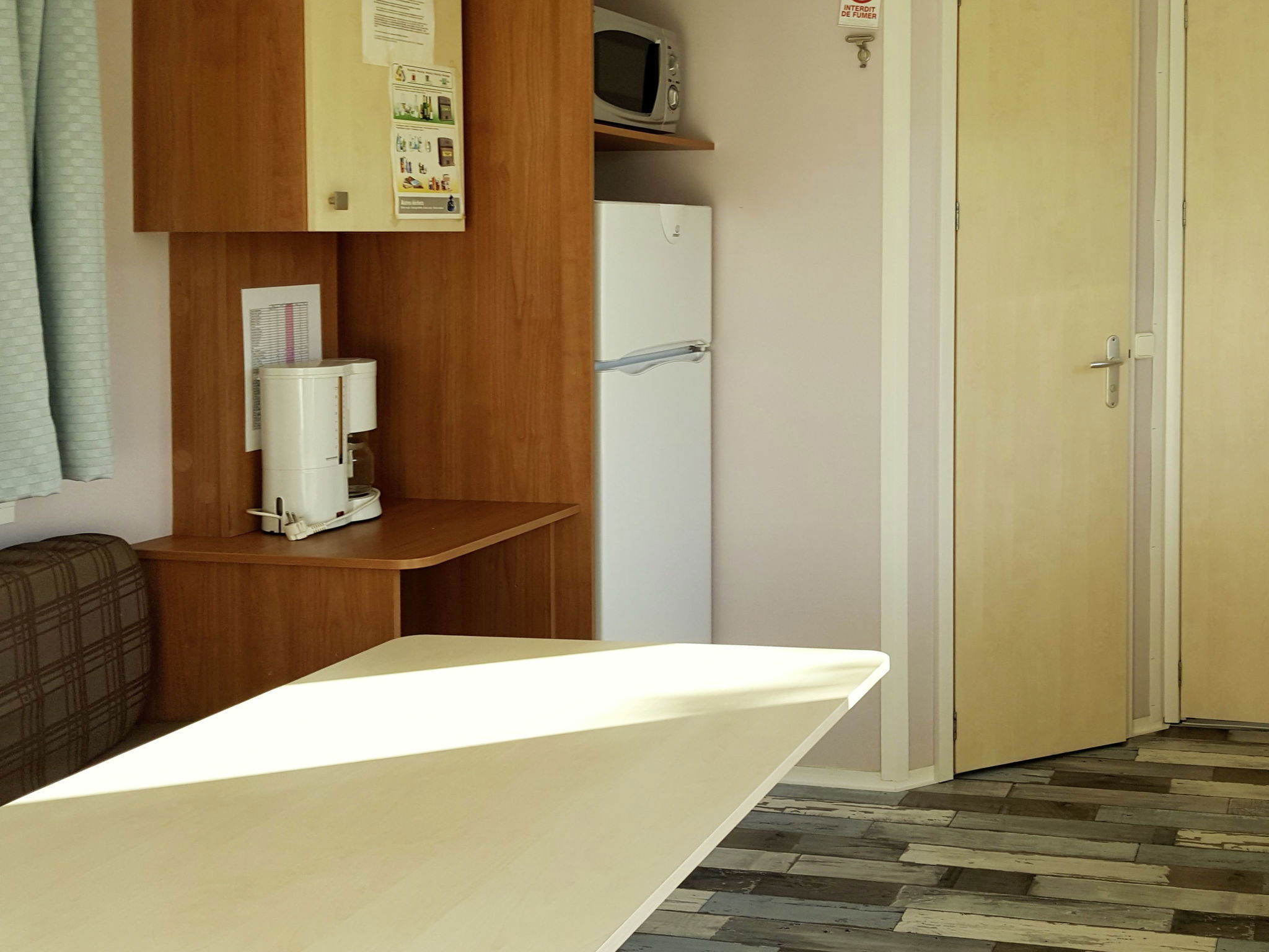"Camping La Plage", 3-room mobile home 21 m2. Practical furnishings: living/dining room with dining table, TV and flat screen. Exit to the terrace. 1 room with 1 french bed (140 cm, length 190 cm). 1 room with 2 beds (70 cm, length 190 cm). Kitchenette (2 gas rings, microwave, freezer, electric coffee machine). Shower, sep. WC. Electric heating. Terrace partly roofed. Terrace furniture. Facilities: children's high chair, baby cot for up to 2 year olds (extra). Internet (WiFi, extra). Please note: maximum 1 pet/ dog allowed. Smoke alarm.