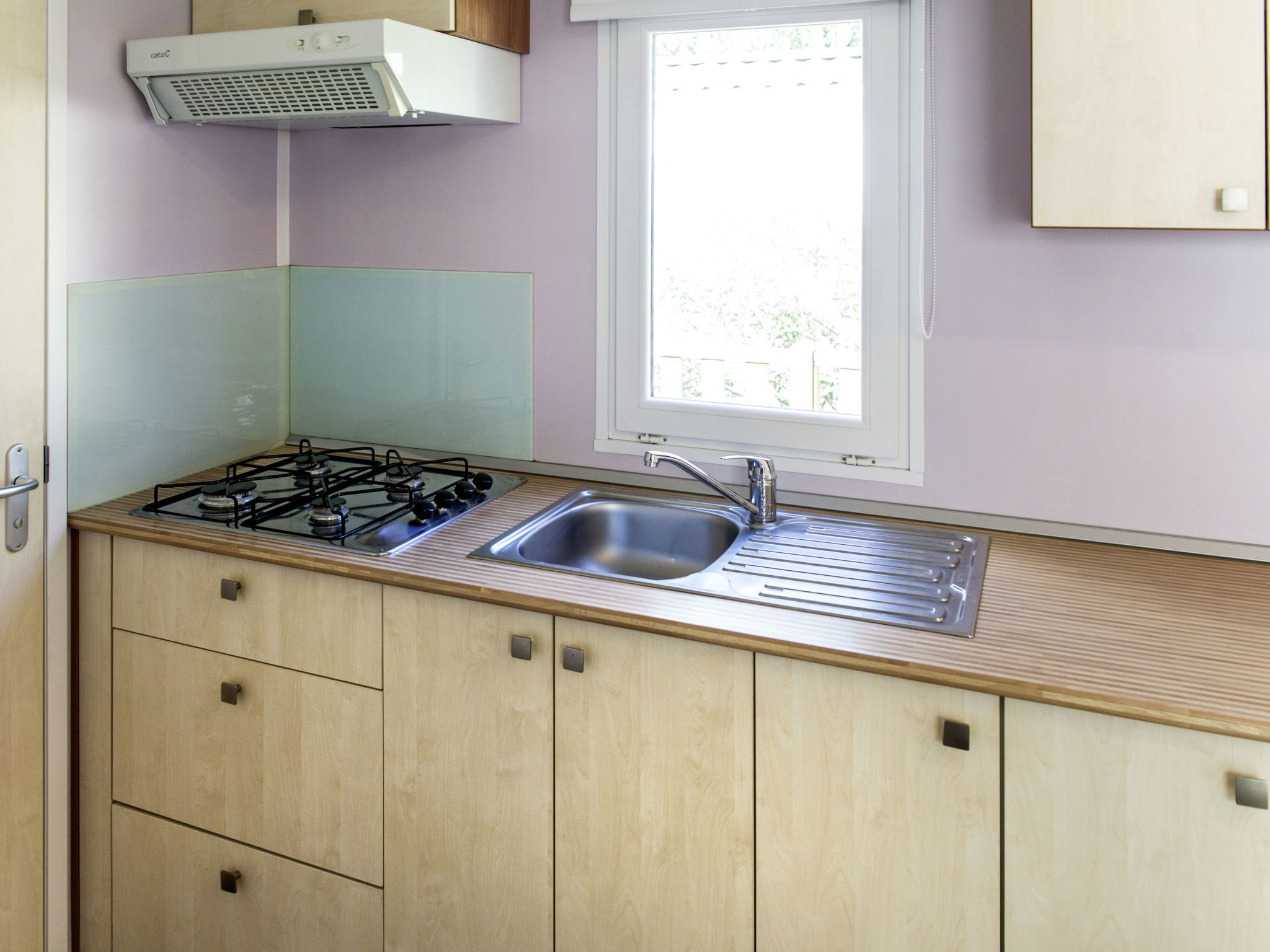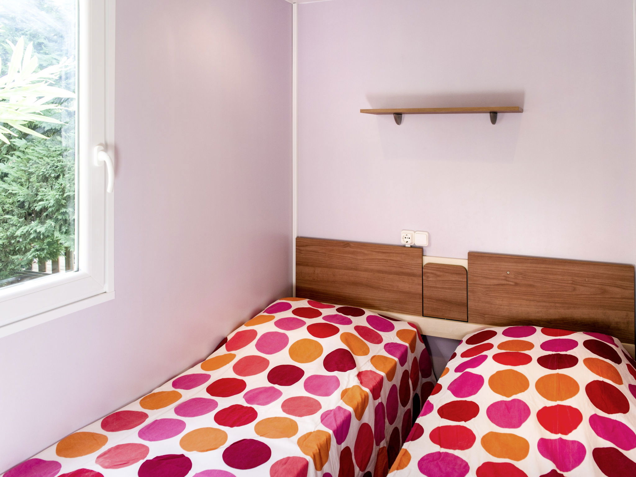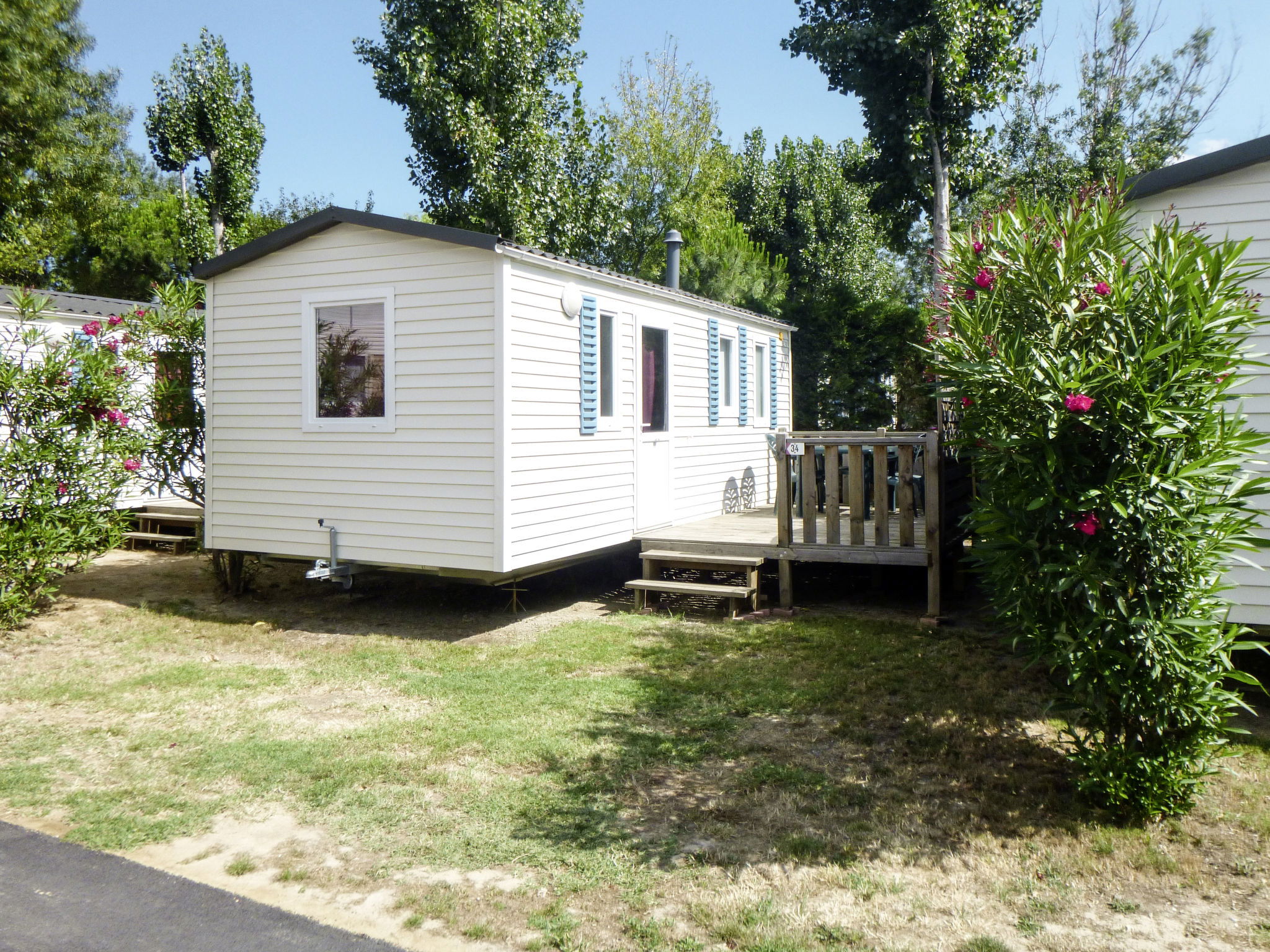 "Camping La Plage", 3-room mobile home 21 m2. Practical furnishings: living/dining room with dining table, TV and flat screen. Exit to the terrace. 1 room with 1 french bed (140 cm, length 190 cm). 1 room with 2 beds (70 cm, length 190 cm). Kitchenette (2 gas rings, microwave, freezer, electric coffee machine). Shower, sep. WC. Electric heating. Terrace partly roofed. Terrace furniture. Facilities: children's high chair, baby cot for up to 2 year olds (extra). Internet (WiFi, extra). Please note: maximum 1 pet/ dog allowed. Smoke alarm.