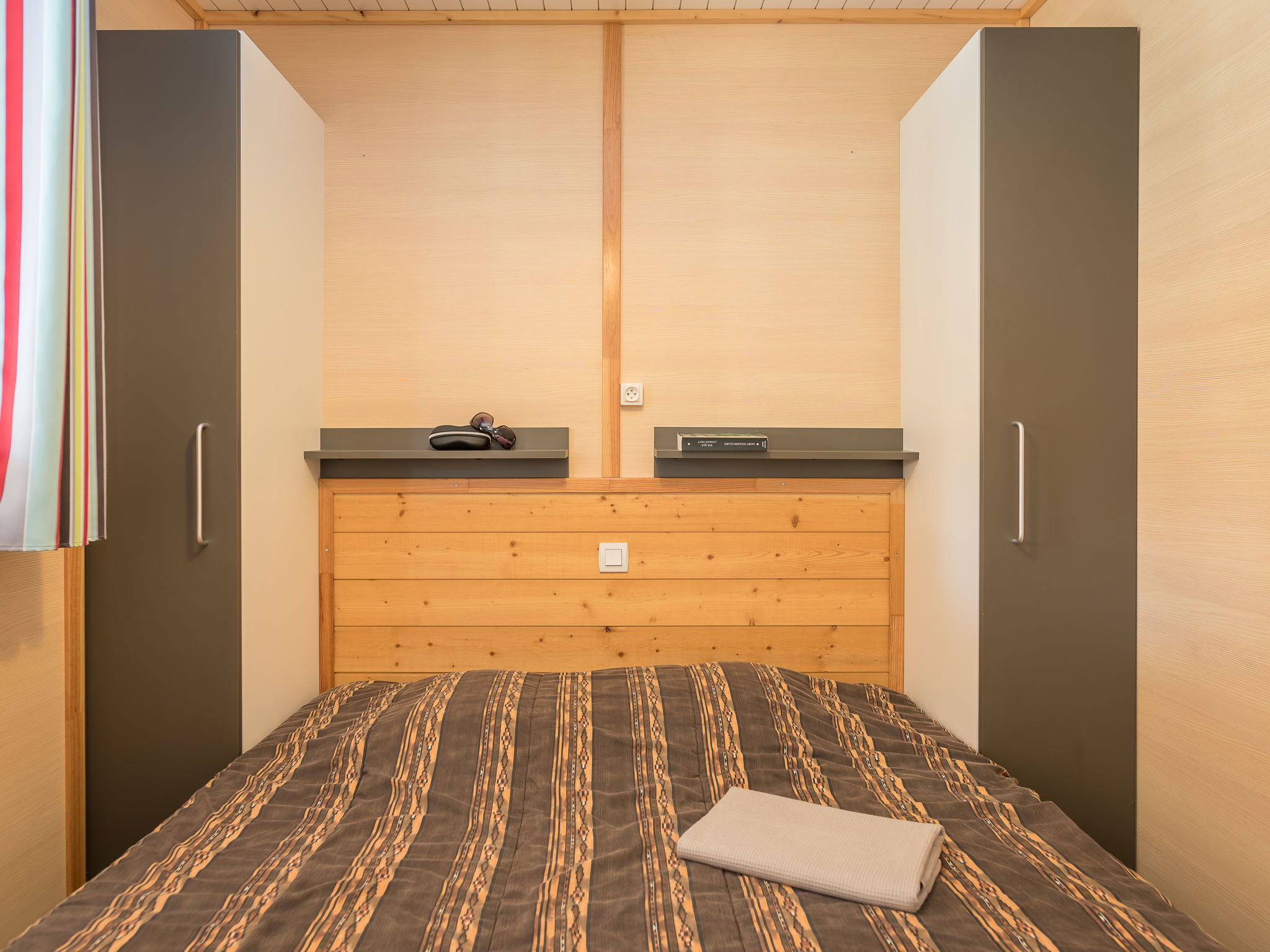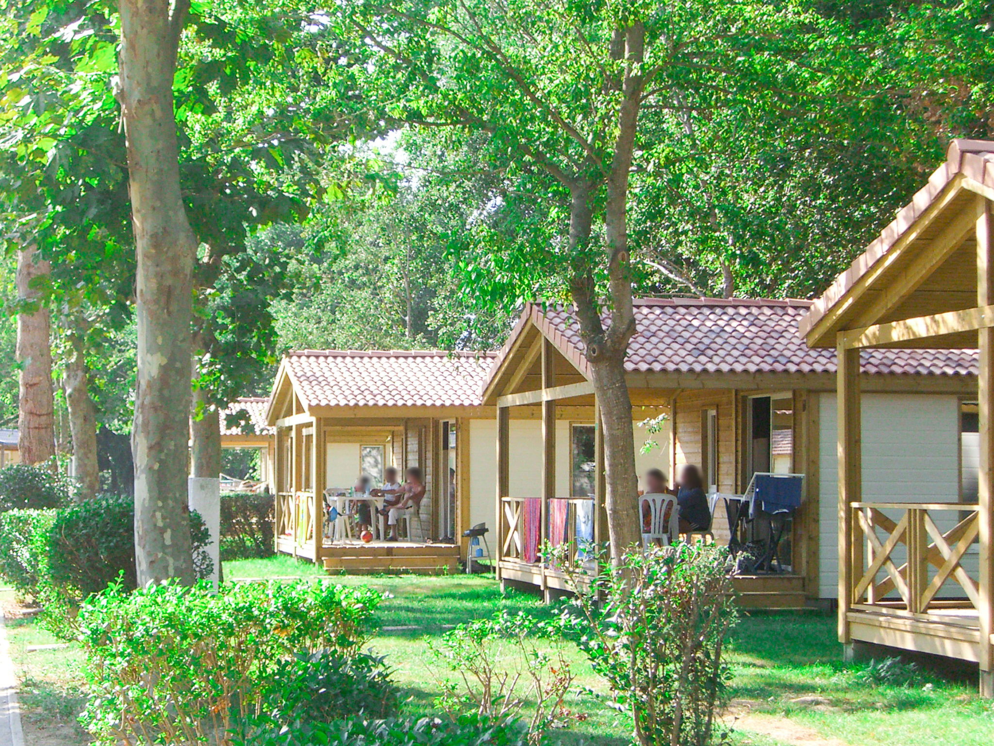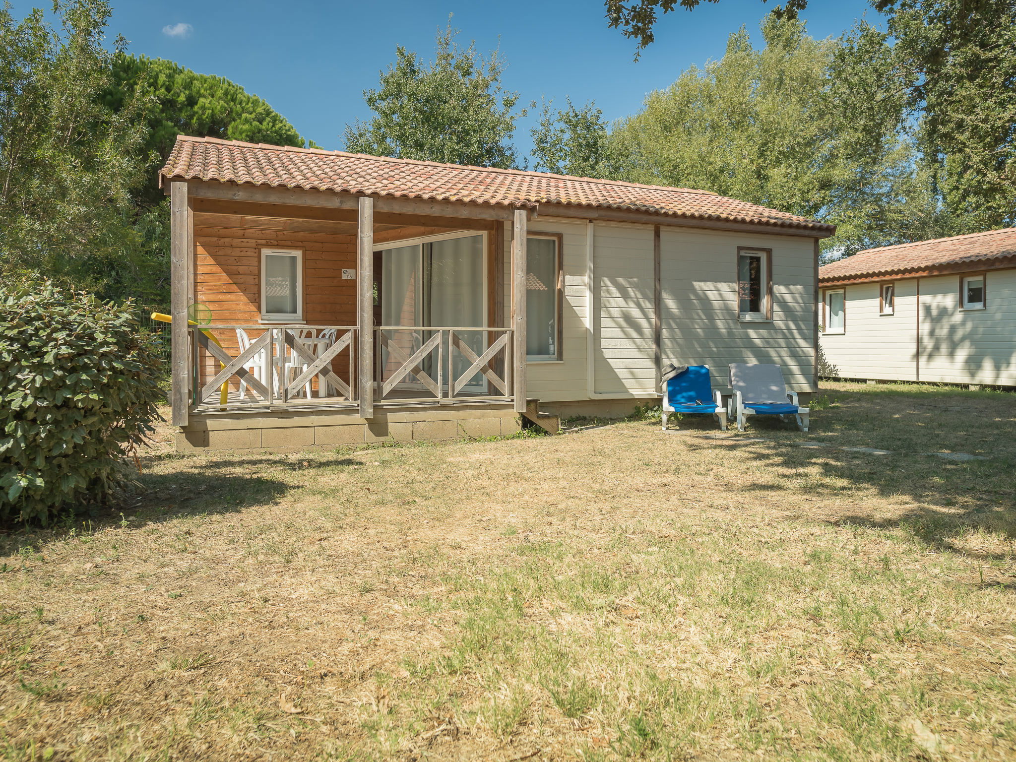 "Le Mediterranée", 4-room bungalow 35 m2. Modern furnishings: living/dining room with dining table and satellite TV (flat screen), air conditioning. Exit to the terrace. 1 room with 1 french bed (160 cm, length 200 cm). 1 room with 2 beds (80 cm, length 190 cm). 1 small room with 1 x 2 bunk beds (70 cm, length 190 cm). Kitchenette (4 ceramic glass hob hotplates, toaster, kettle, microwave, freezer, electric coffee machine). Shower, sep. WC. Electric heating, forced-air heating. Terrace roofed. Terrace furniture, deck chairs (2). Facilities: children's high chair, baby cot for up to 2 year olds (extra). Internet (WiFi, extra). Please note: maximum 1 pet/ dog allowed. Smoke alarm.
