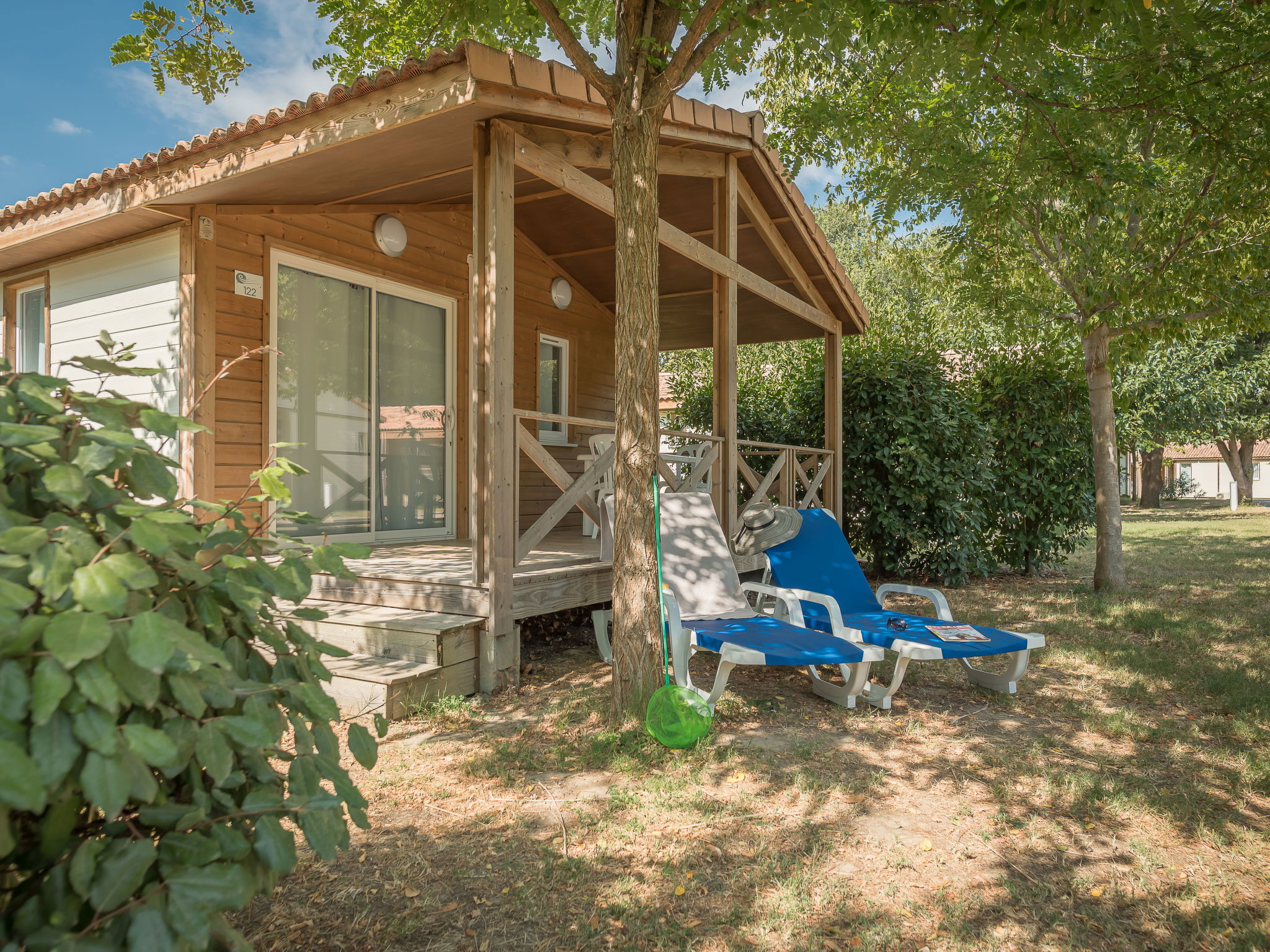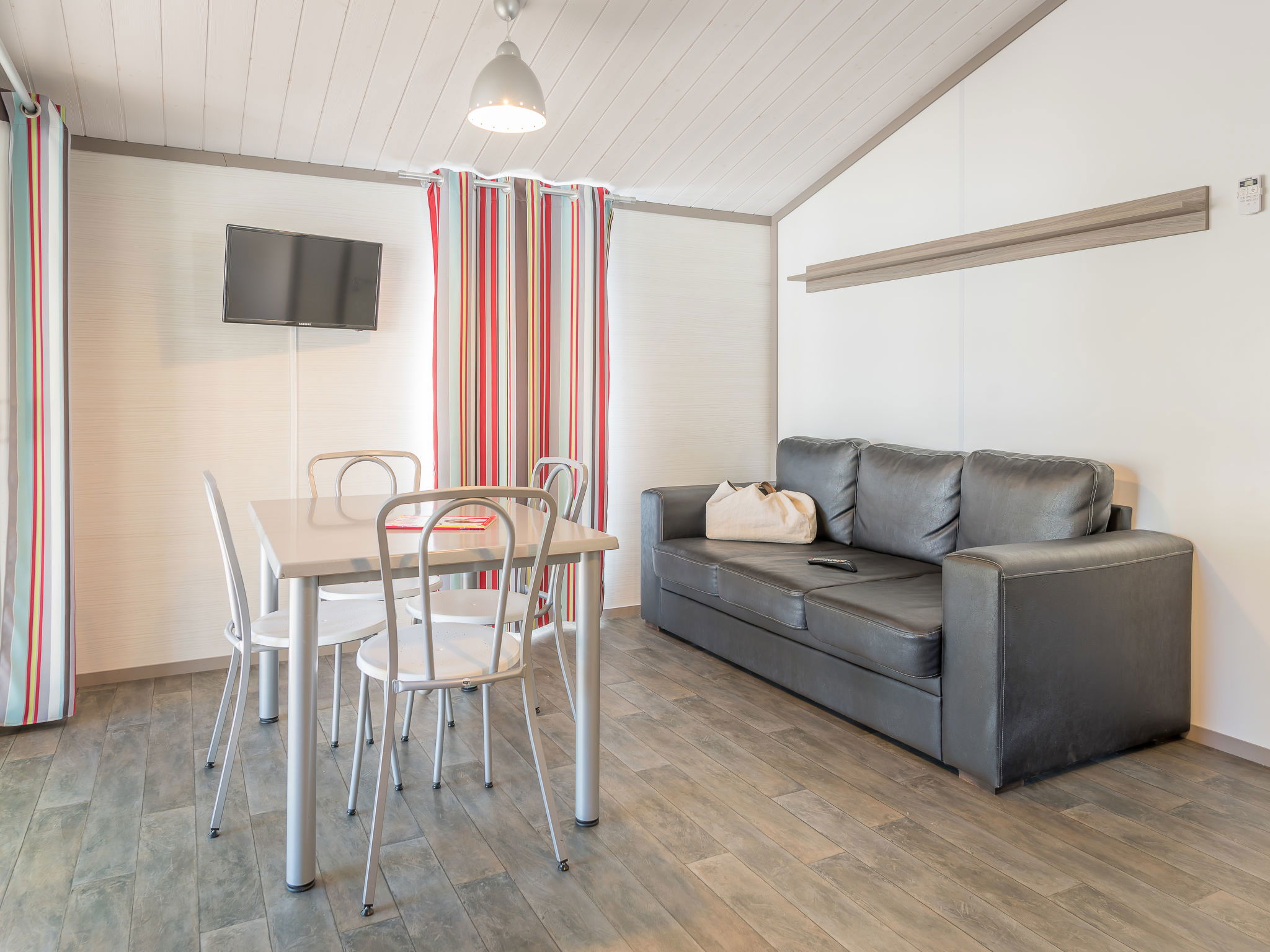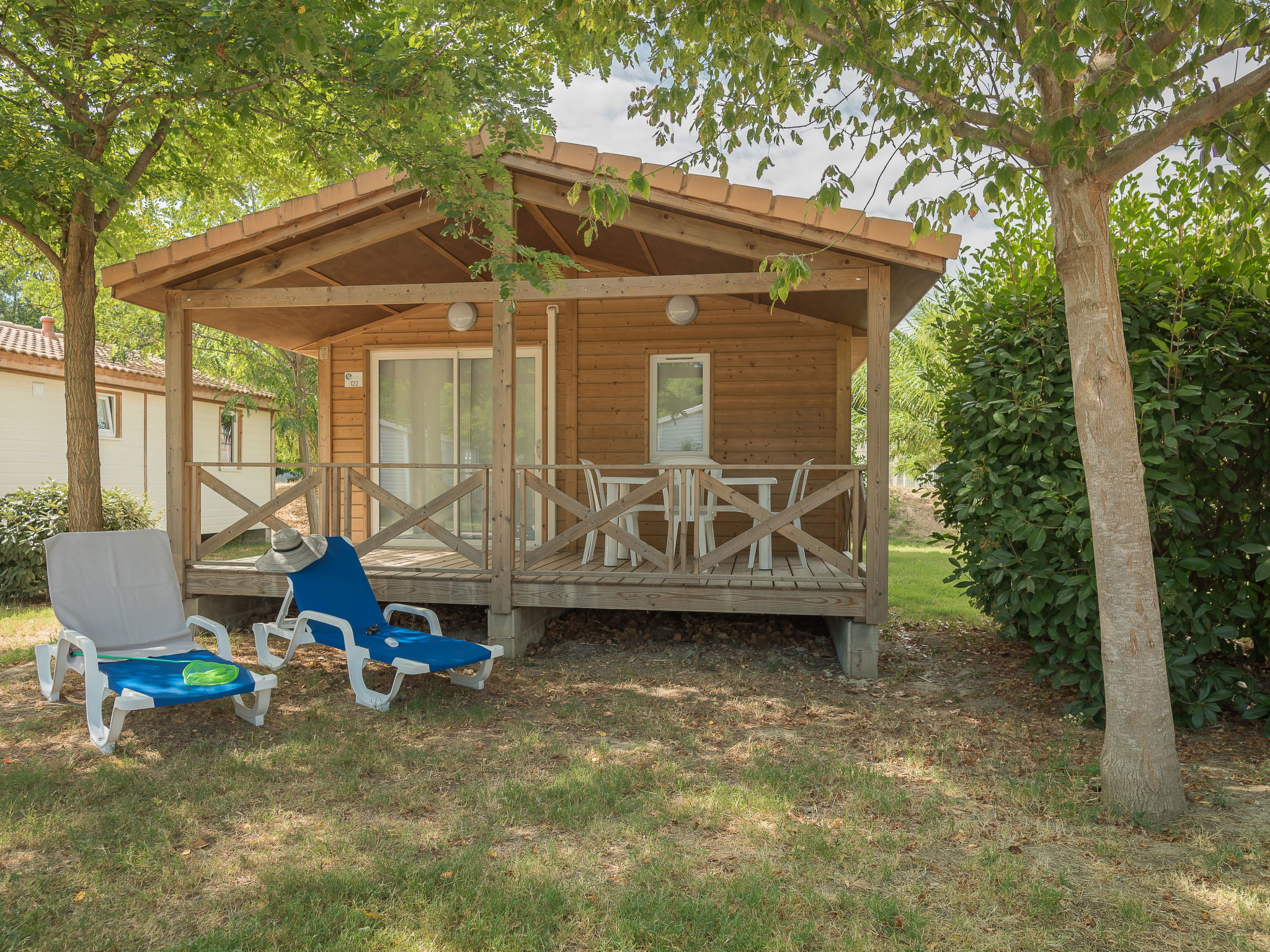 "Le Mediterranée", 3-room bungalow 35 m2. Modern furnishings: living/dining room with dining table and satellite TV (flat screen), air conditioning. Exit to the terrace. 1 room with 1 french bed (160 cm, length 200 cm). 1 room with 2 beds (80 cm, length 190 cm). Kitchenette (4 ceramic glass hob hotplates, toaster, kettle, microwave, freezer, electric coffee machine). Shower, sep. WC. Electric heating, air-conditioning, forced-air heating. Terrace roofed. Terrace furniture, deck chairs (2). Facilities: children's high chair, baby cot for up to 2 year olds (extra). Internet (WiFi, extra). Please note: maximum 1 pet/ dog allowed. Smoke alarm.