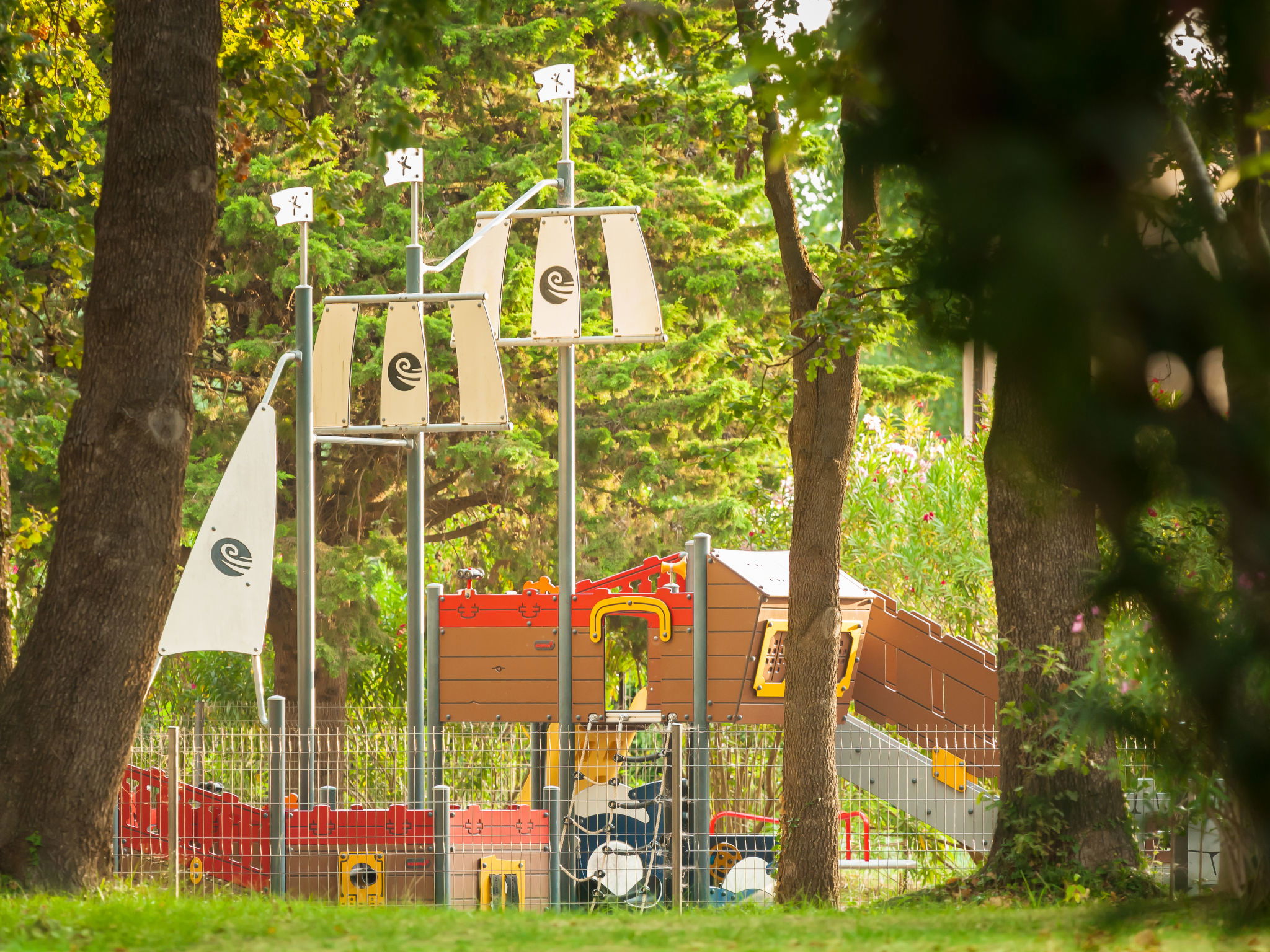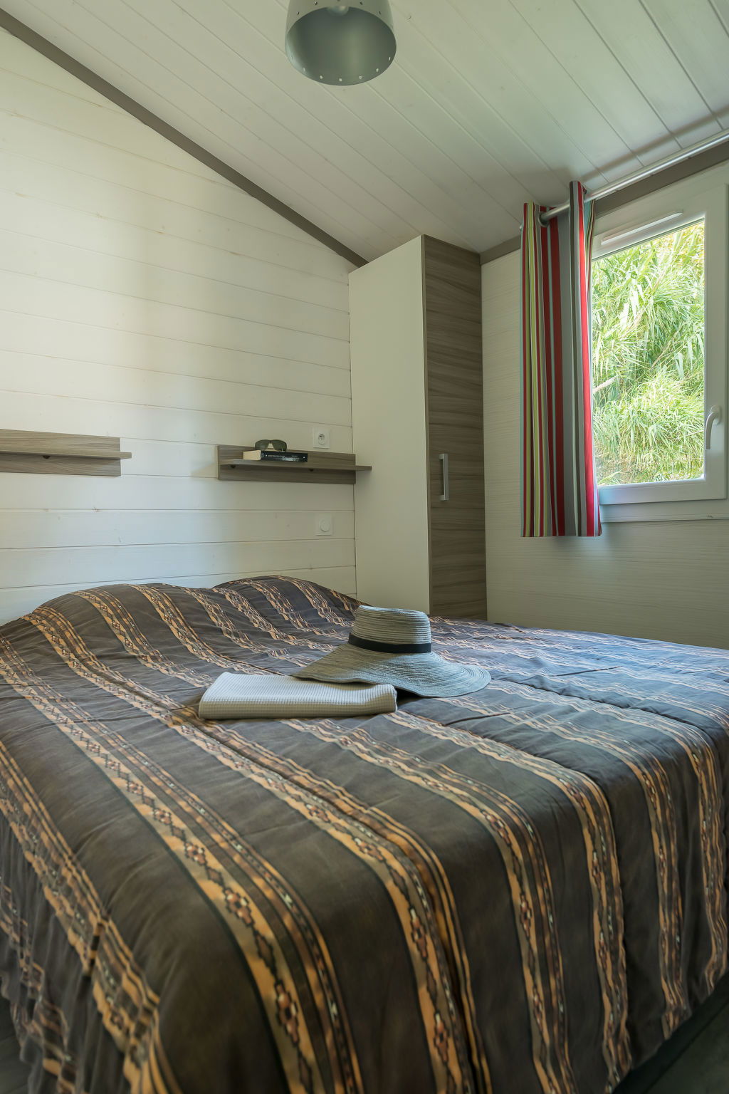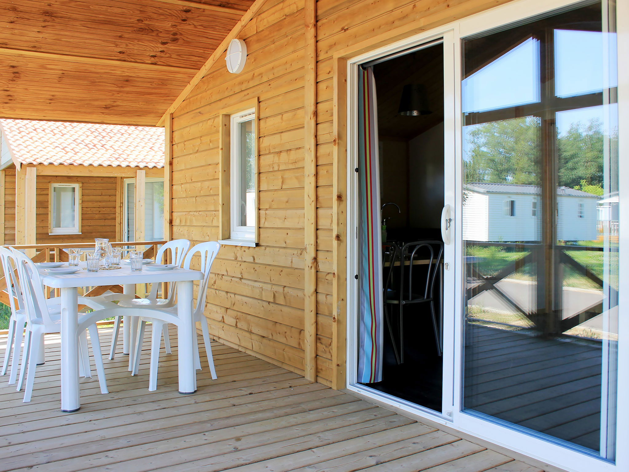 "Le Mediterranée", 3-room bungalow 35 m2. Modern furnishings: living/dining room with dining table and satellite TV (flat screen), air conditioning. Exit to the terrace. 1 room with 1 french bed (160 cm, length 200 cm). 1 room with 2 beds (80 cm, length 190 cm). Kitchenette (4 ceramic glass hob hotplates, toaster, kettle, microwave, freezer, electric coffee machine). Shower, sep. WC. Electric heating, air-conditioning, forced-air heating. Terrace roofed. Terrace furniture, deck chairs (2). Facilities: children's high chair, baby cot for up to 2 year olds (extra). Internet (WiFi, extra). Please note: maximum 1 pet/ dog allowed. Smoke alarm.