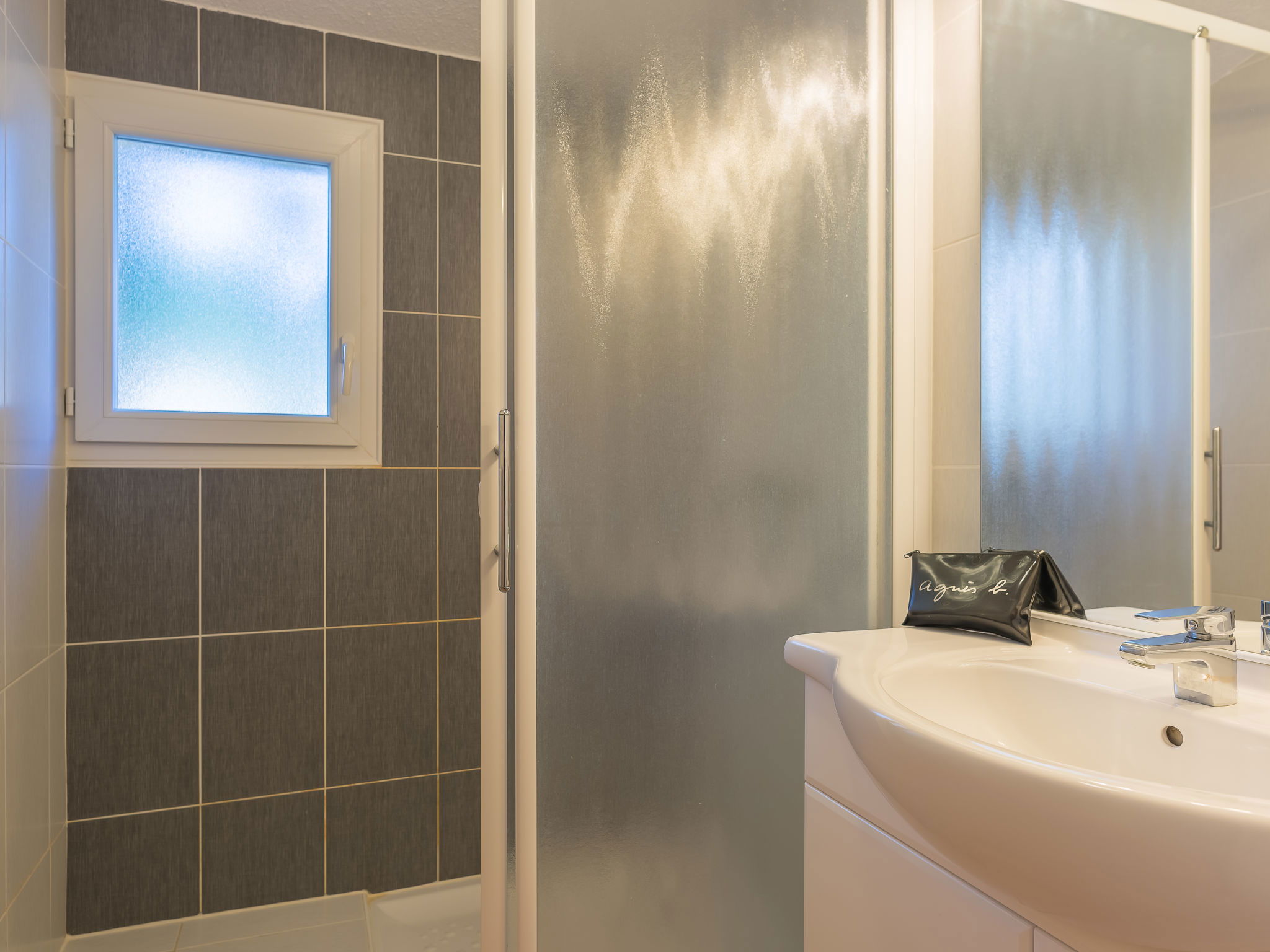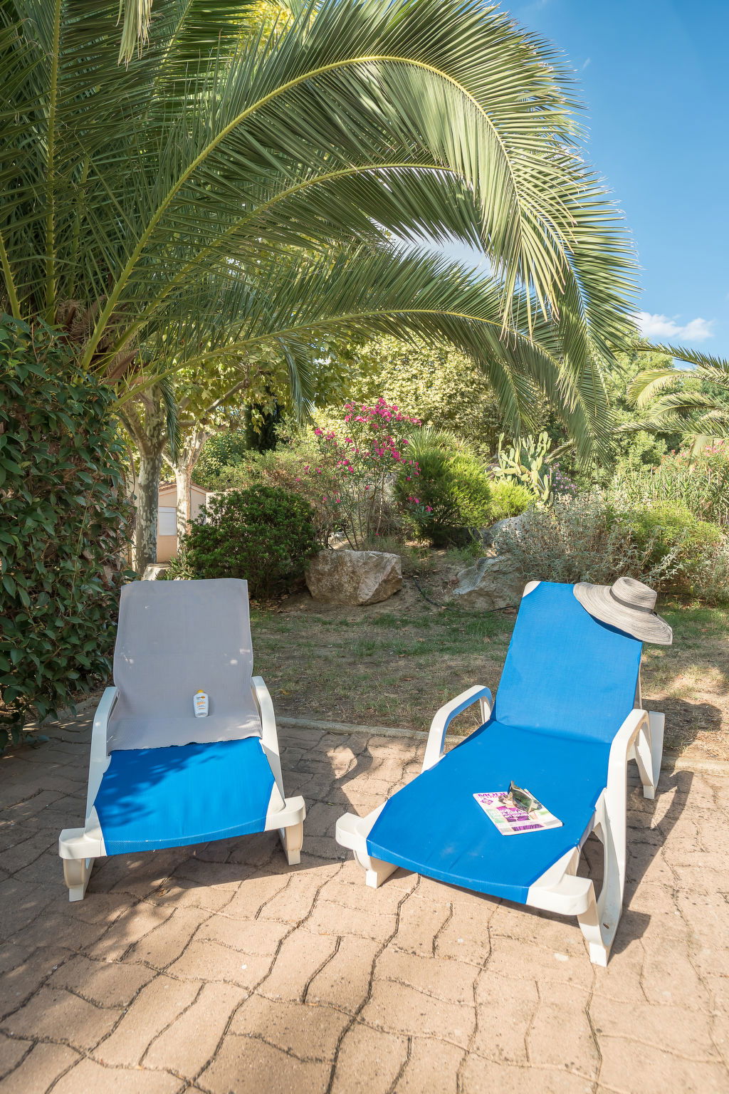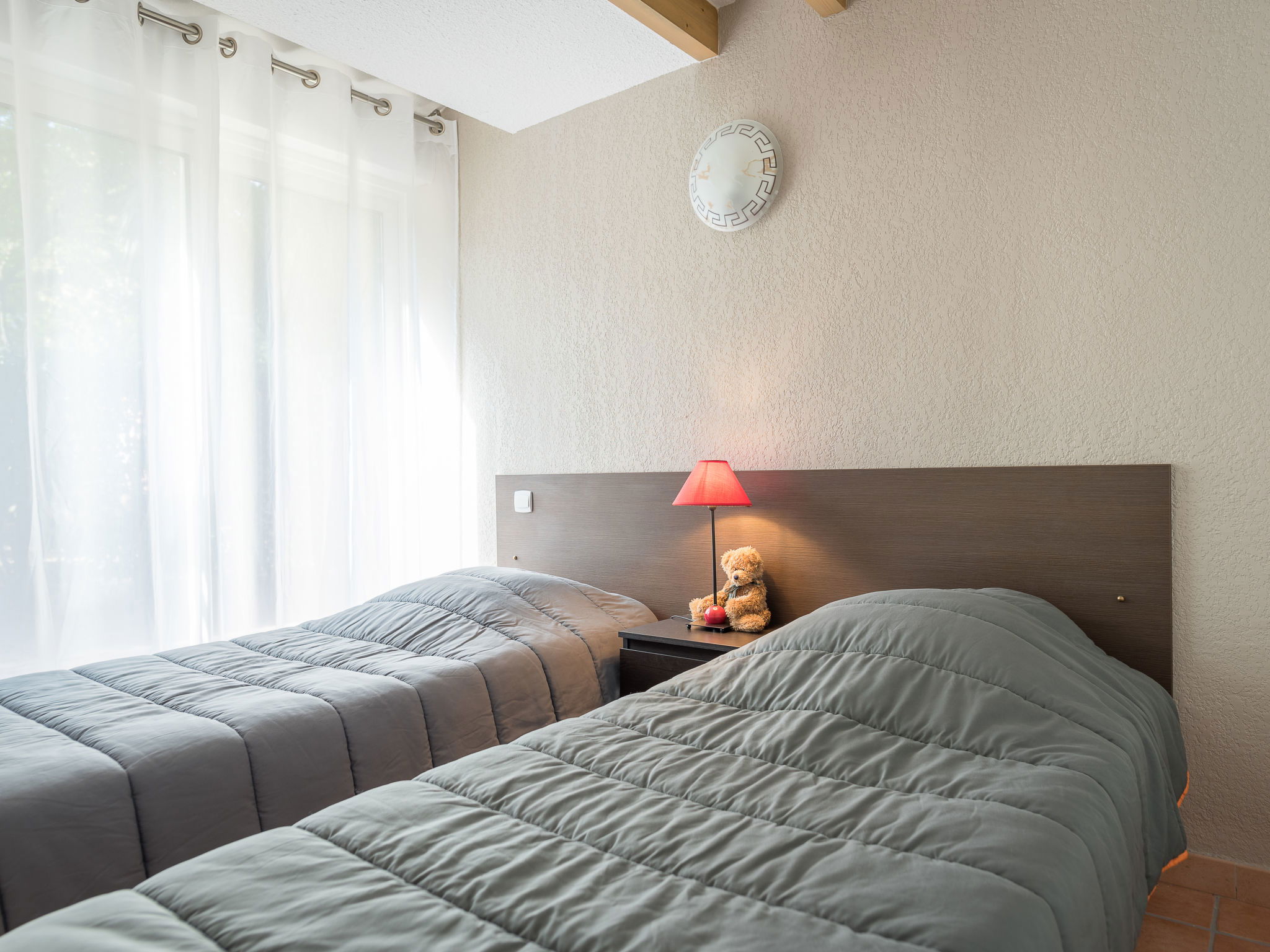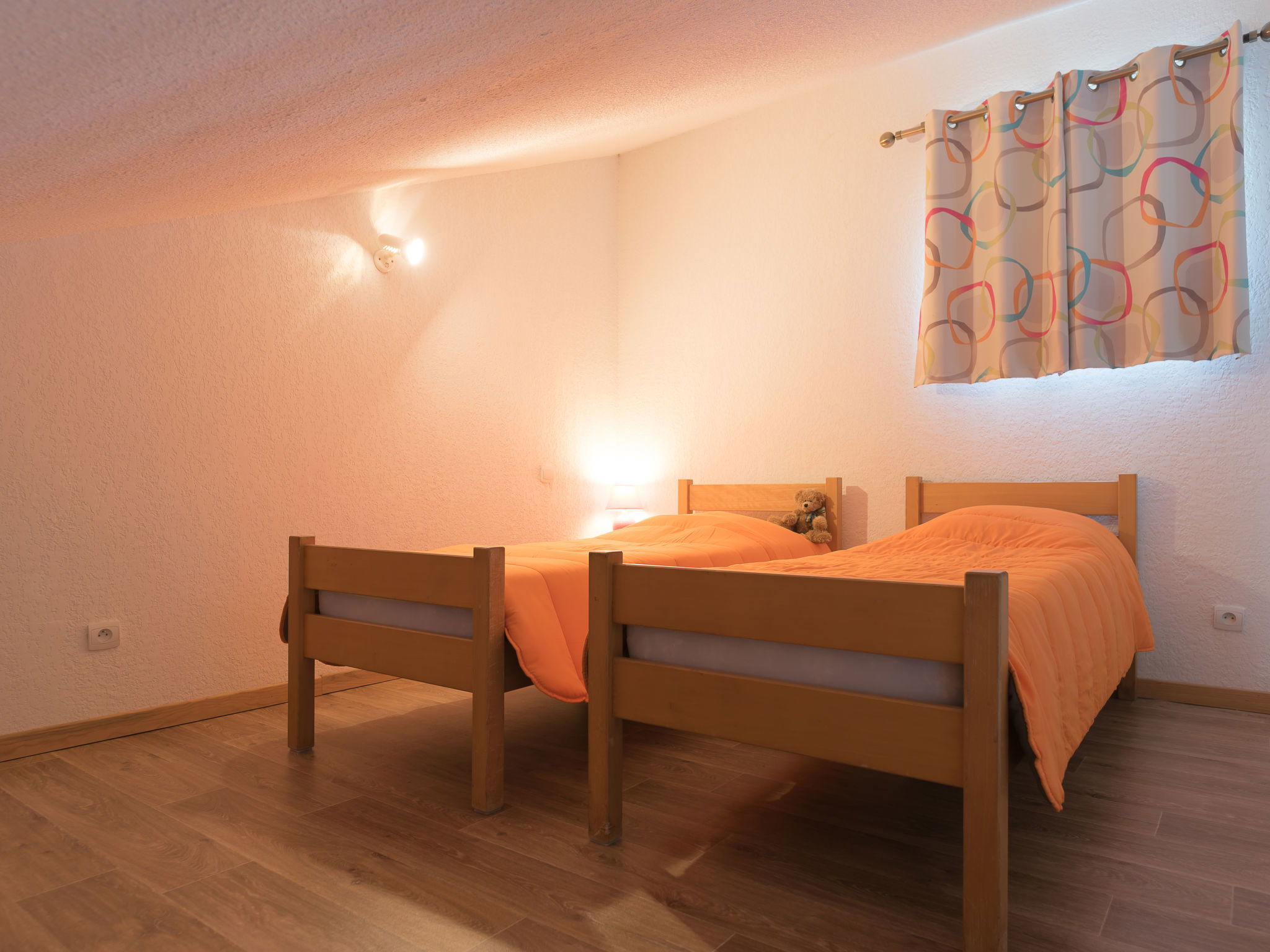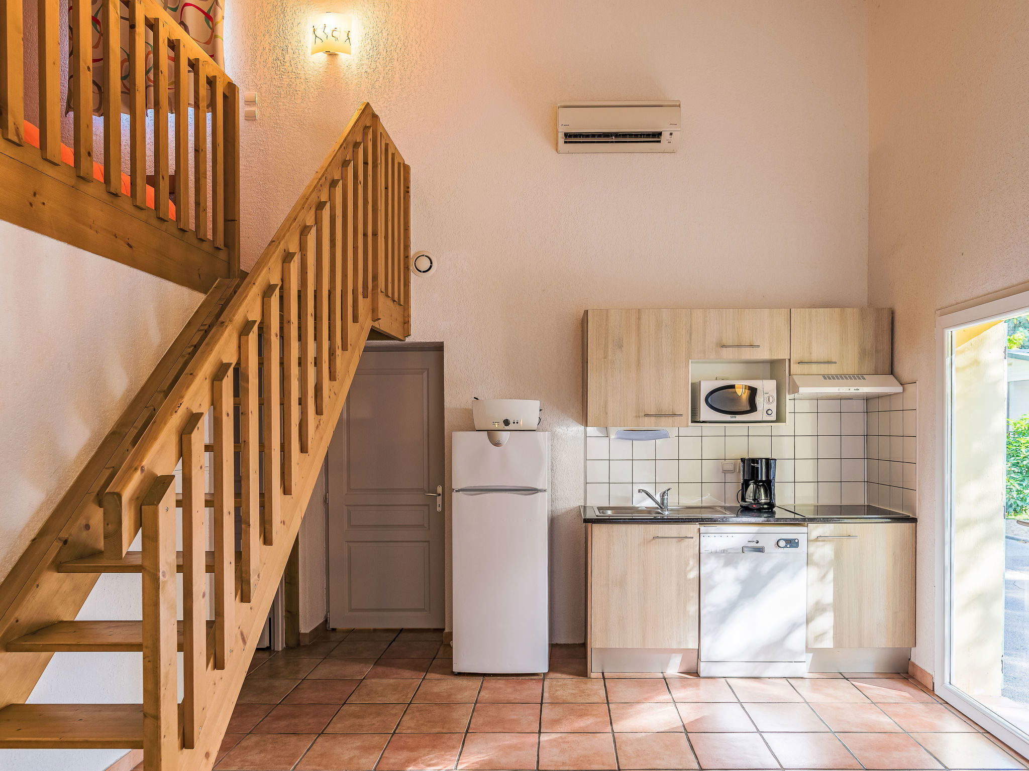 "Le Mediterranée", 3-room terraced house 56 m2 on 2 levels. Practical furnishings: living/sleeping room with 1 double sofabed, dining table and satellite TV (flat screen), air conditioning. Exit to the terrace. 1 room with 1 french bed (160 cm, length 200 cm). 1 room with 2 beds (80 cm, length 190 cm). Kitchenette (4 hot plates, dishwasher, toaster, kettle, microwave, freezer, electric coffee machine). Shower, sep. WC. Upper floor: (steep stair) gallery with sloping ceilings with 2 beds (80 cm, length 190 cm). Electric heating, forced-air heating. Terrace partly roofed. Terrace furniture, deck chairs (2). Facilities: children's high chair, baby cot for up to 2 year olds (extra). Internet (WiFi, extra). Please note: maximum 1 pet/ dog allowed. Smoke alarm. Instead of an enclosed bedroom, some sleeping areas are located in an open-plan area (gallery, alcove, etc.).