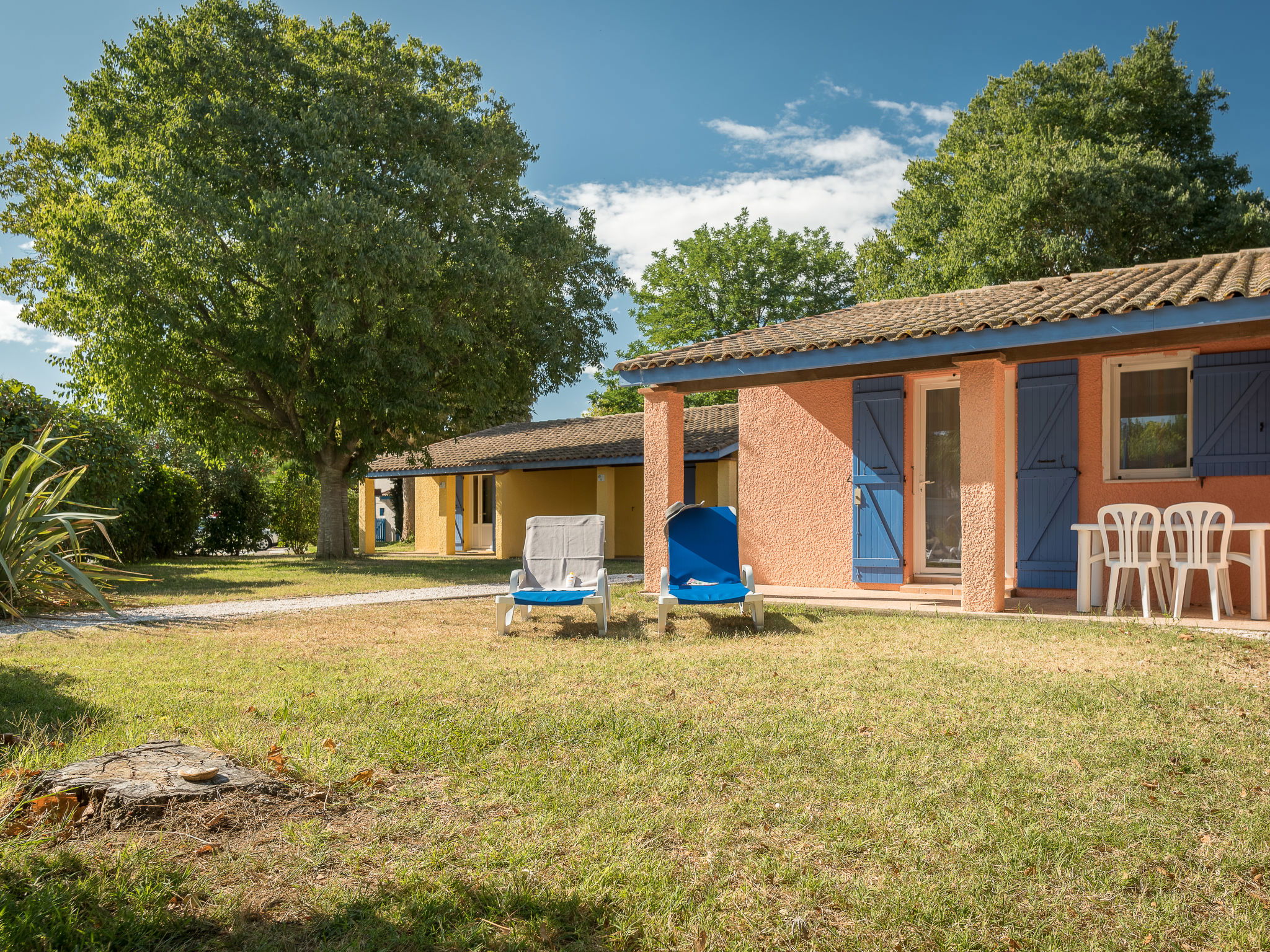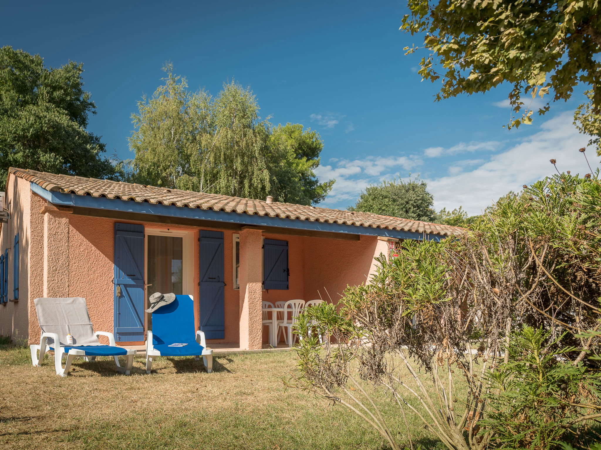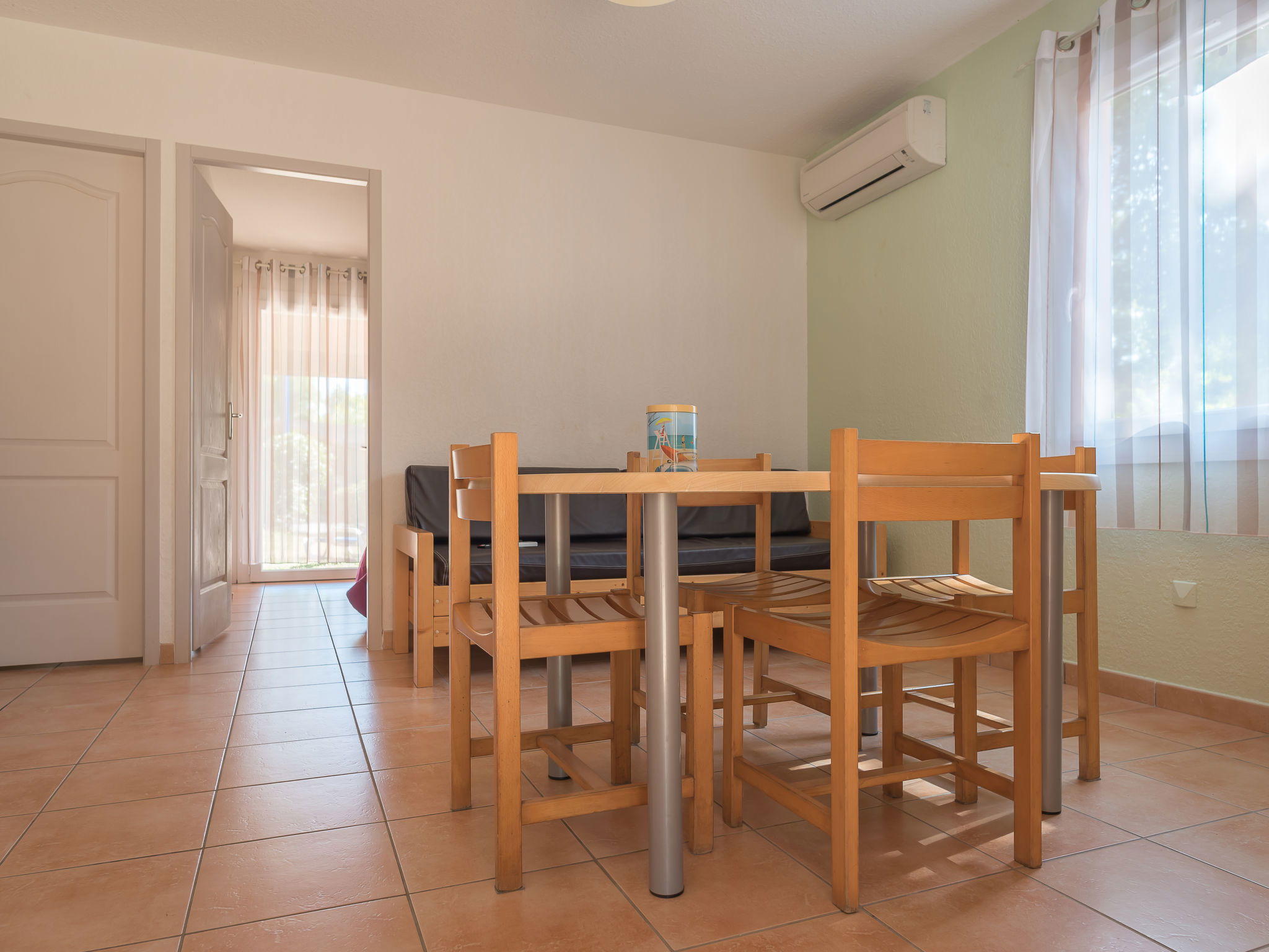 "Le Mediterranée", 3-room terraced house 39 m2. Practical furnishings: living/sleeping room with 1 double sofabed, dining table and satellite TV (flat screen), air conditioning. Exit to the terrace. 1 room with 1 french bed (160 cm, length 200 cm). 1 room with 2 beds (80 cm, length 190 cm). Kitchenette (2 hot plates, dishwasher, toaster, kettle, microwave, freezer, electric coffee machine). Shower, sep. WC. Electric heating, forced-air heating. Terrace partly roofed. Terrace furniture, deck chairs (2). Facilities: children's high chair, baby cot for up to 2 year olds (extra). Internet (WiFi, extra). Please note: maximum 1 pet/ dog allowed. Smoke alarm.