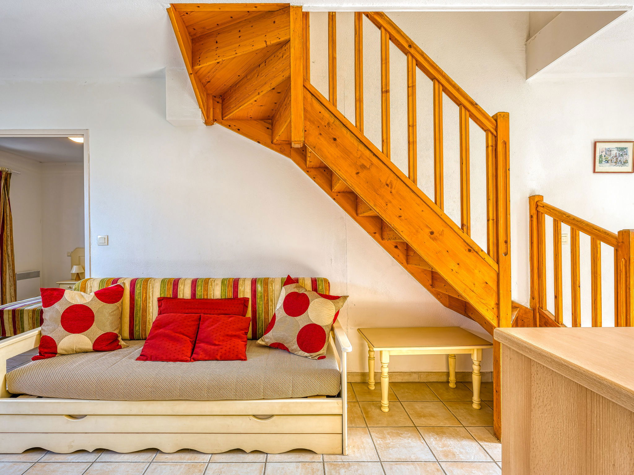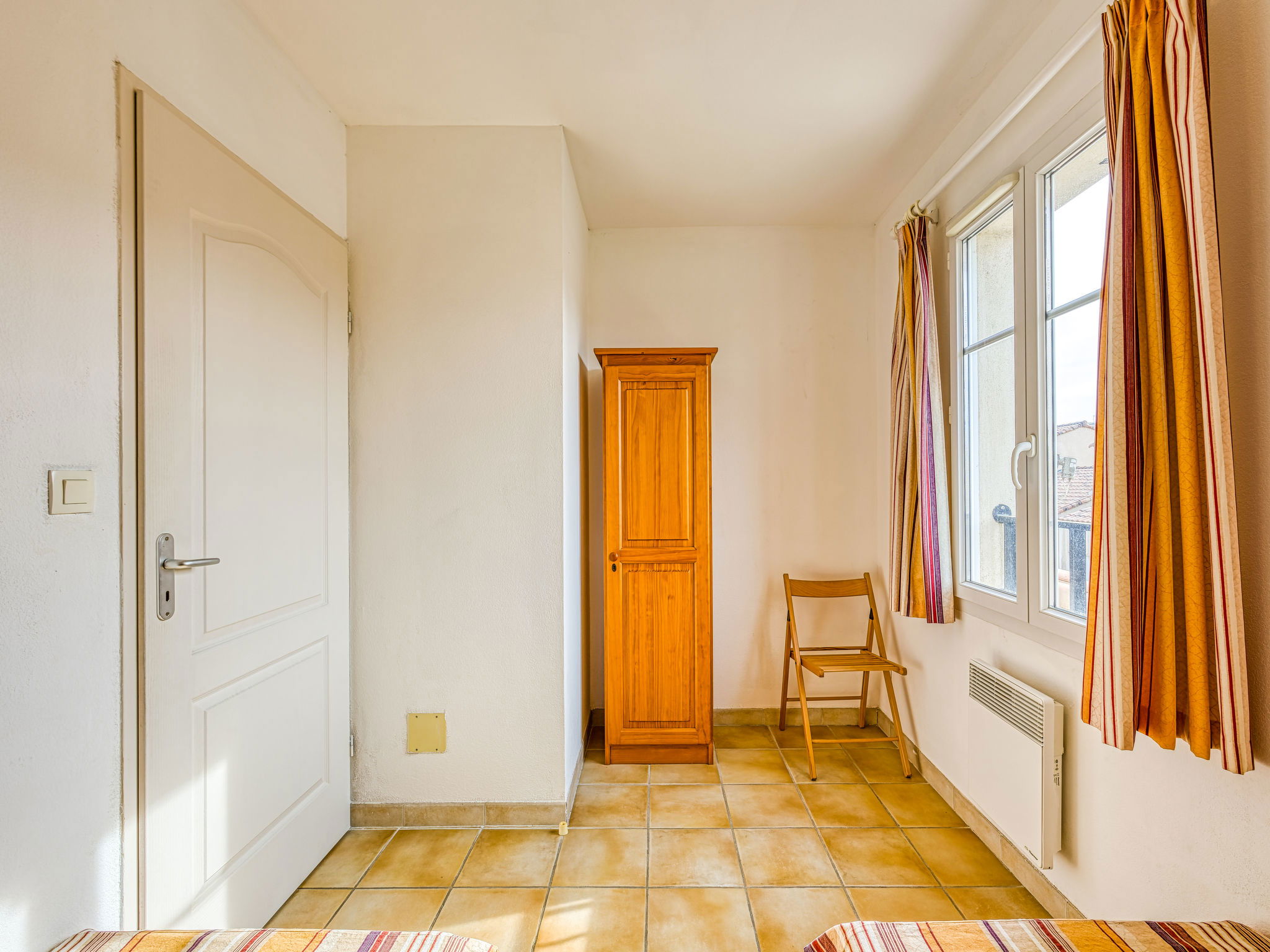 4-room terraced house 60 m2 on 2 levels. Beautiful furnishings: living/dining room with TV (flat screen). Exit to the terrace. 1 room with 1 french bed (140 cm), shower/WC. Exit to the terrace. Open kitchen (oven, dishwasher, 4 ceramic glass hob hotplates, microwave, freezer) with bar. Upper floor: 1 room with 2 beds (90 cm). 1 room with 1 french bed (140 cm). Bathroom, sep. WC. Electric heating. Terrace 18 m2, west facing position. Terrace furniture. Facilities: washing machine. Internet (WiFi, extra). Parking (fenced). Please note: maximum 1 pet/ dog allowed. Smoke alarm. Offer by a private individual according to Art. 155, IV of CGI.