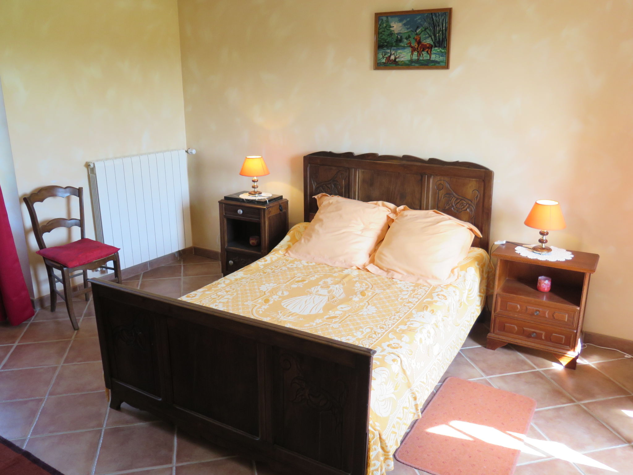 "Le Mas de Serre", 3-room house 115 m2, on the upper ground floor. Object suitable for 5 adults. Rustic and antique furnishings: living/dining room with open-hearth fireplace, dining table and satellite TV (flat screen). Exit to the terrace. 1 room with 1 bed (120 cm, length 190 cm), 1 french bed (140 cm, length 190 cm). 1 room, on 2 levels with 1 bed (110 cm, length 190 cm), 1 french bed (140 cm, length 190 cm). Open kitchen (oven, dishwasher, 4 gas rings, toaster, kettle, microwave, freezer, electric coffee machine) with bar, dining table. Bathroom, sep. WC. Oil heating. Wooden floors. Terrace. Terrace furniture, barbecue (portable), deck chairs, covered balcony. Beautiful view of the countryside. Facilities: washing machine, children's high chair, baby cot, logs (free). Please note: non-smoking house. Maximum 2 pets/ dogs allowed. Smoke alarm. Bed layout is flexible. There are more sleeping options available than the maximum number of people allowed which may, however, not be exceeded.