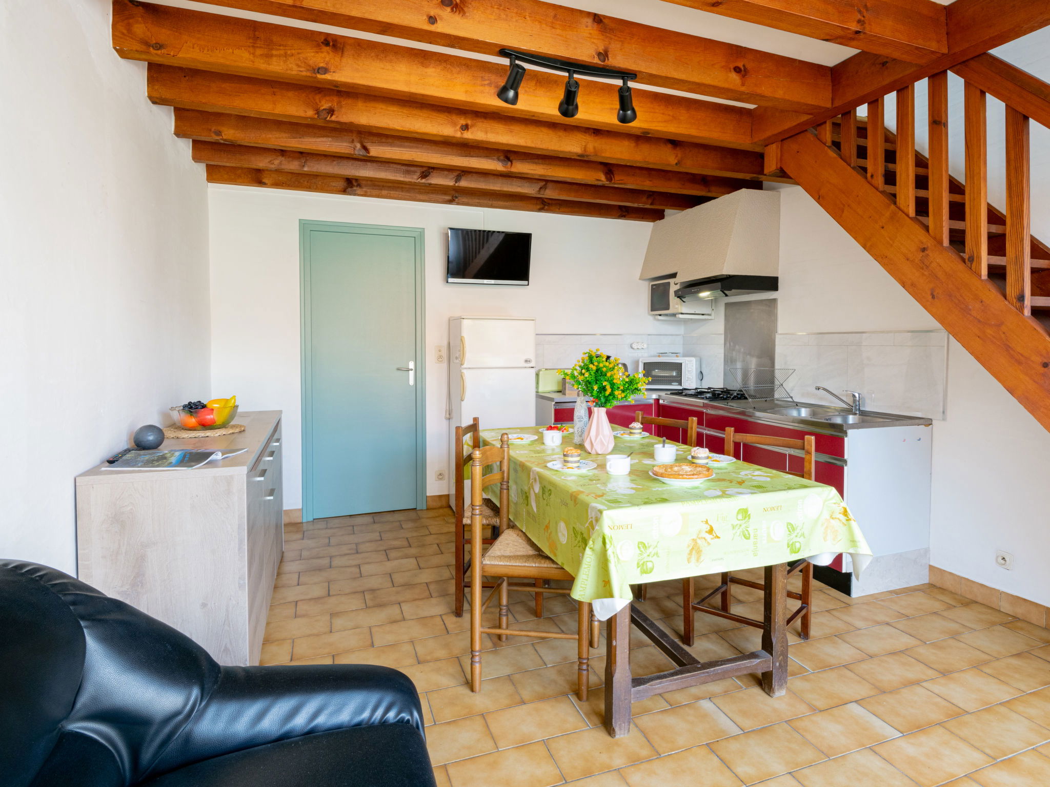 3-room terraced house 50 m2 on 2 levels. Simple furnishings: living/dining room with TV and international TV channels (flat screen). Exit to the terrace. Kitchenette (4 hot plates, mini-oven, 4 gas rings, toaster, kettle, microwave, electric coffee machine, Capsules for coffee machine (filtre) extra). Shower, sep. WC. Heating not available in all rooms. Upper floor: 1 room with sloping ceilings with 2 beds (90 cm, length 190 cm). 1 room with sloping ceilings with 1 bed (90 cm, length 190 cm), 1 french bed (1 x 140 cm, length 190 cm). Terrace. Terrace furniture, deck chairs (1). Facilities: Internet (WiFi, free). Please note: maximum 1 pet/ dog allowed. Smoke alarm.